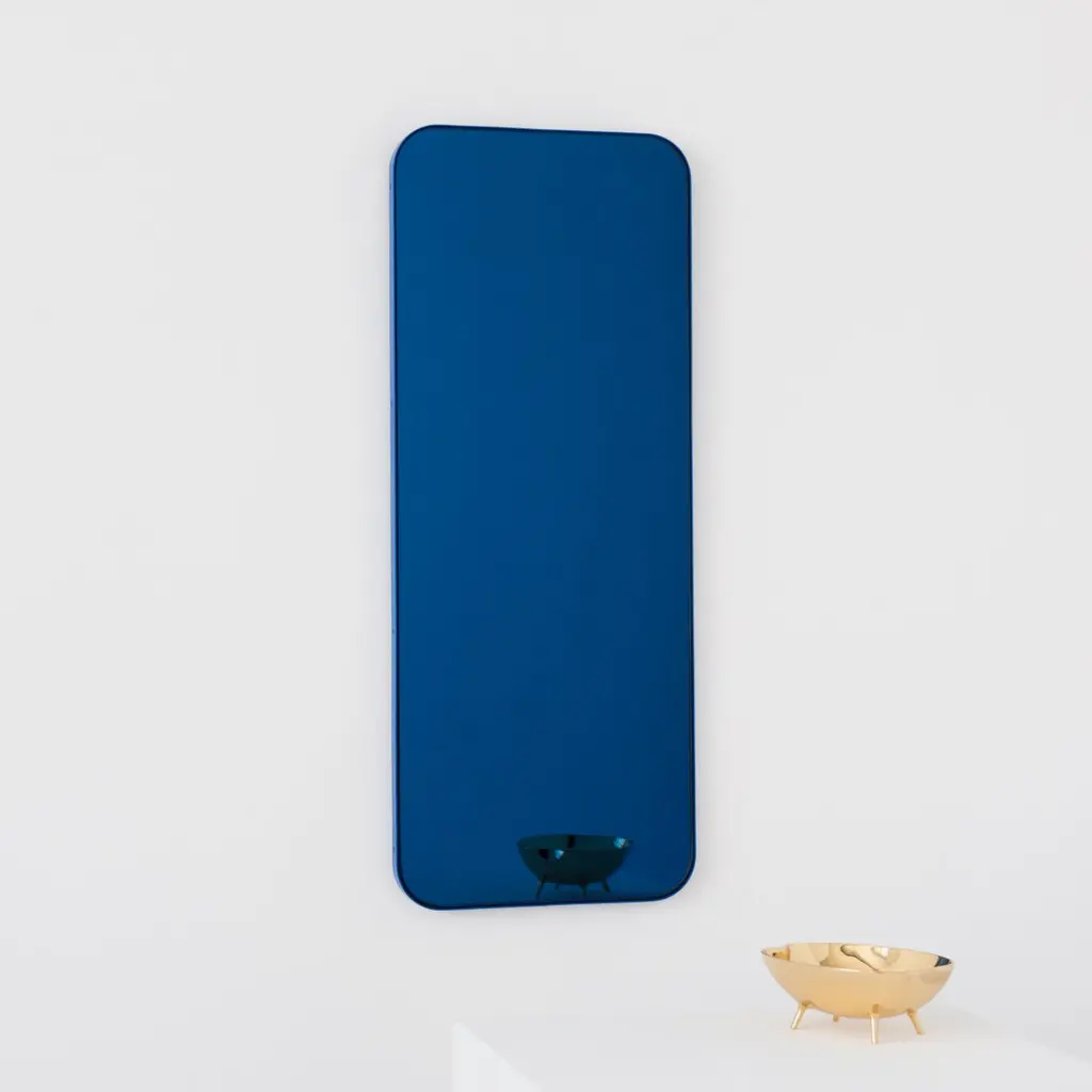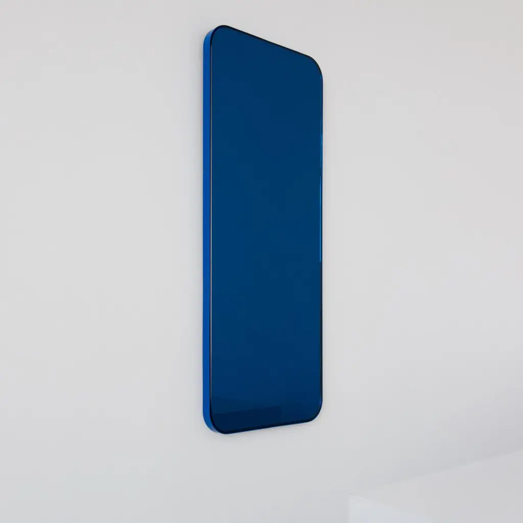Modern rectangular mirror with an elegant blue frame. Part of the charming Quadris™ collection, designed and handcrafted in London, UK. Our mirrors are designed with an integrated French cleat (split batten) system that ensures the mirror is securely mounted flush with the wall. An alternative hanging hook or a Z-bar (depending on the size of the mirror) is available on demand for mirrors that need to be installed allowing some separation from the wall.This mirror is fully customisable.The mirror in the images illustrates a small size, measuring 27cm x 68cm x 1.8cm / 10.6in x 26.8in x 0.71inShipped safely and insured worldwide. All our mirrors are made on demand. Fabrication lead time for this particular mirror is approximately 4 to 5 weeks. Our mirrors are always shipped by courier express. Shipping via courier express typically requires 1 to 2 days to the UK, or 2 to 7 days outside the UK depending on the destination.Available in the following sizes:Small: 27cm x 68cm x 1.8cm / 10.6'' x 26.8'' x 0.71’’Medium: 37cm x 56cm x 1.8cm / 14.6'' x 22" x 0.71’’Large: 46cm x 71cm x 1.8cm / 18.1'' x 28" x 0.71’’Extra Large: 48cm x 97cm x 1.8cm / 18.9" x 38.2" x 0.71’’or any bespoke dimensions.Available options:- frame depth: 18mm / 0.71’’, 24mm / 0.94’’ and 30mm / 1.18’’- frame finish: brass (brushed, polished or with a bronze patina), copper, stainless steel, blackened stainless steel, or in a variety of colours- mirror tint: silver, bronze, black, rose gold / peach, blue or green- bevelling- back-illumination creating a halo effect- demister padPlease contact us for a quote for any bespoke specification or added options.ORDERS OF MULTIPLE MIRRORS OF THE SAME TYPE: Please contact us to receive a Packing and Shipping quote when ordering multiple mirrors of the same type. An order for multiple mirrors of the same type may not be accepted without extra packing and shipping fees. Thank you.