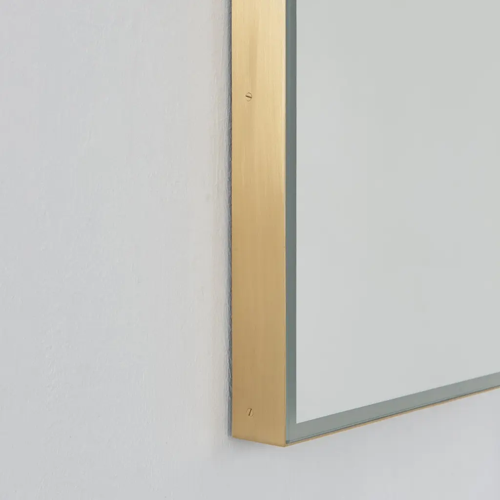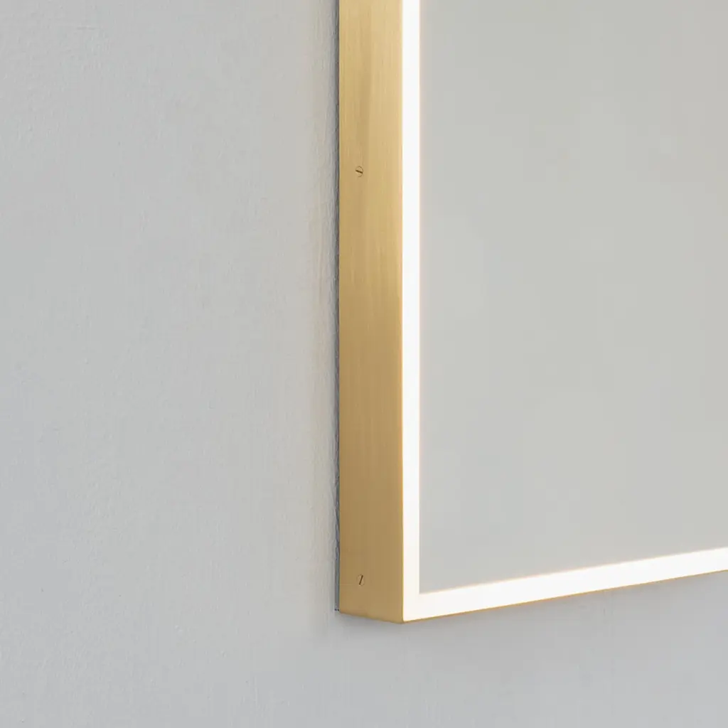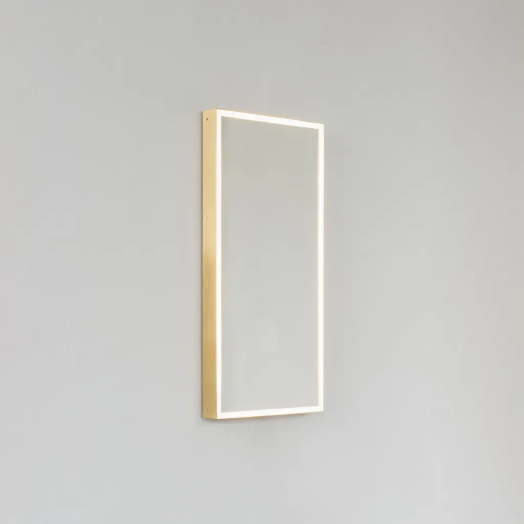 Timeless front illuminated Quadris™ rectangular mirror with square corners and a solid brass frame. Designed and handcrafted in London, UK. This mirror is fully customisable to suit the specific requirements of each interior.Standard Illumination. The mirror features warm white LED lighting with a colour temperature of 2800–3300K and a power consumption of 14.4W per meter. It has an IP67 rating.Driver. A non-dimmable driver compatible with local voltage is supplied as standard. Alternative drivers — including dimmable versions or different colour temperature options — are available upon request.Fitted with an integrated French cleat (split batten) system that ensures the mirror is securely mounted flush with the wall.Shipped safely and insured worldwide. All our mirrors are made on demand. Fabrication lead time for this particular mirror is approximately 4 to 5 weeks. Our mirrors are always shipped by courier express. Shipping via courier express typically requires 1 to 2 days to the UK, or 2 to 7 days outside the UK depending on the destination.The mirror in the images illustrates a small size, measuring 27cm x 68cm x 1.8cm / 10.6in x 26.8in x 0.71inAvailable in the following sizes:Small: 27cm x 68cm x 3cm / 10.6'' x 26.8'' x 1.18''Medium: 37cm x 56cm x 3cm / 14.6'' x 22'' x 1.18''Large: 46cm x 71cm x 3cm / 18.1'' x 28'' x 1.18''Extra Large: 48cm x 97cm x 3cm / 18.9'' x 38.2'' x 1.18''or any bespoke dimensions.Available options:- frame finishes: brass (brushed, polished or with a bronze patina), copper, stainless steel, blackened metal, powder coated aluminium in a range of standard or bespoke colours- full frame that extends to the front of the mirror- mirror tints: standard silver, black, bronze, blue, rose gold / peach- back-illumination creating a halo effect- ON/OFF sensor switch- dimmable driver- demister pad- bevelPlease contact us for a quote or any bespoke specifications.ORDERS OF MULTIPLE MIRRORS OF THE SAME TYPE: Please contact us to receive a Packing and Shipping quote when ordering multiple mirrors of the same type. An order for multiple mirrors of the same type may not be accepted without extra packing and shipping fees. Thank you.
