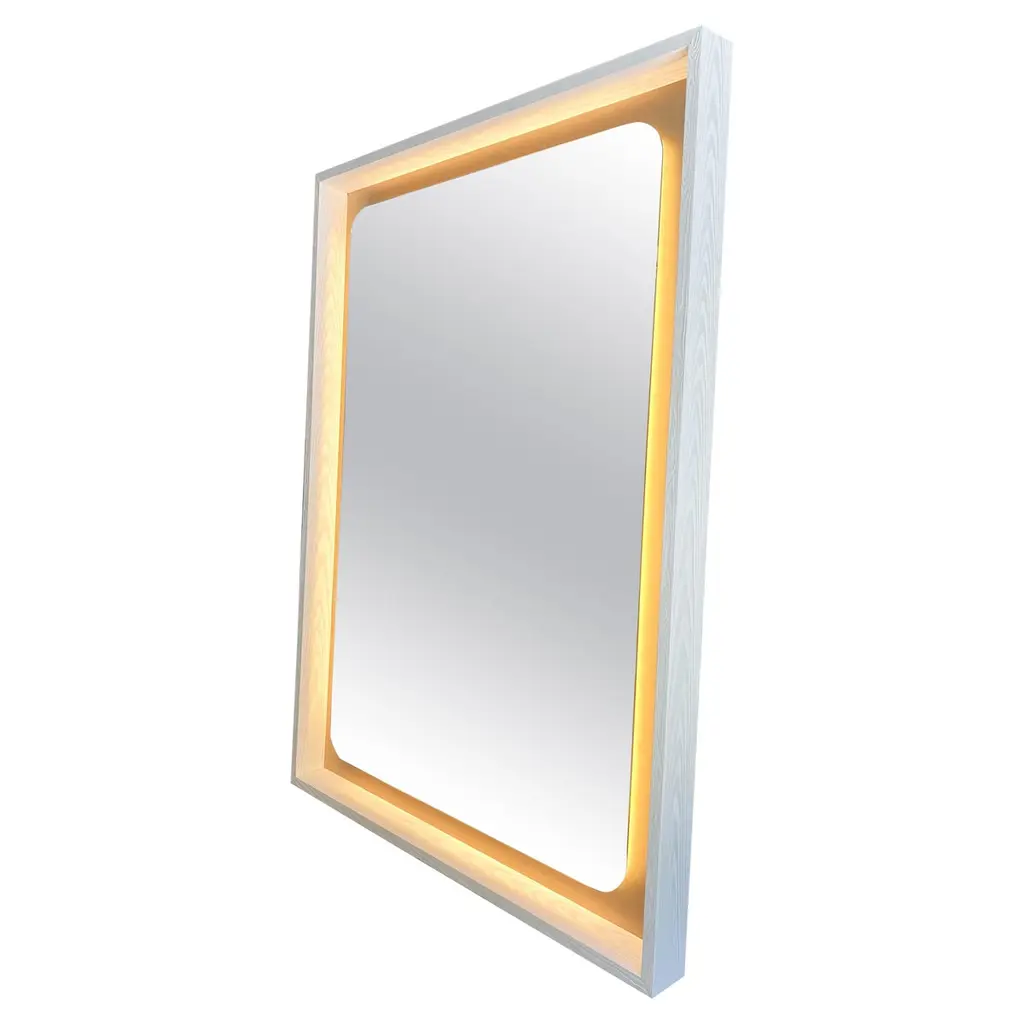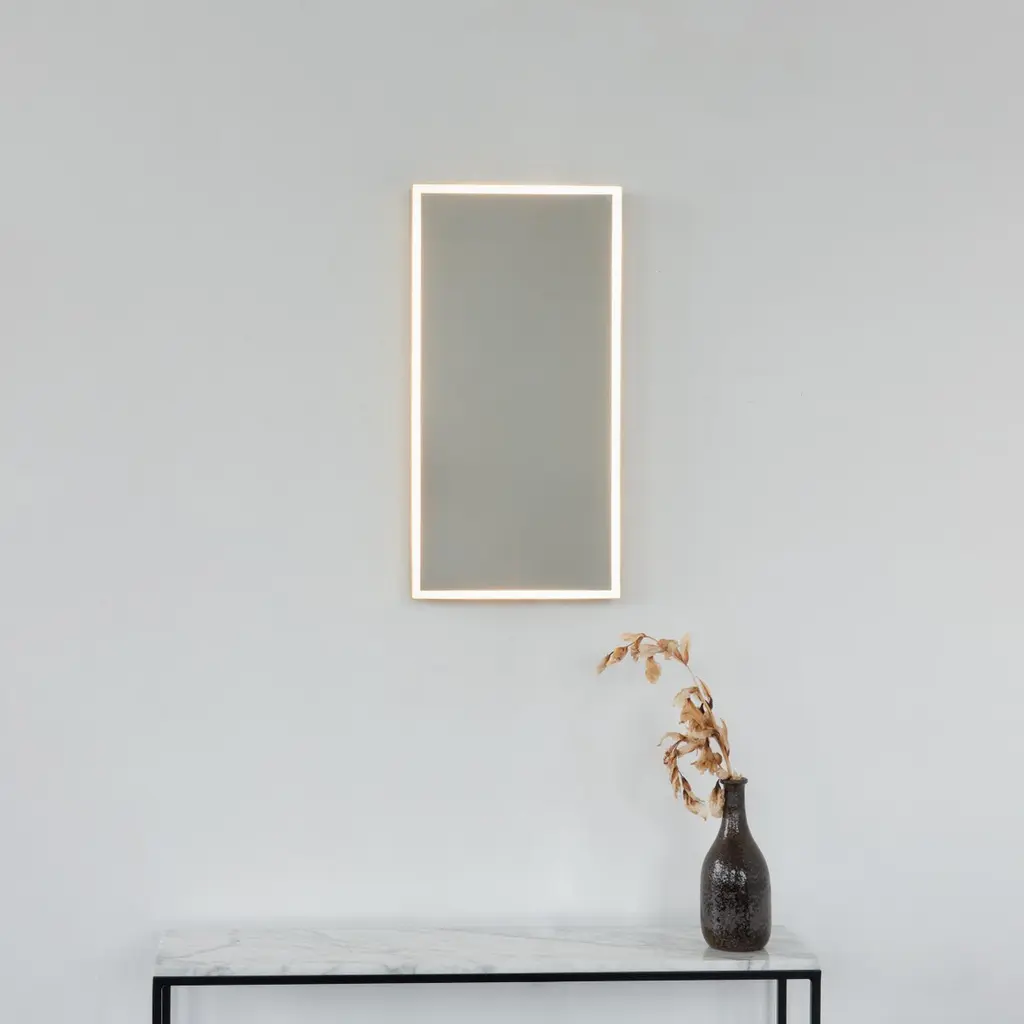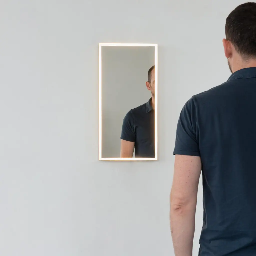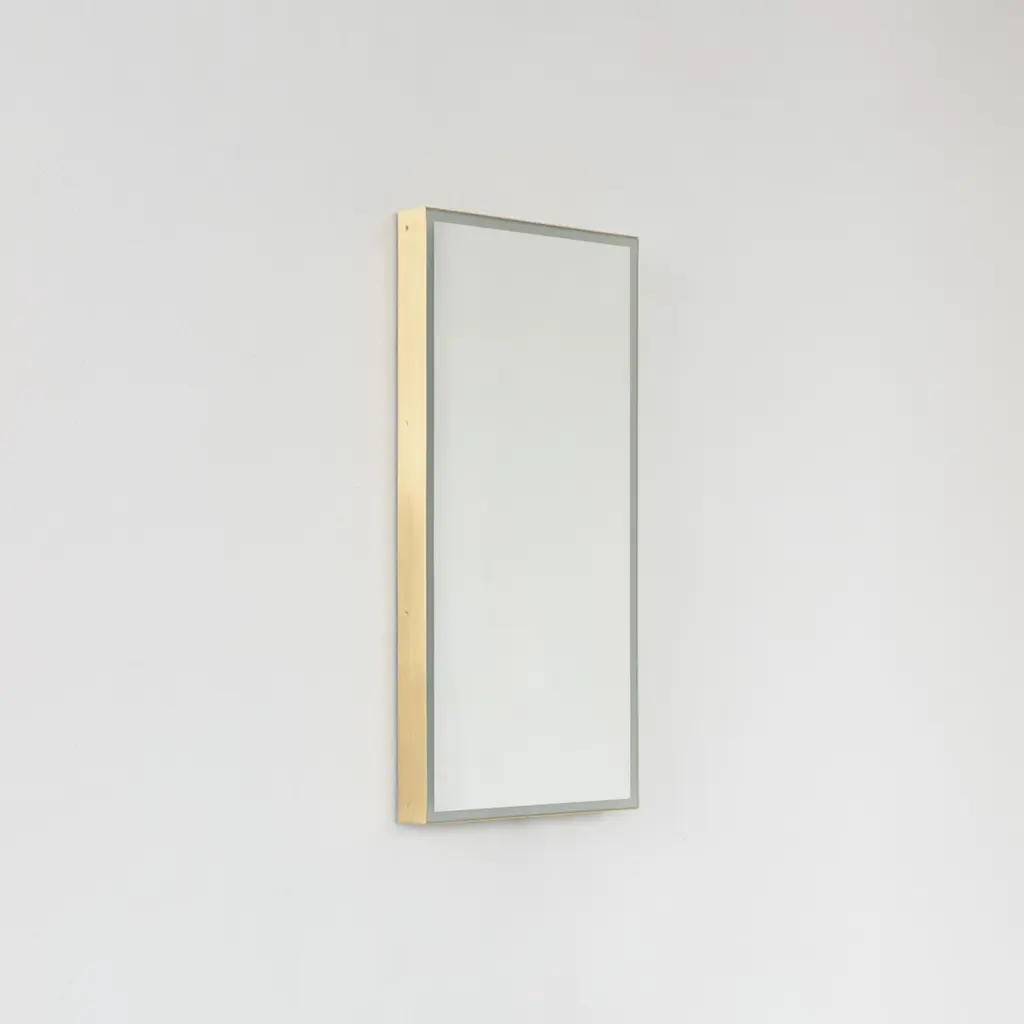 Timeless front illuminated Quadris™ rectangular mirror with square corners and a solid brass frame. Designed and handcrafted in London, UK. This mirror is fully customisable to suit the specific requirements of each interior.Standard Illumination. The mirror features warm white LED lighting with a colour temperature of 2800–3300K and a power consumption of 14.4W per meter. It has an IP67 rating.Driver. A non-dimmable driver compatible with local voltage is supplied as standard. Alternative drivers — including dimmable versions or different colour temperature options — are available upon request.Fitted with an integrated French cleat (split batten) system that ensures the mirror is securely mounted flush with the wall.Shipped safely and insured worldwide. All our mirrors are made on demand. Fabrication lead time for this particular mirror is approximately 4 to 5 weeks. Our mirrors are always shipped by courier express. Shipping via courier express typically requires 1 to 2 days to the UK, or 2 to 7 days outside the UK depending on the destination.The mirror in the images illustrates a small size, measuring 27cm x 68cm x 1.8cm / 10.6in x 26.8in x 0.71inAvailable in the following sizes:Small: 27cm x 68cm x 3cm / 10.6'' x 26.8'' x 1.18''Medium: 37cm x 56cm x 3cm / 14.6'' x 22'' x 1.18''Large: 46cm x 71cm x 3cm / 18.1'' x 28'' x 1.18''Extra Large: 48cm x 97cm x 3cm / 18.9'' x 38.2'' x 1.18''or any bespoke dimensions.Available options:- frame finishes: brass (brushed, polished or with a bronze patina), copper, stainless steel, blackened metal, powder coated aluminium in a range of standard or bespoke colours- full frame that extends to the front of the mirror- mirror tints: standard silver, black, bronze, blue, rose gold / peach- back-illumination creating a halo effect- ON/OFF sensor switch- dimmable driver- demister pad- bevelPlease contact us for a quote or any bespoke specifications.ORDERS OF MULTIPLE MIRRORS OF THE SAME TYPE: Please contact us to receive a Packing and Shipping quote when ordering multiple mirrors of the same type. An order for multiple mirrors of the same type may not be accepted without extra packing and shipping fees. Thank you.