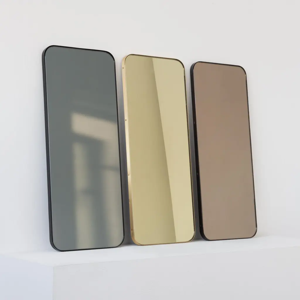 Modern rectangular mirror with an elegant bronze patina brass frame. Part of the charming Quadris™ collection, designed and handcrafted in London, UK. Our mirrors are designed with an integrated French cleat (split batten) system that ensures the mirror is securely mounted flush with the wall. An alternative hanging hook or a Z-bar (depending on the size of the mirror) is available on demand for mirrors that need to be installed allowing some separation from the wall.The Neska™ signature bronze patina finish of our frames is a highly skilled and handcrafted process. Carried out by our talented craftsmen, this artistic finish is created from the base metal itself to achieve the natural look of aged brass. This makes the finish of each frame original and unique as no two frames can be identical. Any sample or images provided to obtain your approval on the desired finish or on our website or any other promotional material are therefore for guidance only.This mirror is fully customisable.The mirror in the images illustrates a small size, measuring 27cm x 68cm x 1.8cm / 10.6in x 26.8in x 0.71inShipped safely and insured worldwide. All our mirrors are made on demand. Fabrication lead time for this particular mirror is approximately 4 to 5 weeks. Our mirrors are always shipped by courier express. Shipping via courier express typically requires 1 to 2 days to the UK, or 2 to 7 days outside the UK depending on the destination.Available in the following sizes:Small: 27cm x 68cm x 1.8cm / 10.6'' x 26.8'' x 0.71’’Medium: 37cm x 56cm x 1.8cm / 14.6'' x 22" x 0.71’’Large: 46cm x 71cm x 1.8cm / 18.1'' x 28" x 0.71’’Extra Large: 48cm x 97cm x 1.8cm / 18.9" x 38.2" x 0.71’’or any bespoke dimensions.Available options:- frame depth: 18mm / 0.71’’, 24mm / 0.94’’ and 30mm / 1.18’’- frame finish: brass (brushed, polished or with a bronze patina), copper, stainless steel, blackened stainless steel, or in a variety of colours- mirror tint: silver, bronze, black, rose gold / peach, blue or green- bevelling- back-illumination creating a halo effect- demister padPlease contact us for a quote for any bespoke specification or added options.ORDERS OF MULTIPLE MIRRORS OF THE SAME TYPE: Please contact us to receive a Packing and Shipping quote when ordering multiple mirrors of the same type. An order for multiple mirrors of the same type may not be accepted without extra packing and shipping fees. Thank you.