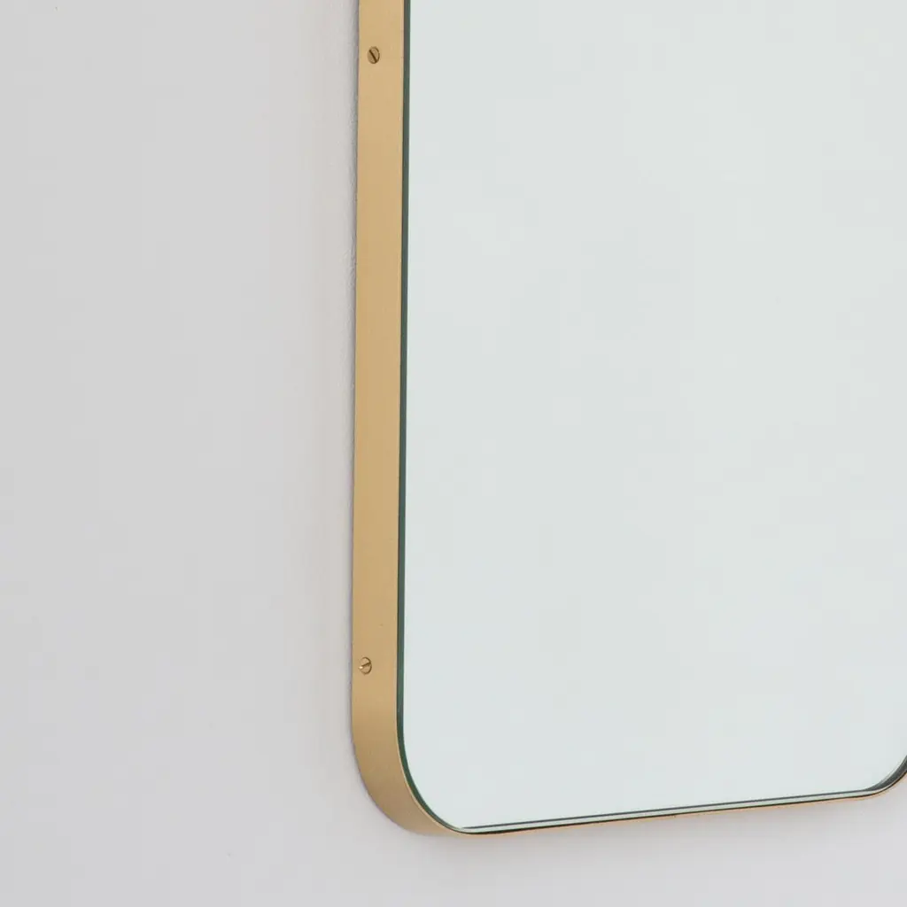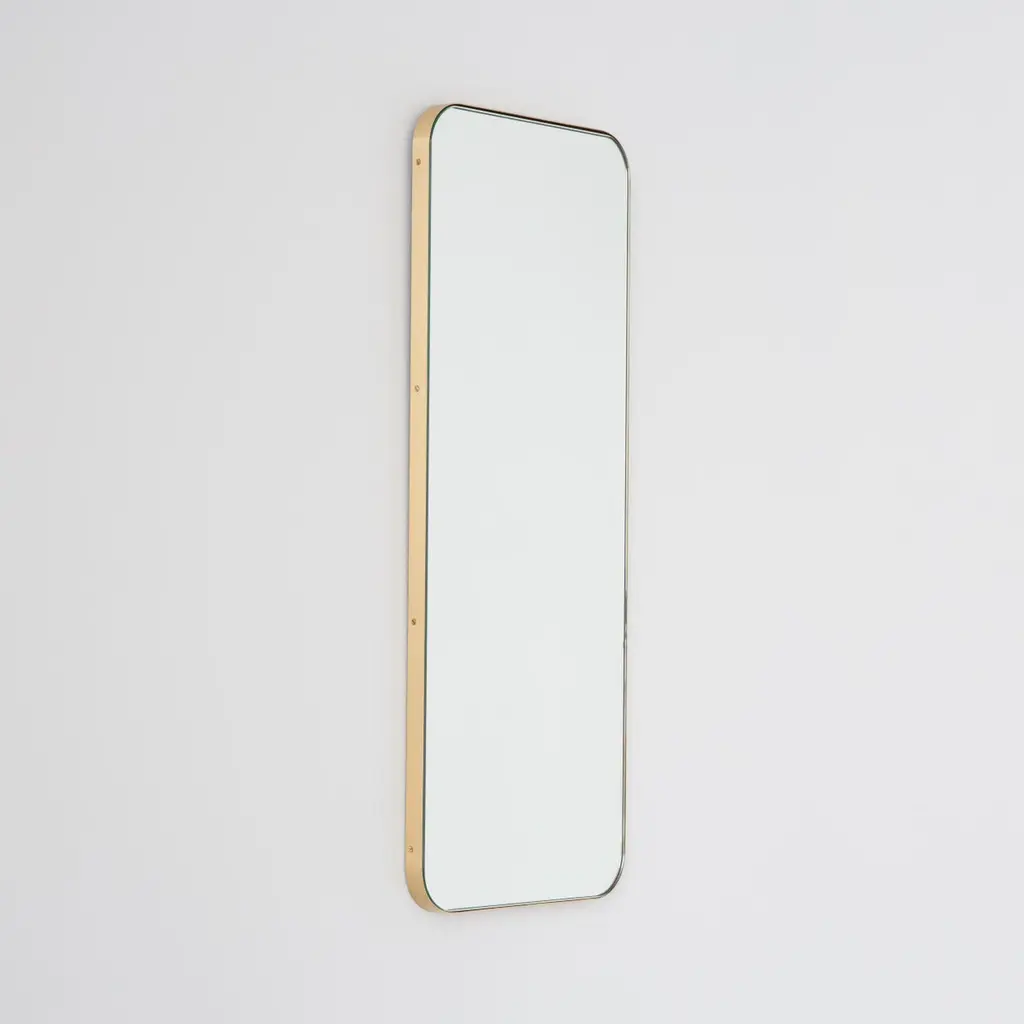 Modern Quadris™ rectangular mirror with an elegant solid brushed brass frame. Designed and handcrafted in London, UK. Our mirrors are designed with an integrated French cleat (split batten) system that ensures the mirror is securely mounted flush with the wall. An alternative hanging hook or a Z-bar (depending on the size of the mirror) is available on demand for mirrors that need to be installed allowing some separation from the wall.This mirror is fully customisable.The mirror in the images illustrates a small size, measuring 27cm x 68cm x 1.8cm / 10.6in x 26.8in x 0.71inShipped safely and insured worldwide. All our mirrors are made on demand. Fabrication lead time for this mirror is approximately 4 to 5 weeks. Our mirrors are always shipped by courier express. Shipping via courier express typically requires 1 to 2 days to the UK, or 2 to 7 days outside the UK depending on the destination.Available in the following sizes:Small: 27cm x 68cm x 1.8cm / 10.6'' x 26.8'' x 0.71’’Medium: 37cm x 56cm x 1.8cm / 14.6'' x 22" x 0.71’’Large: 46cm x 71cm x 1.8cm / 18.1'' x 28" x 0.71’’Extra Large: 48cm x 97cm x 1.8cm / 18.9" x 38.2" x 0.71’’or any bespoke dimensions.Available options:- frame depth: 18mm / 0.71’’, 24mm / 0.94’’ and 30mm / 1.18’’- frame finish: brass (brushed, polished or with a bronze patina), copper, stainless steel, blackened stainless steel, or in a variety of colours- mirror tint: silver, bronze, black, rose gold / peach, blue or green- bevelling- back-illumination creating a halo effect- demister padPlease contact us for a quote for any bespoke specification or added options.ORDERS OF MULTIPLE MIRRORS OF THE SAME TYPE: Please contact us to receive a Packing and Shipping quote when ordering multiple mirrors of the same type. An order for multiple mirrors of the same type may not be accepted without extra packing and shipping fees. Thank you.
