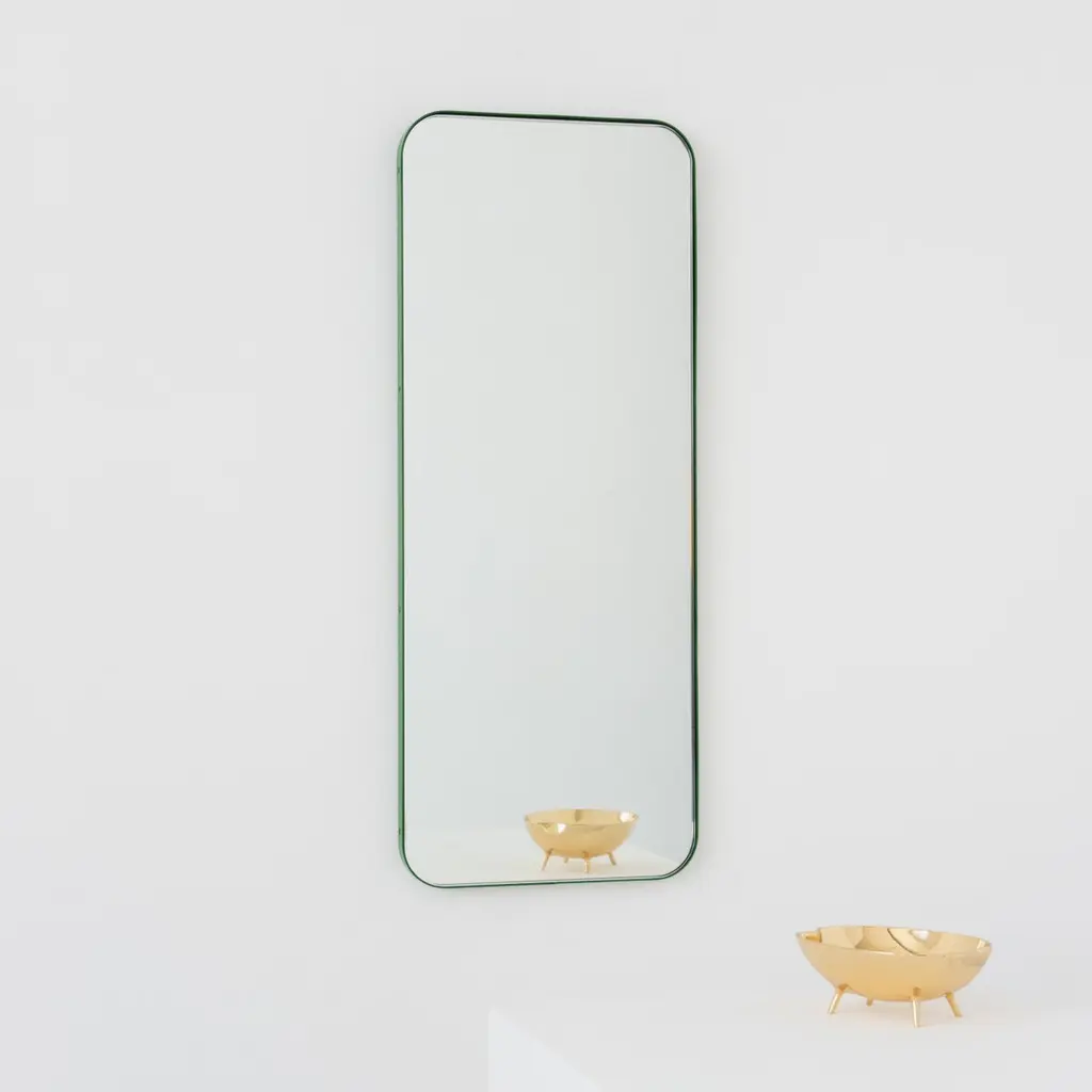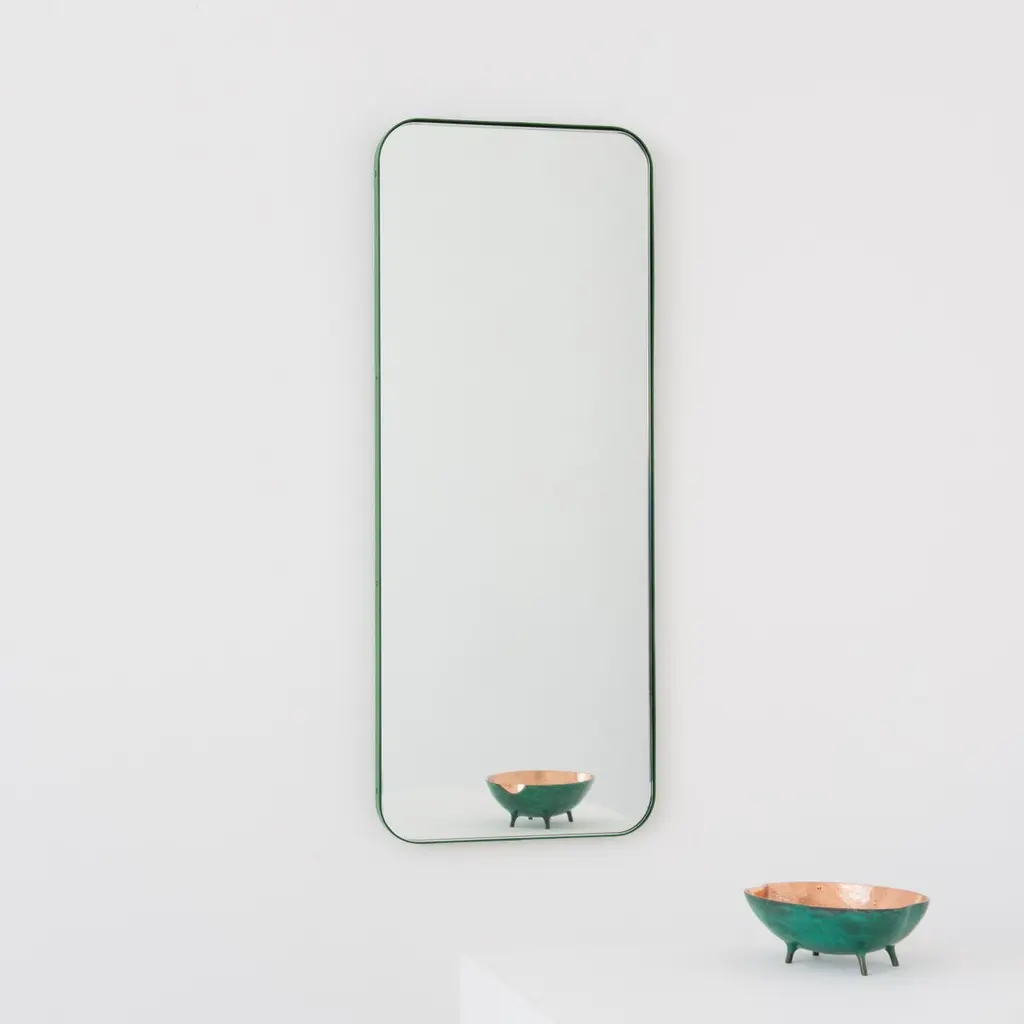 Minimalist round mirror with a modern aluminium powder coated green frame. Designed and handcrafted in London, UK.Our mirrors are designed with an integrated French cleat (split batten) system that ensures the mirror is securely mounted flush with the wall. An alternative hanging hook or a Z-bar (depending on the size of the mirror) is available on demand for mirrors that need to be installed allowing some separation from the wall.This mirror is fully customisable.The mirror in the images illustrates a small size, measuring 27cm x 68cm x 1.8cm / 10.6in x 26.8in x 0.71inShipped safely and insured worldwide. All our mirrors are made on demand. Fabrication lead time for this mirror is approximately 4 to 5 weeks. Our mirrors are always shipped by courier express. Shipping via courier express typically requires 1 to 2 days to the UK, or 2 to 7 days outside the UK depending on the destination.Available in the following sizes:Small: 27cm x 68cm x 1.8cm / 10.6'' x 26.8'' x 0.71’’Medium: 37cm x 56cm x 1.8cm / 14.6'' x 22" x 0.71’’Large: 46cm x 71cm x 1.8cm / 18.1'' x 28" x 0.71’’Extra Large: 48cm x 97cm x 1.8cm / 18.9" x 38.2" x 0.71’’or any bespoke dimensions.Available options:- frame depth: 18mm / 0.71’’, 24mm / 0.94’’ and 30mm / 1.18’’- frame finish: brass (brushed, polished or with a bronze patina), copper, stainless steel, blackened stainless steel, or in a variety of colours- mirror tint: silver, bronze, black, rose gold / peach, blue or green- bevelling- back-illumination creating a halo effect- demister padPlease contact us for a quote for any bespoke specification or added options.ORDERS OF MULTIPLE MIRRORS OF THE SAME TYPE: Please contact us to receive a Packing and Shipping quote when ordering multiple mirrors of the same type. An order for multiple mirrors of the same type may not be accepted without extra packing and shipping fees. Thank you.