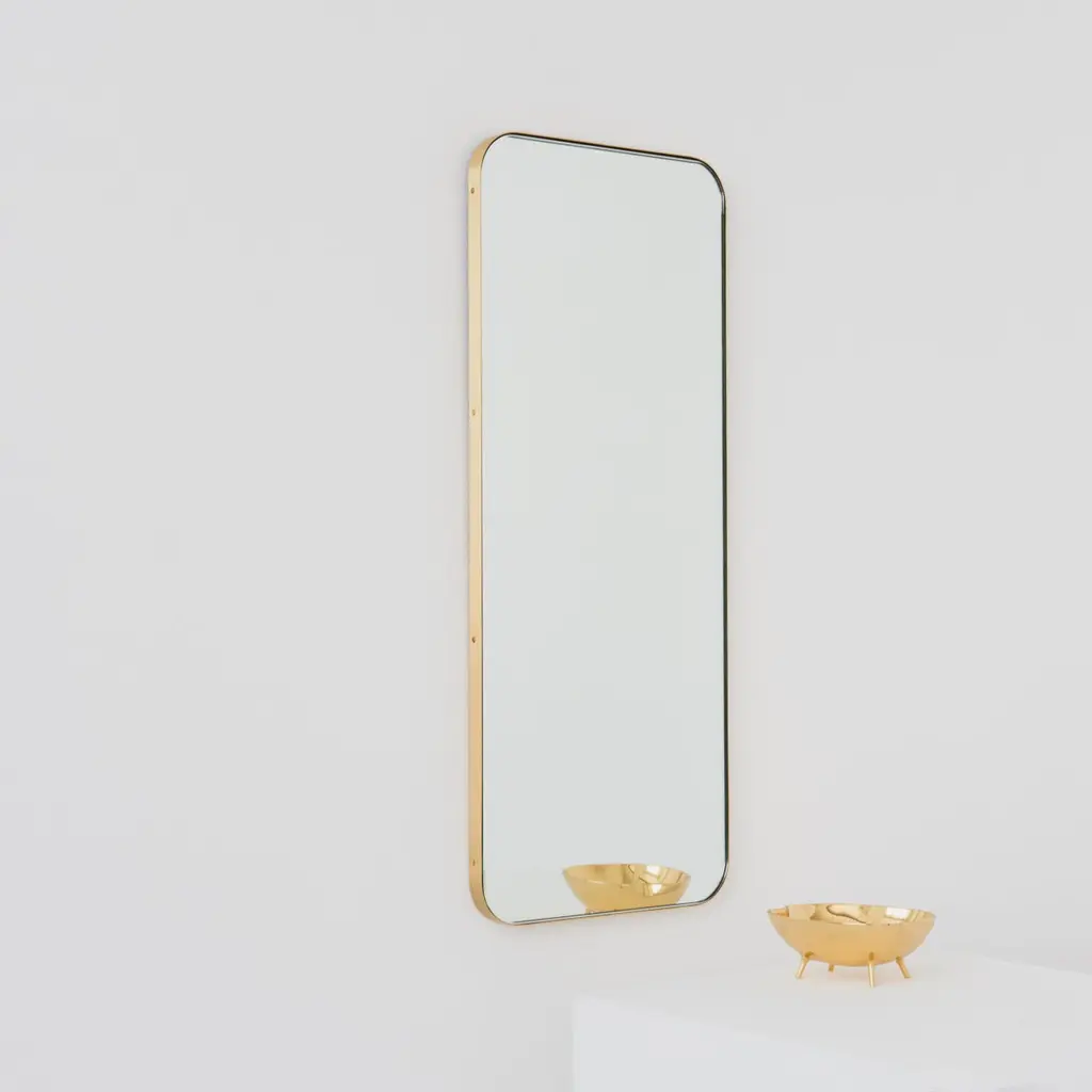 Modern Quadris™ rectangular mirror with an elegant solid brushed brass frame. Designed and made in London, UK. Our mirrors are designed with an integrated French cleat (split batten) system that ensures the mirror is securely mounted flush with the wall. An alternative hanging hook or a Z-bar (depending on the size of the mirror) is available on demand for mirrors that need to be installed allowing some separation from the wall.This mirror is fully customisable and shipped safely worldwide.Available in the following sizes:Small: 27cm x 68cm x 1.8cm / 10.6'' x 26.8'' x 0.71’’Medium: 37cm x 56cm x 1.8cm / 14.6'' x 22" x 0.71’’Large: 46cm x 71cm x 1.8cm / 18.1'' x 28" x 0.71’’Extra Large: 48cm x 97cm x 1.8cm / 18.9" x 38.2" x 0.71’’or any bespoke dimensions.Available options are:- mirror tint: silver, bronze, black, rose gold / peach, blue or green- frame finish: brass (brushed, polished or with a bronze patina), copper, stainless steel, blackened stainless steel, or in a variety of colours- bevelling- back-illumination creating a halo effect- demister pad.ORDERS OF MULTIPLE MIRRORS OF THE SAME TYPE: Please contact us to receive a Packing and Shipping quote when ordering multiple mirrors of the same type. An order for multiple mirrors of the same type may not be accepted without extra packing and shipping fees. Thank you.