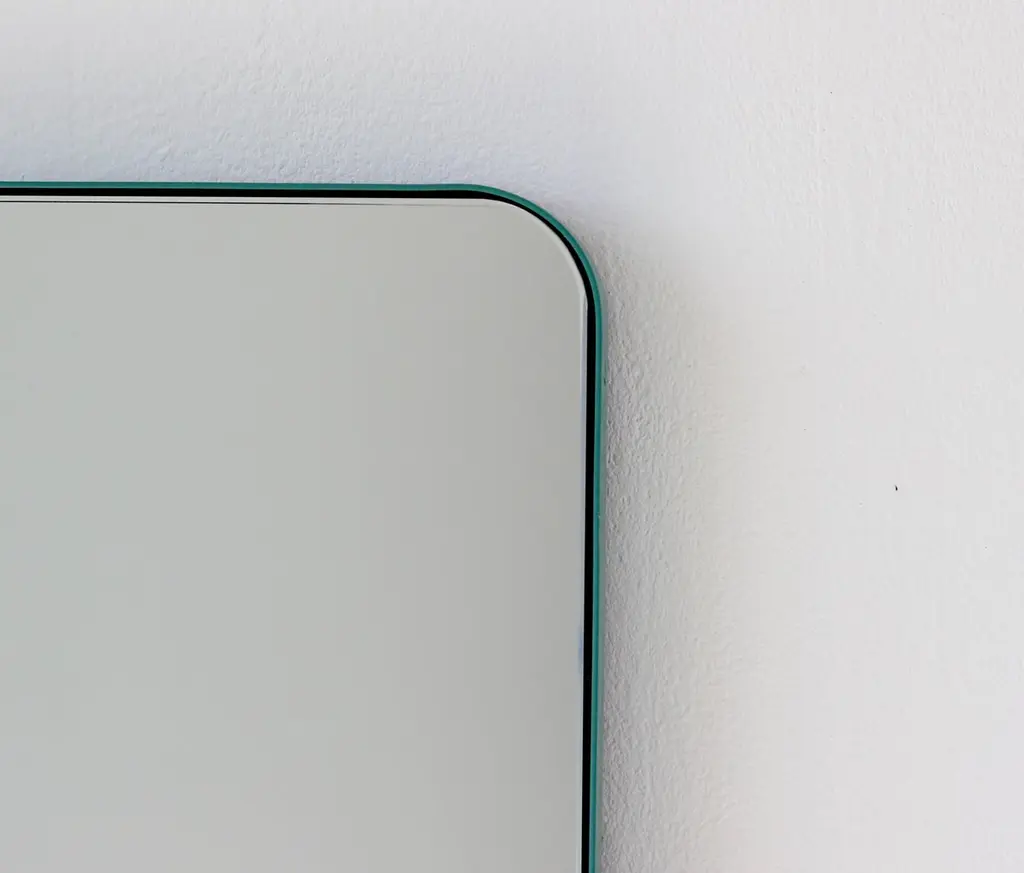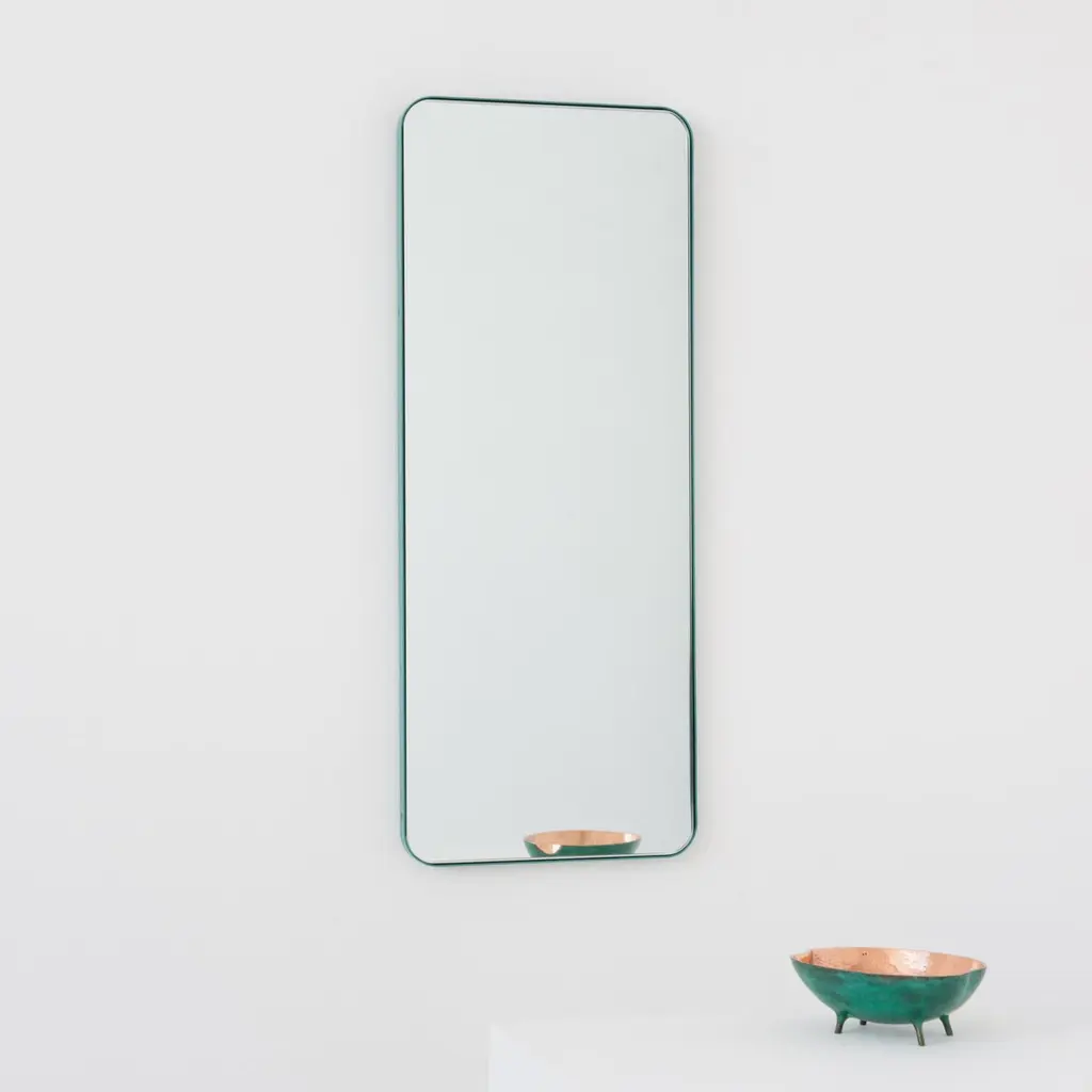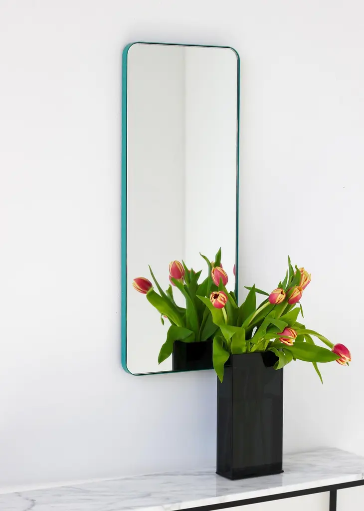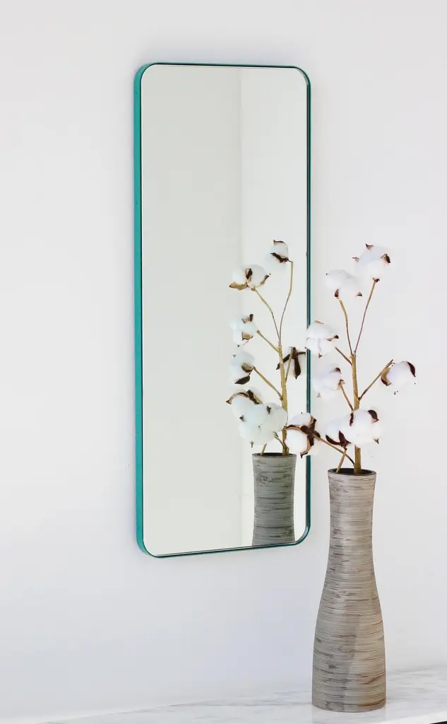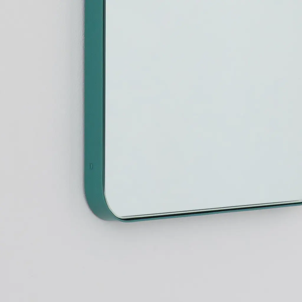 Modern rectangular mirror with an aluminium powder coated mint / turquoise frame. Part of the charming Quadris™ collection, designed and handcrafted in London, UK. Our mirrors are designed with an integrated French cleat (split batten) system that ensures the mirror is securely mounted flush with the wall. An alternative hanging hook or a Z-bar (depending on the size of the mirror) is available on demand for mirrors that need to be installed allowing some separation from the wall.This mirror is fully customisable.The mirror in the images illustrates a small size, measuring 27cm x 68cm x 1.8cm / 10.6in x 26.8in x 0.71inShipped safely and insured worldwide. All our mirrors are made on demand. Fabrication lead time for this particular mirror is approximately 4 to 5 weeks. Our mirrors are always shipped by courier express. Shipping via courier express typically requires 1 to 2 days to the UK, or 2 to 7 days outside the UK depending on the destination.Available in the following sizes:Small: 27cm x 68cm x 1.8cm / 10.6'' x 26.8'' x 0.71’’Medium: 37cm x 56cm x 1.8cm / 14.6'' x 22" x 0.71’’Large: 46cm x 71cm x 1.8cm / 18.1'' x 28" x 0.71’’Extra Large: 48cm x 97cm x 1.8cm / 18.9" x 38.2" x 0.71’’or any bespoke dimensions.Available options:- frame depth: 18mm / 0.71’’, 24mm / 0.94’’ and 30mm / 1.18’’- frame finish: brass (brushed, polished or with a bronze patina), copper, stainless steel, blackened stainless steel, or in a variety of colours- mirror tint: silver, bronze, black, rose gold / peach, blue or green- bevelling- back-illumination creating a halo effect- demister padPlease contact us for a quote for any bespoke specification or added options.ORDERS OF MULTIPLE MIRRORS OF THE SAME TYPE: Please contact us to receive a Packing and Shipping quote when ordering multiple mirrors of the same type. An order for multiple mirrors of the same type may not be accepted without extra packing and shipping fees. Thank you.
