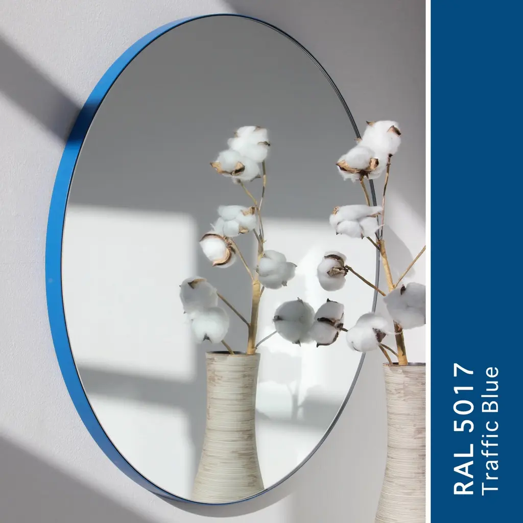 Modern rectangular mirror with a minimalist blue frame. Part of the charming Quadris™ collection, designed and handcrafted in London, UK.Our mirrors are designed with an integrated French cleat (split batten) system that ensures the mirror is securely mounted flush with the wall. An alternative hanging hook or a Z-bar (depending on the size of the mirror) is available on demand for mirrors that need to be installed allowing some separation from the wall.This mirror is fully customisable.The mirror in the images illustrates a small size, measuring 27cm x 68cm x 1.8cm / 10.6in x 26.8in x 0.71inShipped safely and insured worldwide. All our mirrors are made on demand. Fabrication lead time for this mirror is approximately 4 to 5 weeks. Our mirrors are always shipped by courier express. Shipping via courier express typically requires 1 to 2 days to the UK, or 2 to 7 days outside the UK depending on the destination.Available in the following sizes:Small: 27cm x 68cm x 1.8cm / 10.6'' x 26.8'' x 0.71’’Medium: 37cm x 56cm x 1.8cm / 14.6'' x 22" x 0.71’’Large: 46cm x 71cm x 1.8cm / 18.1'' x 28" x 0.71’’Extra Large: 48cm x 97cm x 1.8cm / 18.9" x 38.2" x 0.71’’or any bespoke dimensions.Available options:- frame depth: 18mm / 0.71’’, 24mm / 0.94’’ and 30mm / 1.18’’- frame finish: brass (brushed, polished or with a bronze patina), copper, stainless steel, blackened stainless steel, or in a variety of colours- mirror tint: silver, bronze, black, rose gold / peach, blue or green- bevelling- back-illumination creating a halo effect- demister padPlease contact us for a quote for any bespoke specification or added options.ORDERS OF MULTIPLE MIRRORS OF THE SAME TYPE: Please contact us to receive a Packing and Shipping quote when ordering multiple mirrors of the same type. An order for multiple mirrors of the same type may not be accepted without extra packing and shipping fees. Thank you.