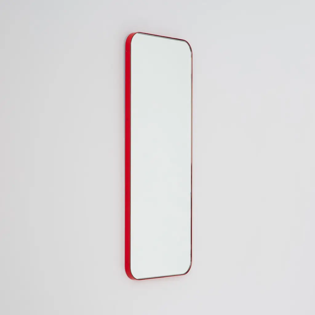 Minimalist rectangular mirror with a modern red frame. Part of the charming Quadris collection, designed and handcrafted in London, UK. Our mirrors are designed with an integrated French cleat (split batten) system that ensures the mirror is securely mounted flush with the wall. An alternative hanging hook or a Z-bar (depending on the size of the mirror) is available on demand for mirrors that need to be installed allowing some separation from the wall.The pictures show a small size, measuring 27cm x 68cm x 1.8cm / 10.6'' x 26.8'' x 0.71'' (see technical drawings for reference).This mirror is fully customisable.ORDERS OF MULTIPLE MIRRORS OF THE SAME TYPE: Please contact us to receive a Packing and Shipping quote when ordering multiple mirrors of the same type. An order for multiple mirrors of the same type may not be accepted without extra packing and shipping fees. Thank you.