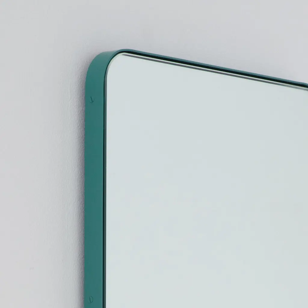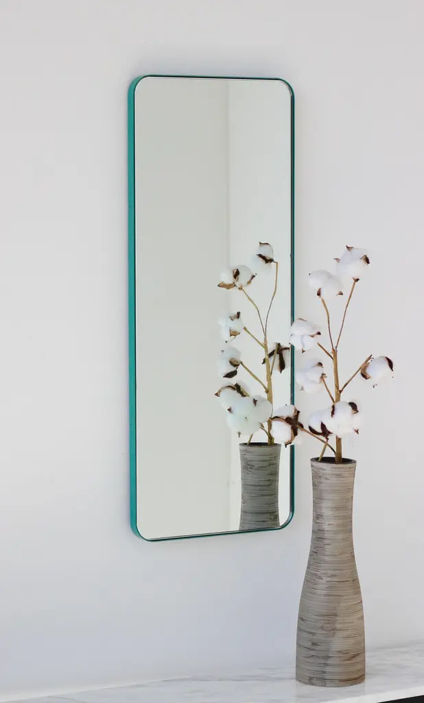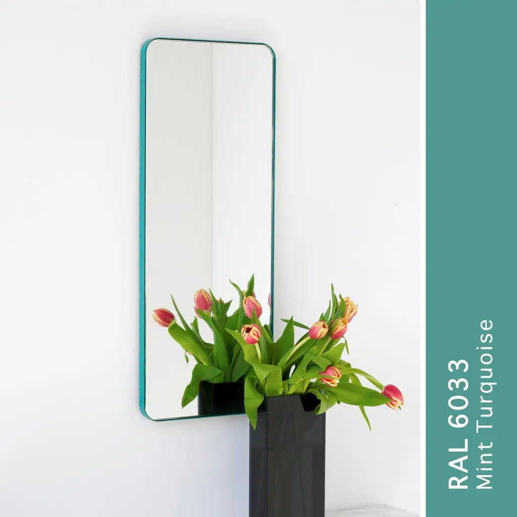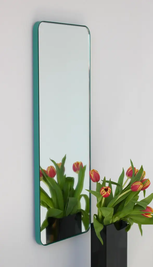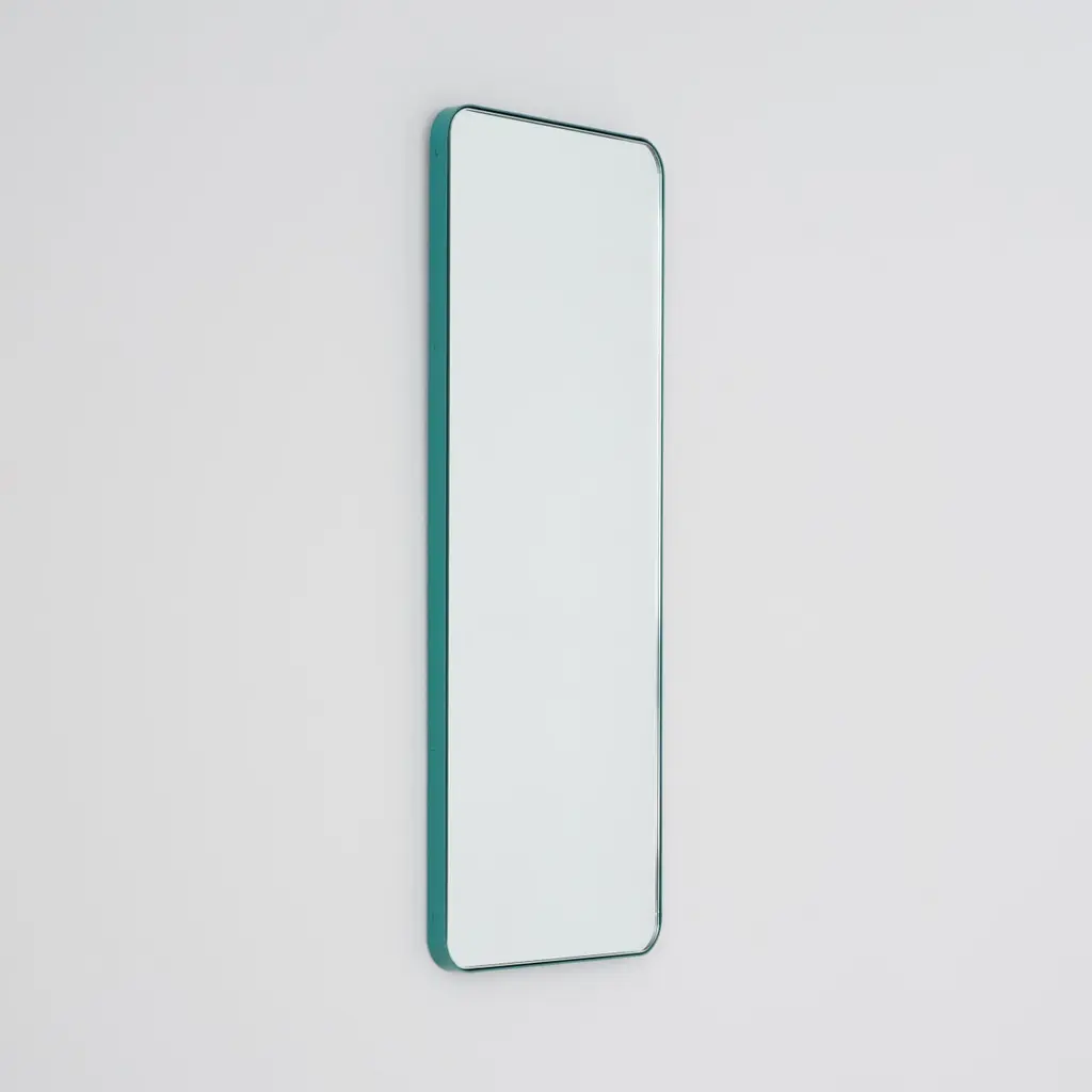 Modern rectangular mirror with an aluminium powder coated mint turquoise frame. Part of the charming Quadris™ collection, designed and handcrafted in London, UK. Our mirrors are designed with an integrated French cleat (split batten) system that ensures the mirror is securely mounted flush with the wall. An alternative hanging hook or a Z-bar (depending on the size of the mirror) is available on demand for mirrors that need to be installed allowing some separation from the wall.This mirror is fully customisable.The mirror in the images illustrates a small size, measuring 27cm x 68cm x 1.8cm / 10.6in x 26.8in x 0.71inShipped safely and insured worldwide. All our mirrors are made on demand. Fabrication lead time for this particular mirror is approximately 4 to 5 weeks. Our mirrors are always shipped by courier express. Shipping via courier express typically requires 1 to 2 days to the UK, or 2 to 7 days outside the UK depending on the destination.Available in the following sizes:Small: 27cm x 68cm x 1.8cm / 10.6'' x 26.8'' x 0.71’’Medium: 37cm x 56cm x 1.8cm / 14.6'' x 22" x 0.71’’Large: 46cm x 71cm x 1.8cm / 18.1'' x 28" x 0.71’’Extra Large: 48cm x 97cm x 1.8cm / 18.9" x 38.2" x 0.71’’or any bespoke dimensions.Available options:- frame depth: 18mm / 0.71’’, 24mm / 0.94’’ and 30mm / 1.18’’- frame finish: brass (brushed, polished or with a bronze patina), copper, stainless steel, blackened stainless steel, or in a variety of colours- mirror tint: silver, bronze, black, rose gold / peach, blue or green- bevelling- back-illumination creating a halo effect- demister padPlease contact us for a quote for any bespoke specification or added options.ORDERS OF MULTIPLE MIRRORS OF THE SAME TYPE: Please contact us to receive a Packing and Shipping quote when ordering multiple mirrors of the same type. An order for multiple mirrors of the same type may not be accepted without extra packing and shipping fees. Thank you.