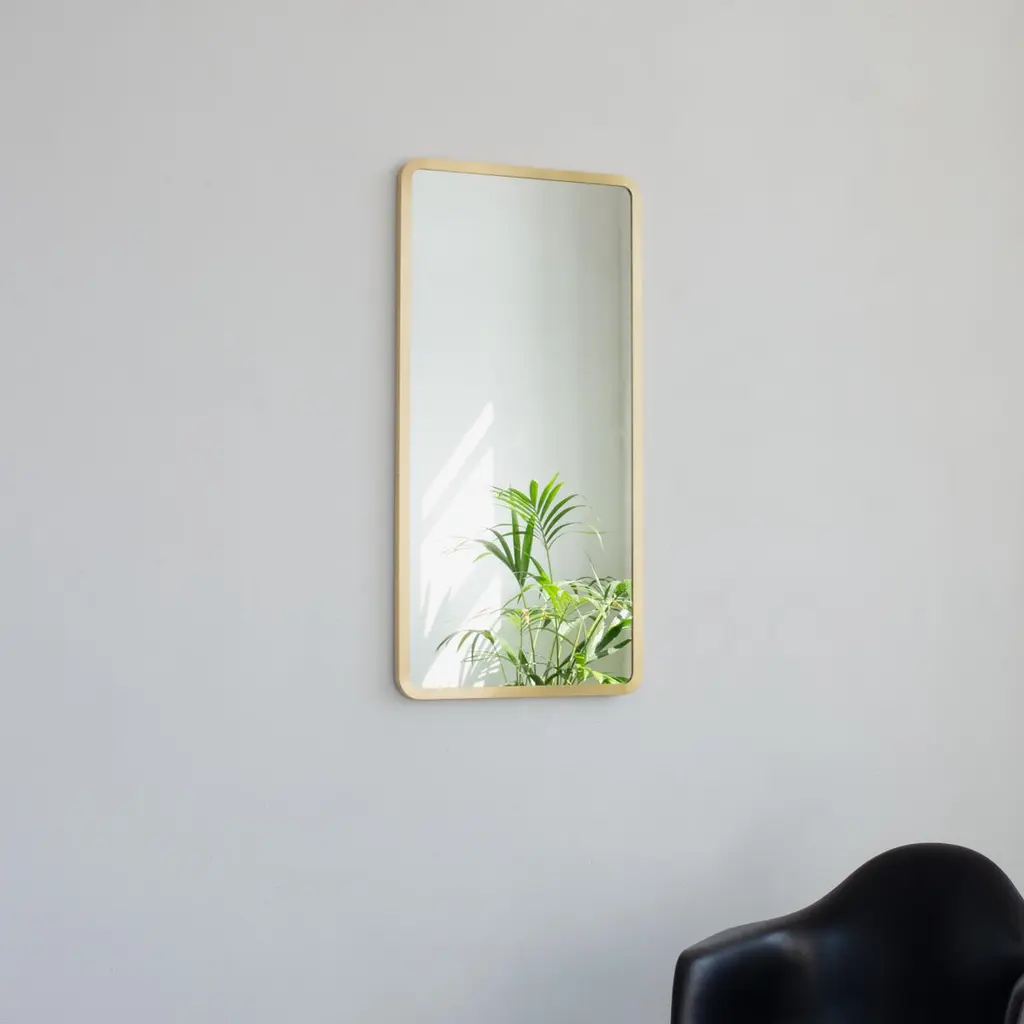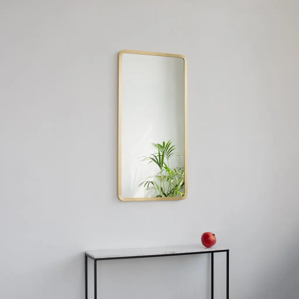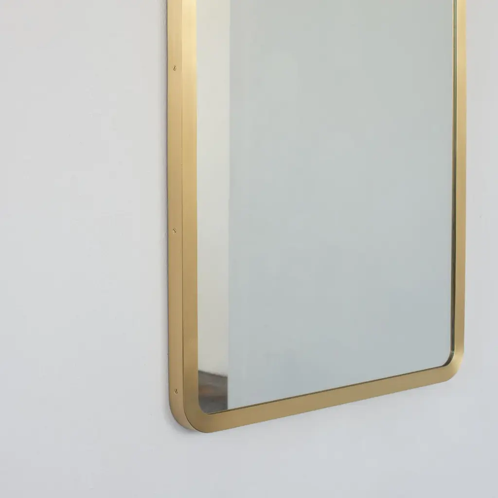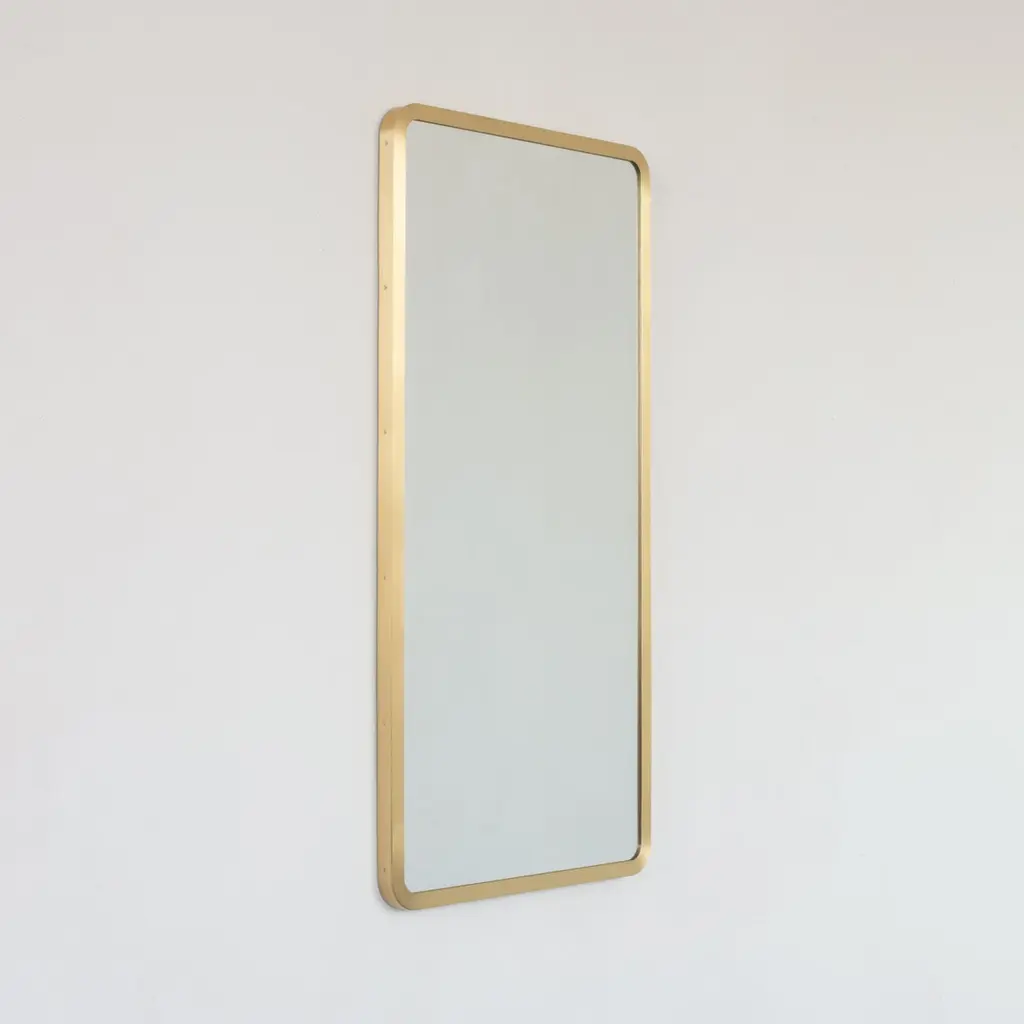 Modern rectangular mirror with an elegant solid brushed brass full frame. Part of the charming Quadris™ collection, designed and handcrafted in London, UK. Our brand new 'Full Frame' design maintains the chic and elegant style of Alguacil & Perkoff' signature 'Minimalist Frame' mirrors, yet placing more emphasis on the solid brass. The designer awards more prominence to this noble material by creating a wider frame on the front of the mirror itself.The detailing and finish, including visible brass screws, highlight the craft and quality feel of the mirror. Designed and handcrafted in London, UK.Our mirrors are designed with an integrated French cleat (split batten) system that ensures the mirror is securely mounted flush with the wall. An alternative hanging hook or a Z-bar (depending on the size of the mirror) is available on demand for mirrors that need to be installed allowing some separation from the wall.This mirror is fully customisable.The mirror in the images illustrates an extra large size, measuring 48cm x 97cm x 1.8cm / 18.9" x 38.2" x 0.71"Shipped safely and insured worldwide. All our mirrors are made on demand. Fabrication lead time for this particular mirror is approximately 4 to 5 weeks. Our mirrors are always shipped by courier express. Shipping via courier express typically requires 1 to 2 days to the UK, or 2 to 7 days outside the UK depending on the destination.Available in the following sizes:Small: 27cm x 68cm x 1.8cm / 10.6'' x 26.8'' x 0.71’’Medium: 37cm x 56cm x 1.8cm / 14.6'' x 22" x 0.71’’Large: 46cm x 71cm x 1.8cm / 18.1'' x 28" x 0.71’’Extra Large: 48cm x 97cm x 1.8cm / 18.9" x 38.2" x 0.71’’or any bespoke dimensions.Available options:- frame depth: 18mm / 0.71’’, 24mm / 0.94’’ and 30mm / 1.18’’- frame finish: brass (brushed, polished or with a bronze patina), copper, stainless steel, blackened stainless steel, or in a variety of colours- mirror tint: silver, bronze, black, rose gold / peach, blue or green- bevelling- back-illumination creating a halo effect- demister padPlease contact us for a quote for any bespoke specification or added options.ORDERS OF MULTIPLE MIRRORS OF THE SAME TYPE: Please contact us to receive a Packing and Shipping quote when ordering multiple mirrors of the same type. An order for multiple mirrors of the same type may not be accepted without extra packing and shipping fees. Thank you.