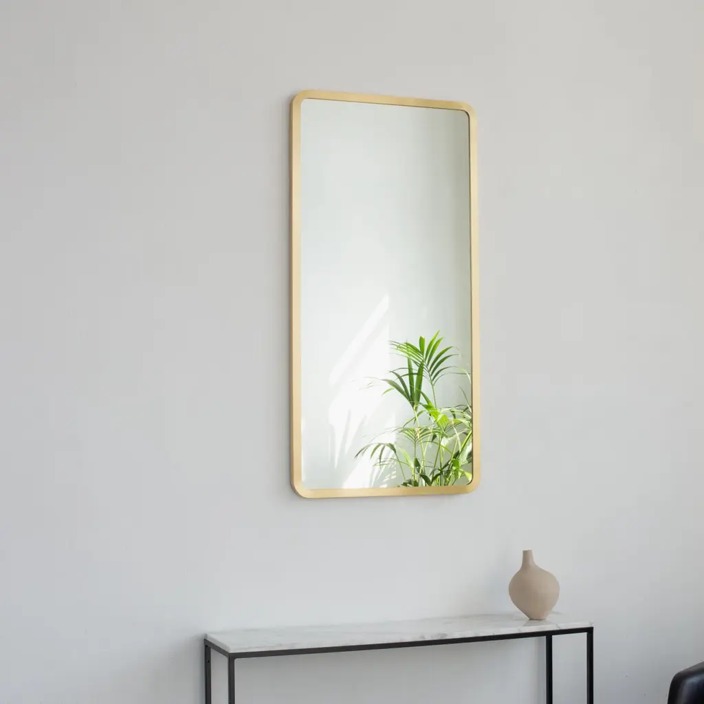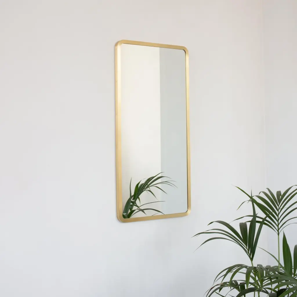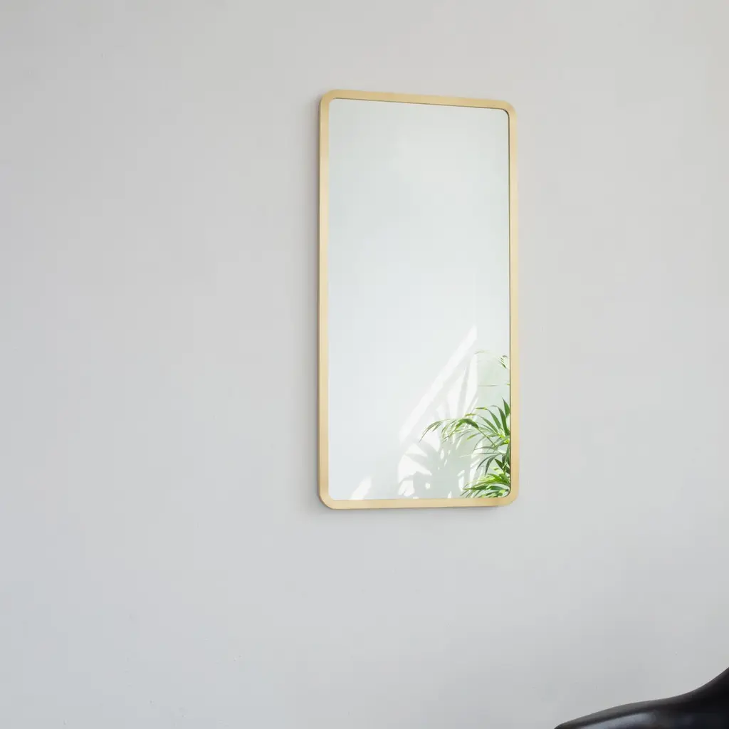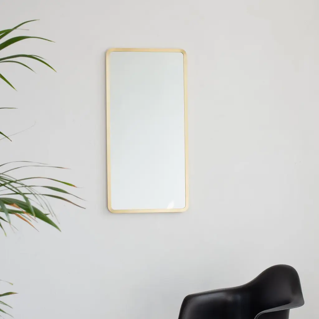 Modern rectangular mirror with an elegant solid brushed brass full frame. Part of the charming Quadris™ collection, designed and handcrafted in London, UK. Our brand new 'Full Frame' design maintains the chic and elegant style of Alguacil & Perkoff' signature 'Minimalist Frame' mirrors, yet placing more emphasis on the solid brass. The designer awards more prominence to this noble material by creating a wider frame on the front of the mirror itself.The detailing and finish, including visible brass screws, highlight the craft and quality feel of the mirror. Designed and handcrafted in London, UK.Our mirrors are designed with an integrated French cleat (split batten) system that ensures the mirror is securely mounted flush with the wall. An alternative hanging hook or a Z-bar (depending on the size of the mirror) is available on demand for mirrors that need to be installed allowing some separation from the wall.This mirror is fully customisable.The mirror in the images illustrates an extra large size, measuring 48cm x 97cm x 1.8cm / 18.9" x 38.2" x 0.71"Shipped safely and insured worldwide. All our mirrors are made on demand. Fabrication lead time for this particular mirror is approximately 4 to 5 weeks. Our mirrors are always shipped by courier express. Shipping via courier express typically requires 1 to 2 days to the UK, or 2 to 7 days outside the UK depending on the destination.Available in the following sizes:Small: 27cm x 68cm x 1.8cm / 10.6'' x 26.8'' x 0.71’’Medium: 37cm x 56cm x 1.8cm / 14.6'' x 22" x 0.71’’Large: 46cm x 71cm x 1.8cm / 18.1'' x 28" x 0.71’’Extra Large: 48cm x 97cm x 1.8cm / 18.9" x 38.2" x 0.71’’or any bespoke dimensions.Available options:- frame depth: 18mm / 0.71’’, 24mm / 0.94’’ and 30mm / 1.18’’- frame finish: brass (brushed, polished or with a bronze patina), copper, stainless steel, blackened stainless steel, or in a variety of colours- mirror tint: silver, bronze, black, rose gold / peach, blue or green- bevelling- back-illumination creating a halo effect- demister padPlease contact us for a quote for any bespoke specification or added options.ORDERS OF MULTIPLE MIRRORS OF THE SAME TYPE: Please contact us to receive a Packing and Shipping quote when ordering multiple mirrors of the same type. An order for multiple mirrors of the same type may not be accepted without extra packing and shipping fees. Thank you.