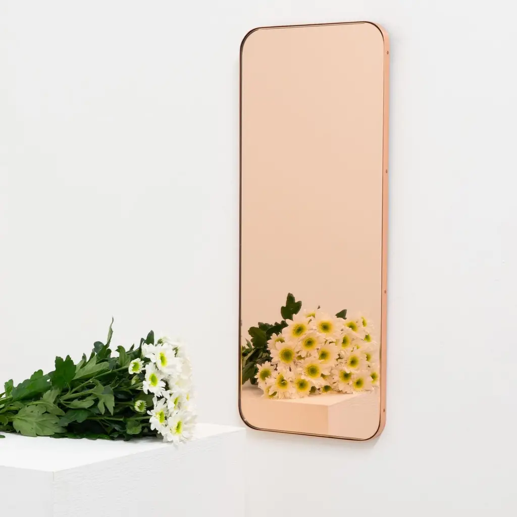Minimalist rectangular mirror with an elegant slim brushed copper frame. The detailing and finish, including visible copper plated screws, emphasise the crafty and quality feel of the mirror, a true signature of our brand. Designed and made in London, UK.Our mirrors are designed with an integrated French cleat (split batten) system that ensures the mirror is securely mounted flush with the wall. An alternative hanging hook or a Z-bar (depending on the size of the mirror) is available on demand for mirrors that need to be installed allowing some separation from the wall.This mirror is fully customisable.The mirror in the images illustrates a small size, measuring 27cm x 68cm x 1.8cm / 10.6in x 26.8in x 0.71inShipped safely and insured worldwide. All our mirrors are made on demand. Fabrication lead time for this particular mirror is approximately 4 to 5 weeks. Our mirrors are always shipped by courier express. Shipping via courier express typically requires 1 to 2 days to the UK, or 2 to 7 days outside the UK depending on the destination.Available in the following sizes:Small: 27cm x 68cm x 1.8cm / 10.6'' x 26.8'' x 0.71’’Medium: 37cm x 56cm x 1.8cm / 14.6'' x 22" x 0.71’’Large: 46cm x 71cm x 1.8cm / 18.1'' x 28" x 0.71’’Extra Large: 48cm x 97cm x 1.8cm / 18.9" x 38.2" x 0.71’’or any bespoke dimensions.Available options:- frame depth: 18mm / 0.71’’, 24mm / 0.94’’ and 30mm / 1.18’’- frame finish: brass (brushed, polished or with a bronze patina), copper, stainless steel, blackened stainless steel, or in a variety of colours- mirror tint: silver, bronze, black, rose gold / peach, blue or green- bevelling- back-illumination creating a halo effect- demister padPlease contact us for a quote for any bespoke specification or added options.ORDERS OF MULTIPLE MIRRORS OF THE SAME TYPE: Please contact us to receive a Packing and Shipping quote when ordering multiple mirrors of the same type. An order for multiple mirrors of the same type may not be accepted without extra packing and shipping fees. Thank you.