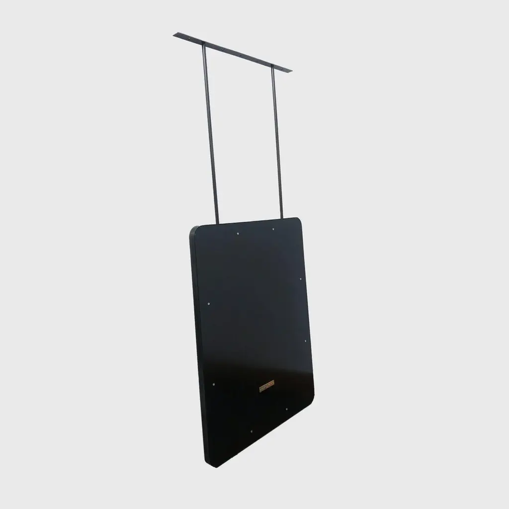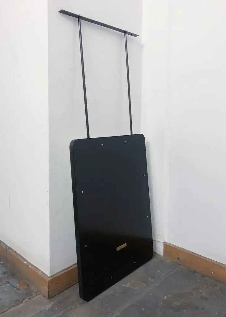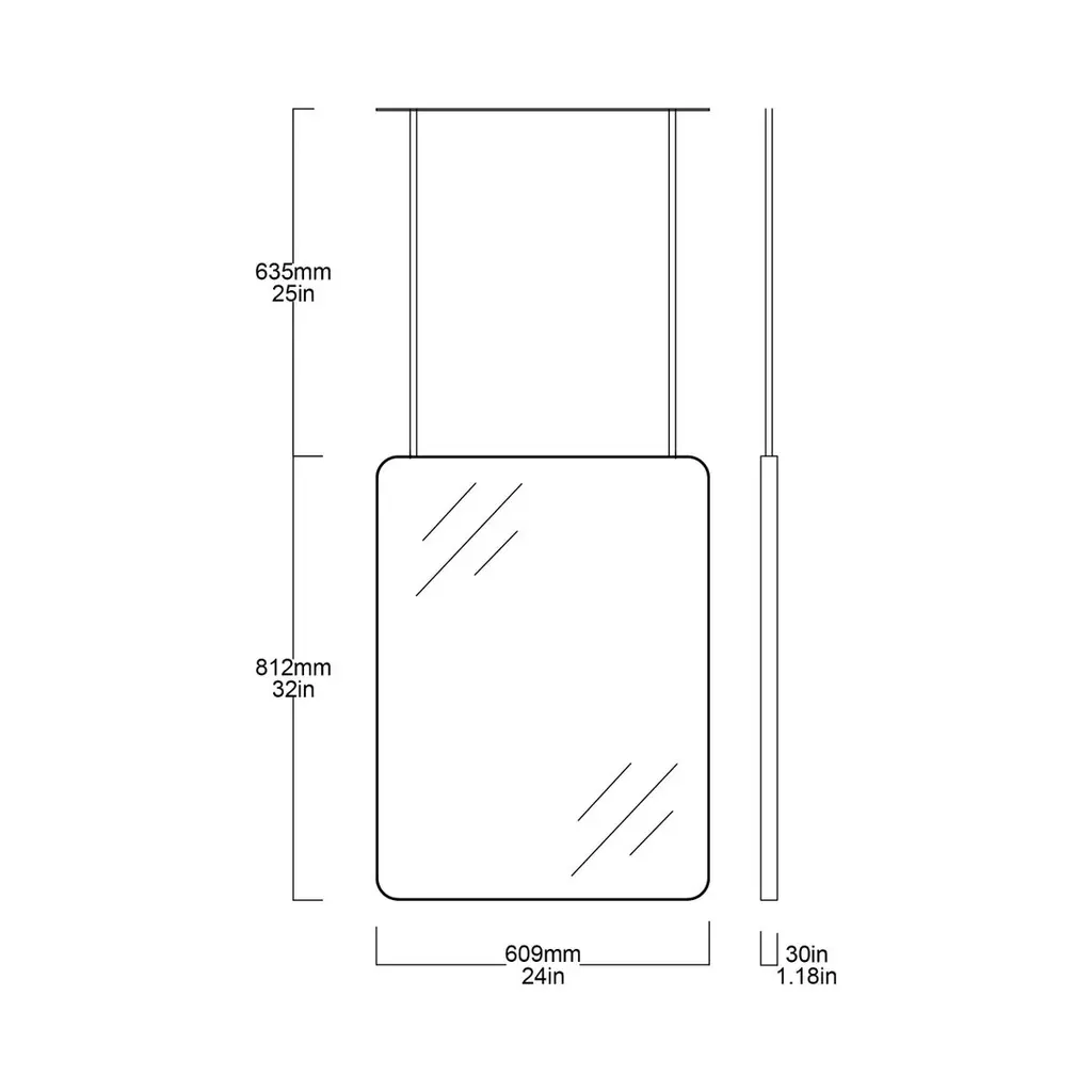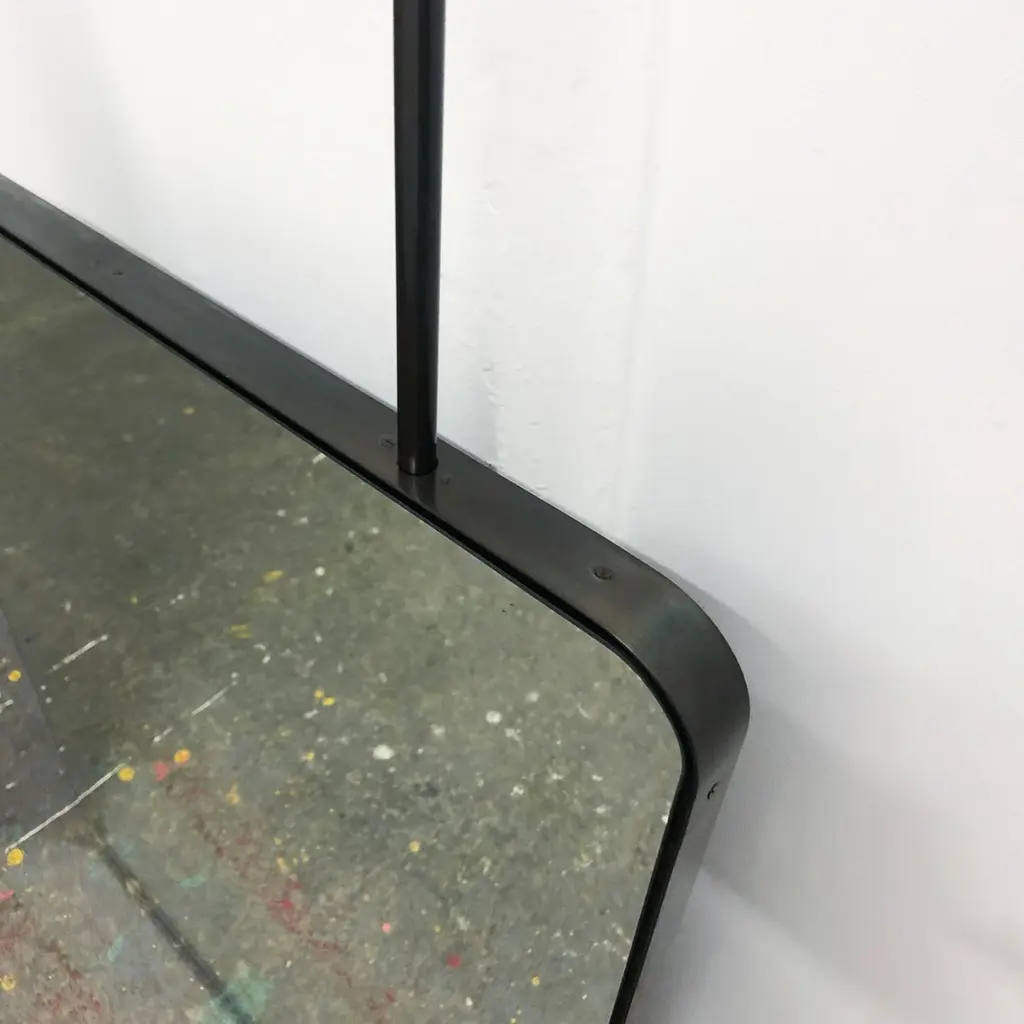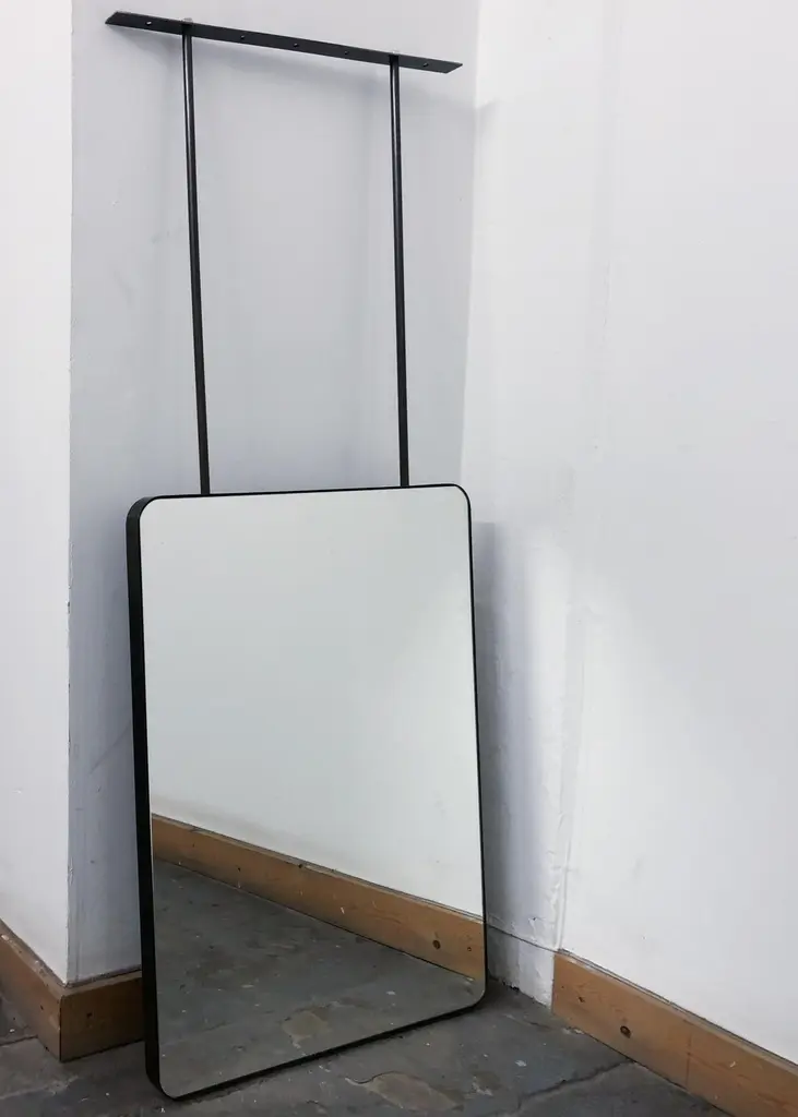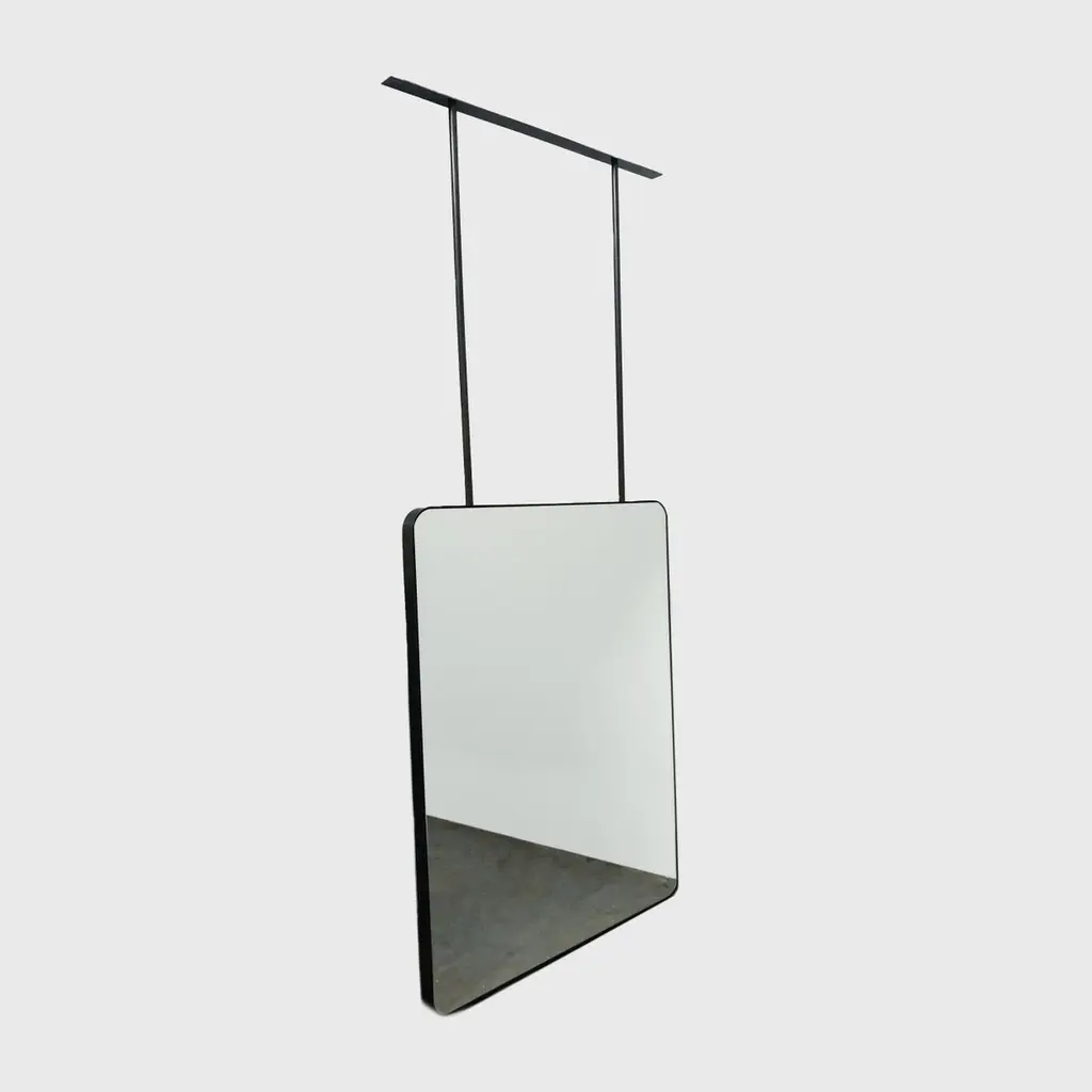 Stunning ceiling suspended rectangular mirror with rounded corners. The blackened stainless steel frame creates a modern, metallic, industrial look. Designed and handcrafted in London, UK, Alguacil & Perkoff's unique and elegant collection of ceiling suspended mirrors is fully customisable to suit the specific requirements of each interior.Mirror dimensions:609mm (24") wide x 812mm (32") high x 30mm (1.18") deepDrop 635mm (25")The high quality finish of our suspended mirrors extends to their backings, which are made from a powder coated panel available in black or white. Backings can also be upgraded to a finish that matches the frame or can be substituted by a second mirror, making your mirror double sided.The ceiling plate is supplied with a cover hiding the screws to complete the minimalist design of the mirror.Shipped safely and insured worldwide. All our mirrors are made on demand. Fabrication lead time for this mirror is approximately 6 to 7 weeks. Our mirrors are always shipped by courier express. Shipping via courier express typically requires 1 to 2 days to the UK, or 2 to 7 days outside the UK depending on the destination.Available options:• double sided mirror• backing in a finish that matches the frame• frame finishes: brass (brushed, polished or with a bronze patina), copper, stainless steel, blackened metal, powder coated aluminium in a range of standard or bespoke colours• full frame that extends to the front of the mirror• mirror tints: standard silver, black, bronze, gold, blue, rose gold / peach• back-illumination creating a halo effect• front-illumination around the periphery of the mirror• ON/OFF sensor switch• demister pad• bevelA presentation illustrating the options above is also available on demand. Please contact us for a quote for any bespoke specification or added options. IMPORTANT NOTES:- This suspended mirror is intended to be mounted onto the ceiling and cannot be installed onto a countertop. Countertop mounted mirrors are available on demand.- The illumination offered with our mirrors is decorative or intended to create mood lighting in the room that they are installed in. ORDERS OF MULTIPLE MIRRORS OF THE SAME TYPE: Please contact us to receive a Packing and Shipping quote when ordering multiple mirrors of the same type. An order for multiple mirrors of the same type may not be accepted without extra packing and shipping fees. Thank you.