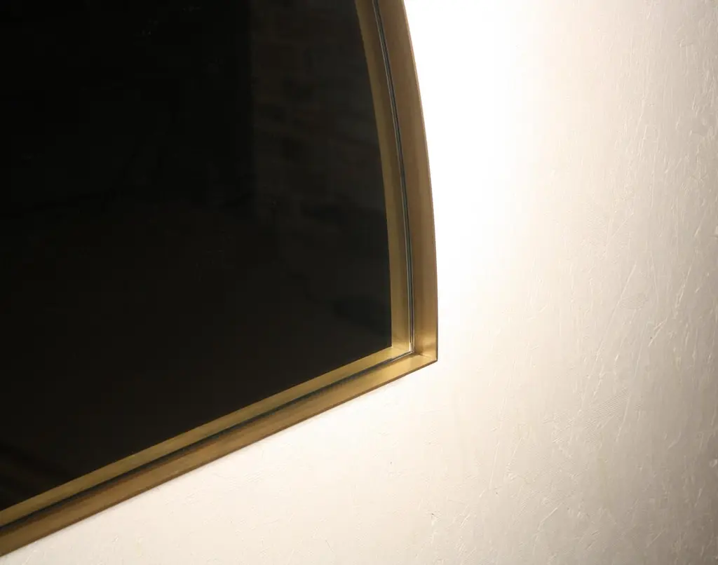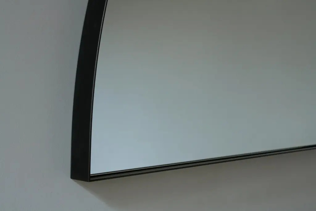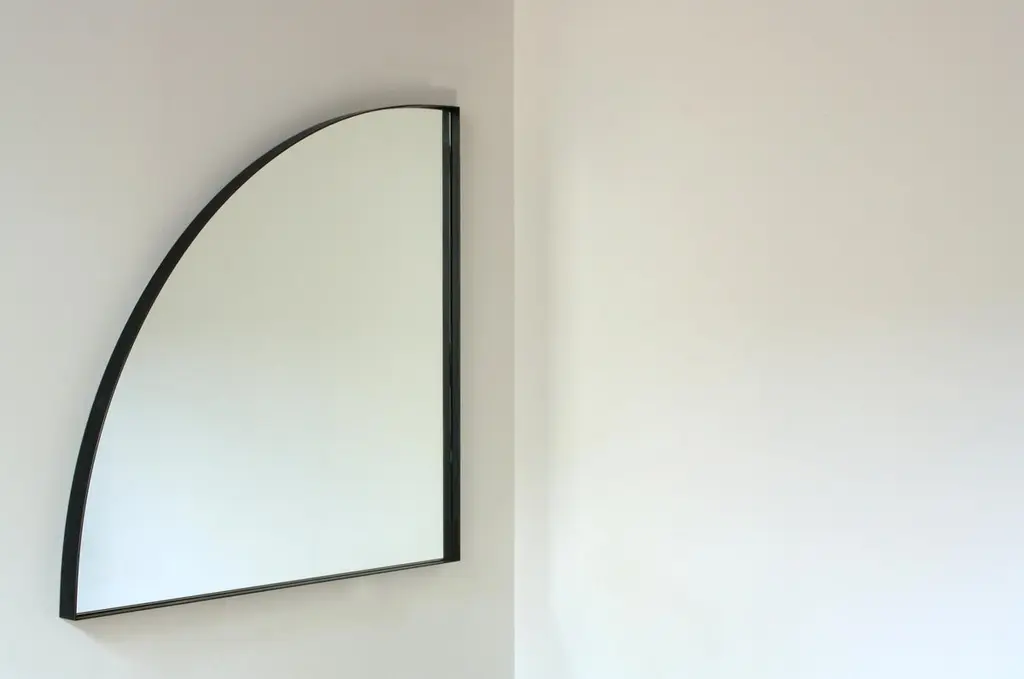 Shown with a quarter round satin brass frame and clear glass mirrorMeasures: 42” wide x 42” high x 2” deepalso shown with blackened steel frameA sweeping metal arc creates an atypical mirror shape - that of the quarter round - defined by a thin metal frame meticulously finished and detailed. Fit with a precisely cut glass mirror that is set at the exact half-way point of the frame so as to create the illusion of an opening where none can be found. This sizable mirror can be customized in size, scale, and finish to suit the space for which it is destined.Made by hand in Chicago in custom dimensions, shapes, and metal/mirror finishes.