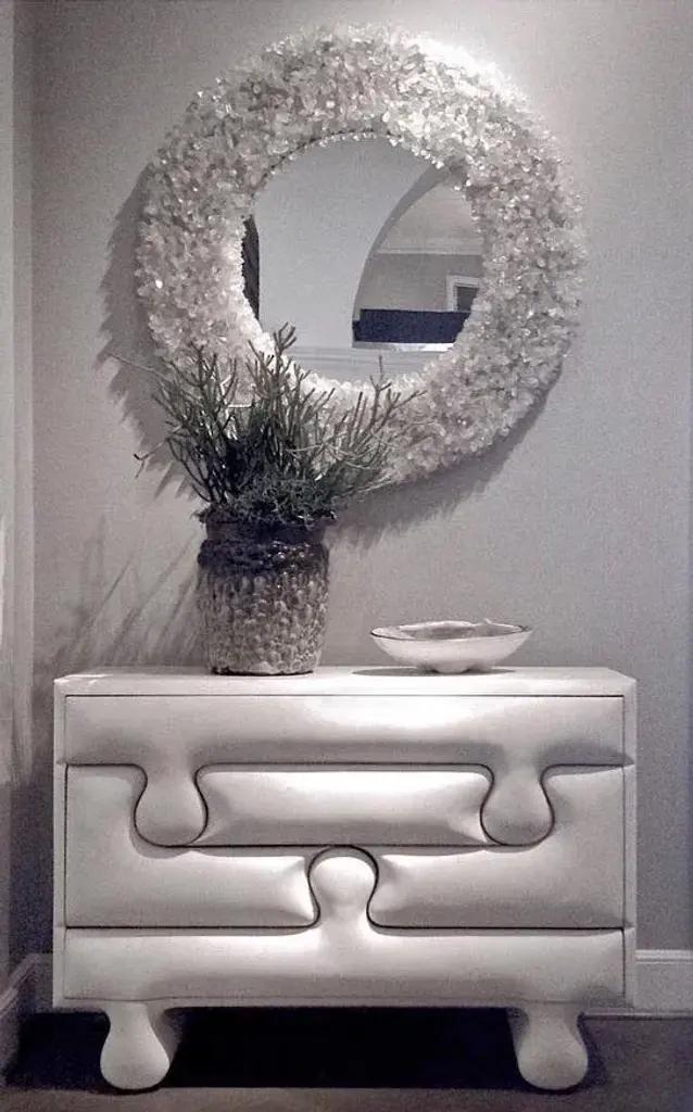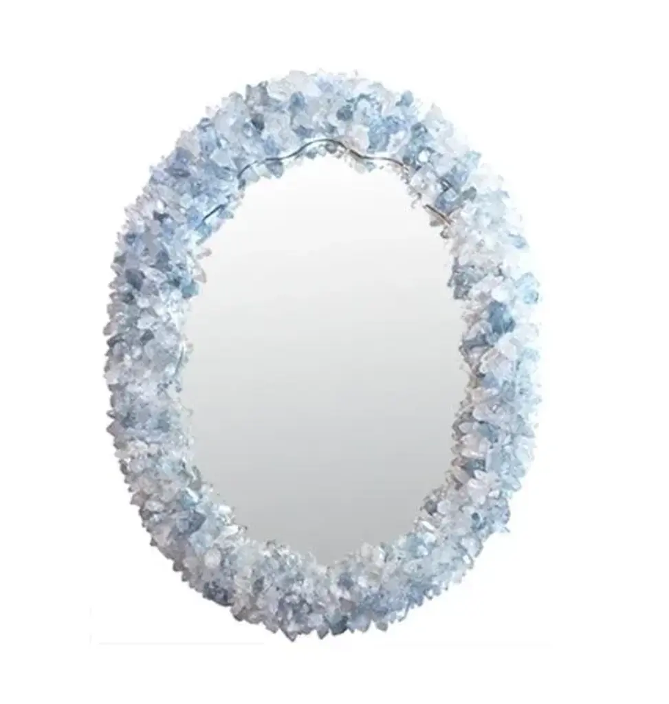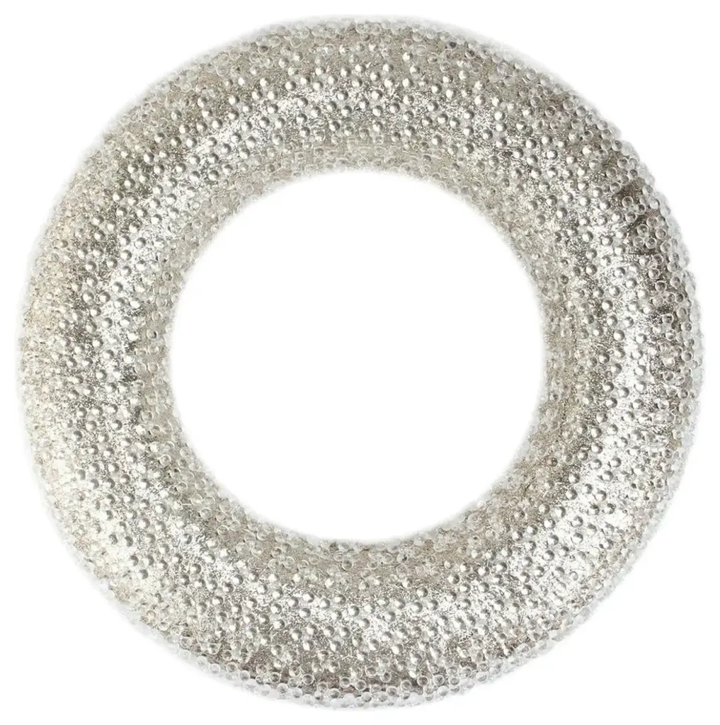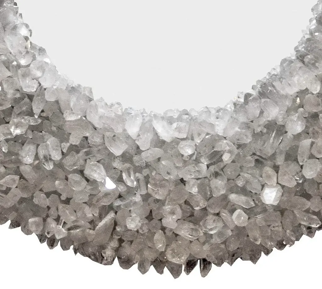 Hand-carved wood frame with a painted silver finish, dressed with thousands of Rough Quartz Crystals. 42" diameter with a 9" frame border and a depth of approximately 4". Please note that shipping charges do not include duties, taxes or brokerage fees that may be applied to orders shipped. These fees are the sole responsibility of the buyer.