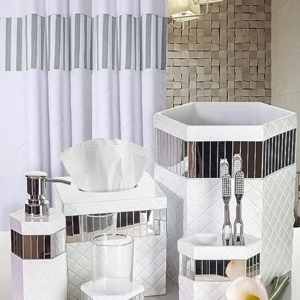 Elevate your bathroom decor with this sophisticated 6-piece accessory set. The set includes all the essentials for a well-organized countertop, while the modern mirrored accents add a touch of glamour.Features: