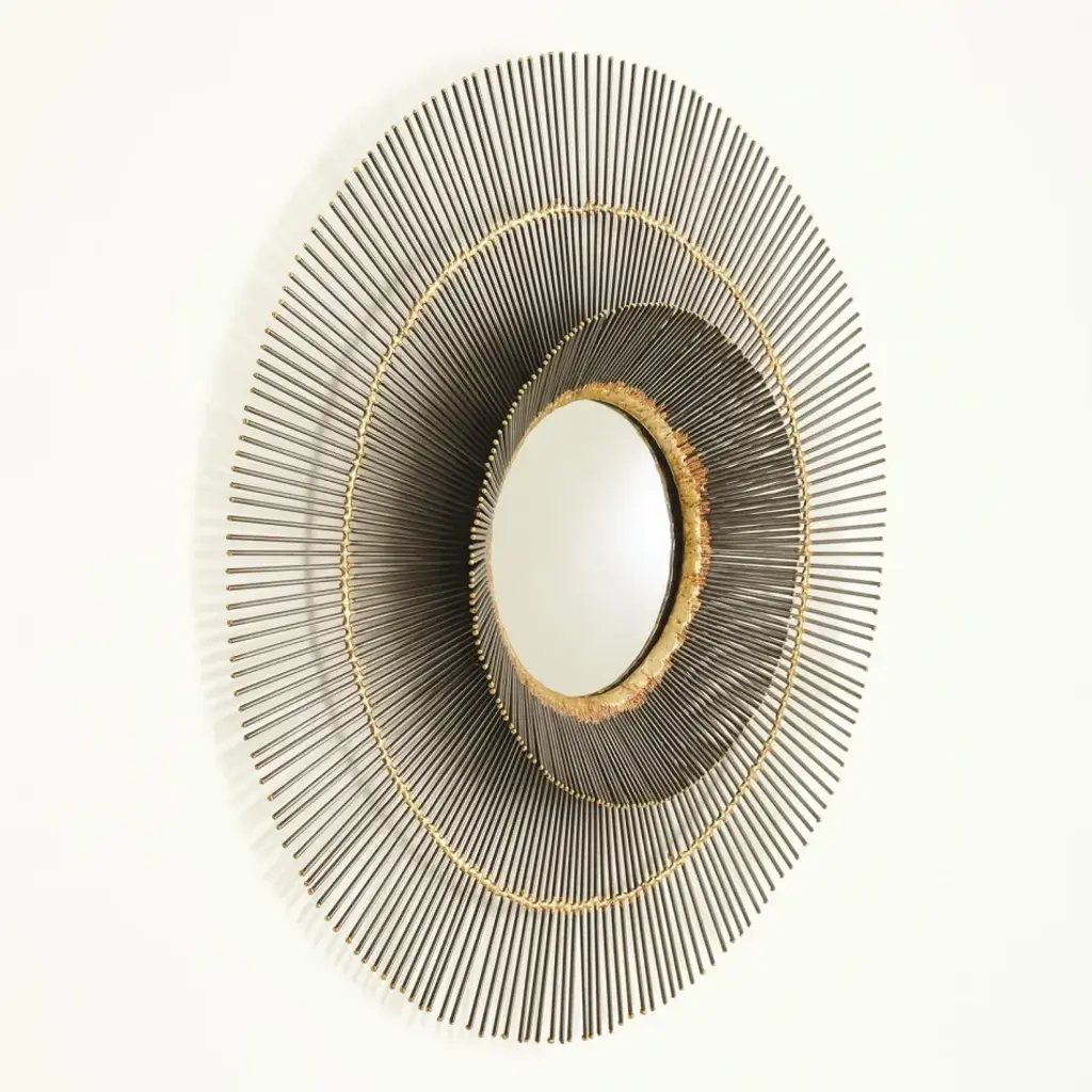 Dimensional rings radiate around a circular frame giving our Radiance Mirror depth and texture. An iron frame with brass braising details supports a round mirror. From a fashion forward perspective, Global Views offers accessories, furniture, statement lighting, and an assortment of rugs and mirrors to add beauty and joy to your home.