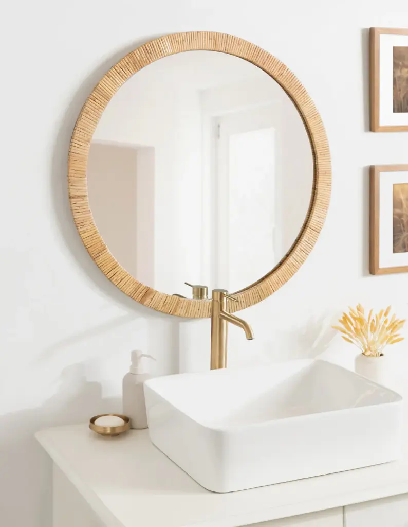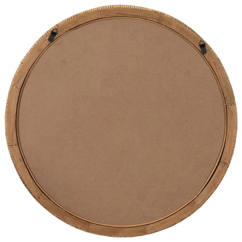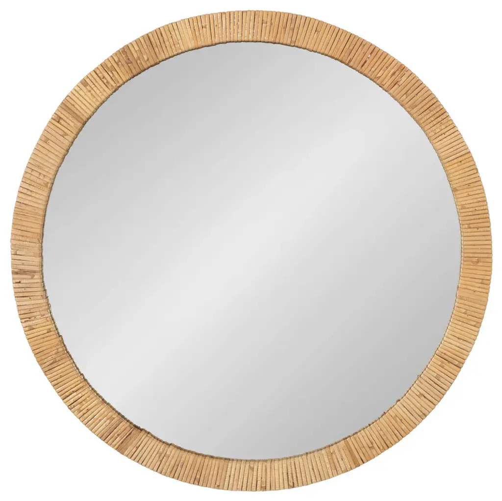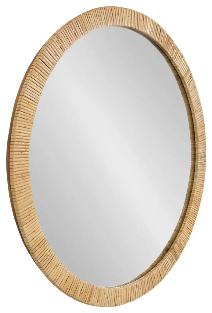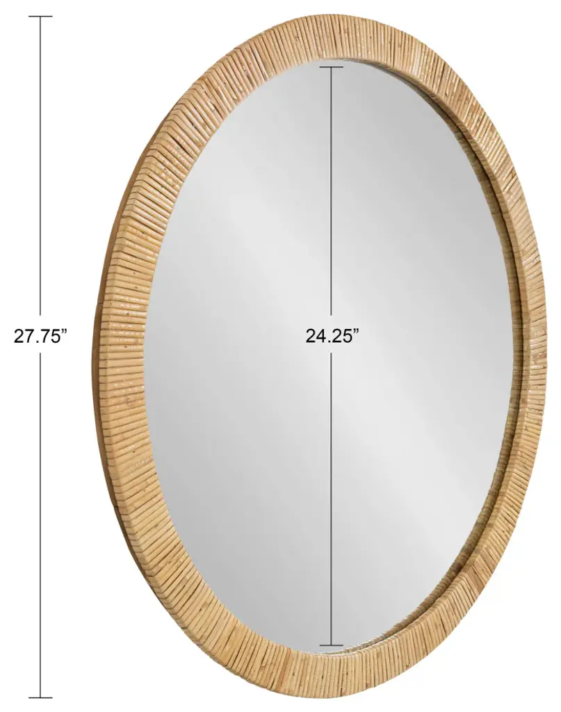Create a bohemian aesthetic in your home with this fantastic and oversized Rahfy mirror. This beautiful mirror is the epitome of boho design, featuring a round, textured look on the frame that pops off the wall. The beautifully wrapped frame is made from premium, high-quality rattan with a natural wood finish to show off its rich, authentic look. The round shape emphasizes its unique look with a dash of modernity to showcase a geometric and trendy style on any wall. The Rahfy mirror has a 28-inch diameter and a 1.25-inch profile, giving it a great dimensionality that pops off the wall. The actual glass mirror is 24.25" in diameter, providing an accent piece that is lovely for adding vibrancy and openness to any room of your home. Hang this stunning piece of wall decor in your bedroom, entryway, dining room, living room, or even bathroom with its stellar and unique boho design. Hang the beautiful and awe-striking Rahfy wall mirror in a matter of minutes with the convenient D-ring hangers attached to the back of the frame.• Modern Design: The bohemian Rahfy mirror features a lovely round mirror surrounded by a rattan-wrapped frame with a textured, dimensional design• Quality Material: The Rahfy frame is wrapped with a rich and stunning rattan to project worldly sophistication amidst your wall decor theme• Large Size: This mirror has a 28-inch diameter to create an oversized accent that elevates your bohemian style while unifying your captivating decor aesthetic• Versatile: The large diameter of this mirror makes it a stupendous accent piece to feature as a decorative oversized statement or a functional bathroom vanity mirror• Easy to Hang: Adding the Rahfy wall mirror to your bohemian-inspired decor display is easy with the D-ring hangers securely attached to the back of its frame