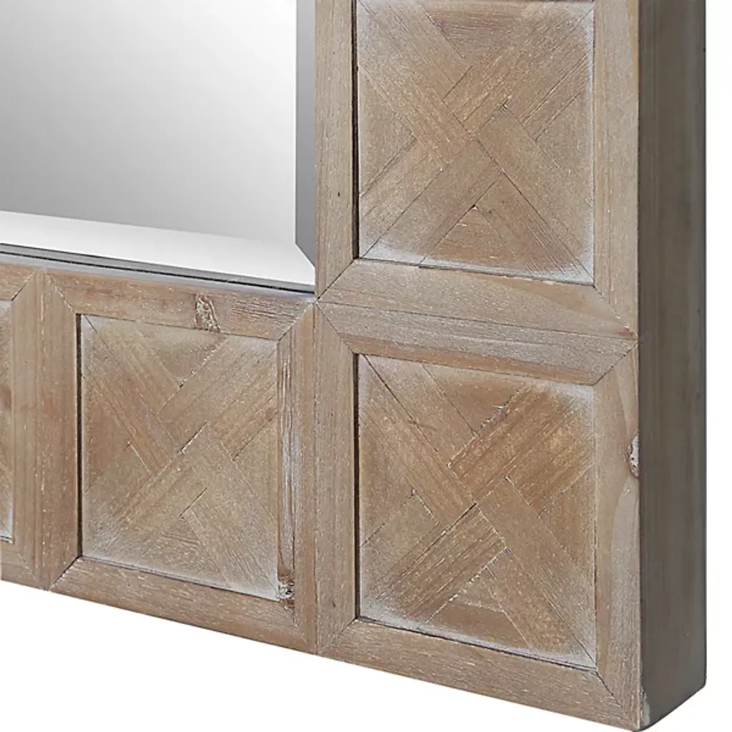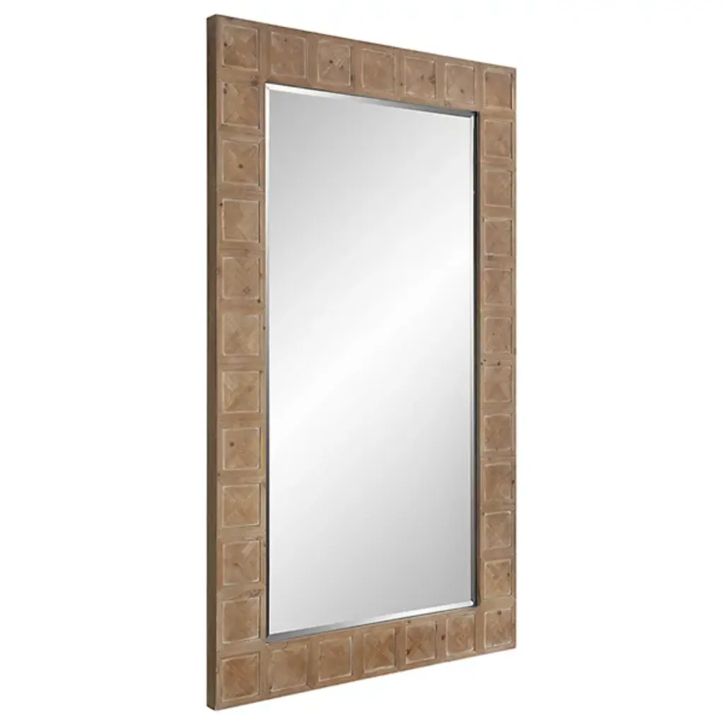 The Ranahan Wall Mirror from Uttermost celebrates the natural character of fir wood through its crosshatch design. John Kowalski's inspiration draws from rustic lodge aesthetics, with inlaid details that pattern the frame like a geometric puzzle. The white-washed finish lets the authentic wood grain peek through, while the beveled glass adds refinement. Each mirror tells its own story through unique variations in the natural wood, making it an authentic addition to any space.