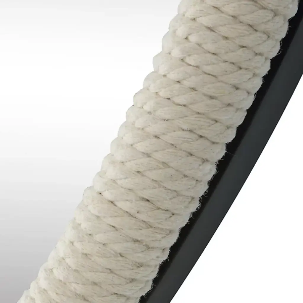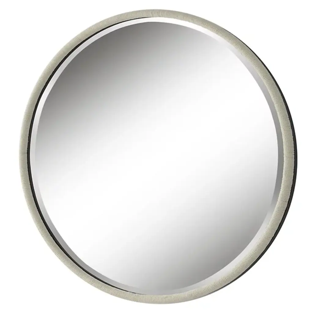 The Ranchero Round Wall Mirror from Uttermost brings nautical inspiration to interior spaces. The braided cotton rope wraps around the rounded iron frame, introducing rich texture and maritime character. The generous beveling technique enhances the glass mirror's reflective properties while adding depth to its artisanal modern design. Created by Grace Feyock, this wall piece works beautifully in spaces that need a hint of coastal influence without overpowering the existing room décor.