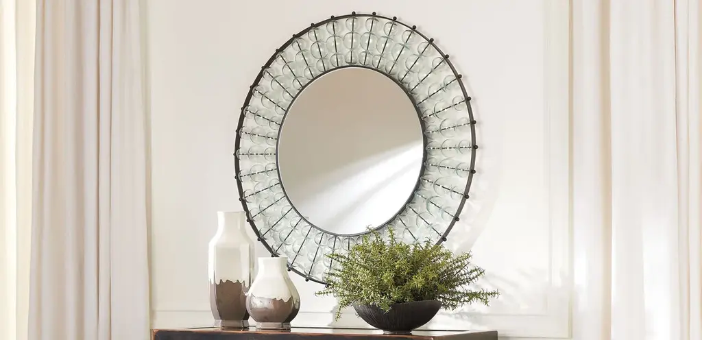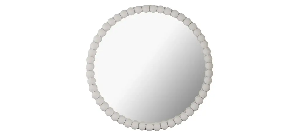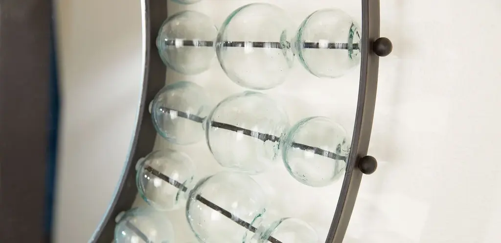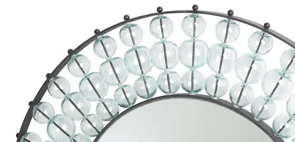 Artisans create Ranyra's industrial-inspired design by individually attaching glass balls to its black iron frame. This one-of-a-kind wall mirror can either go modern or add a touch of art deco glamour anywhere.