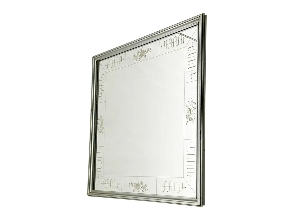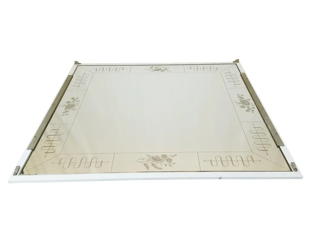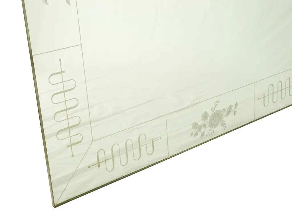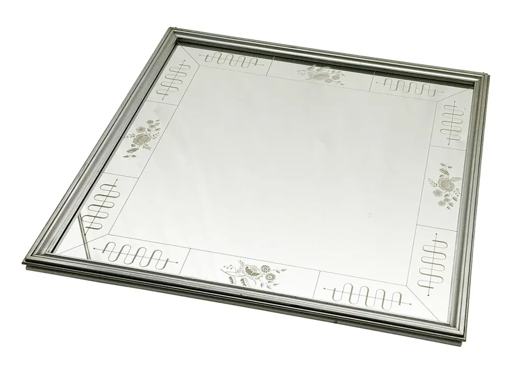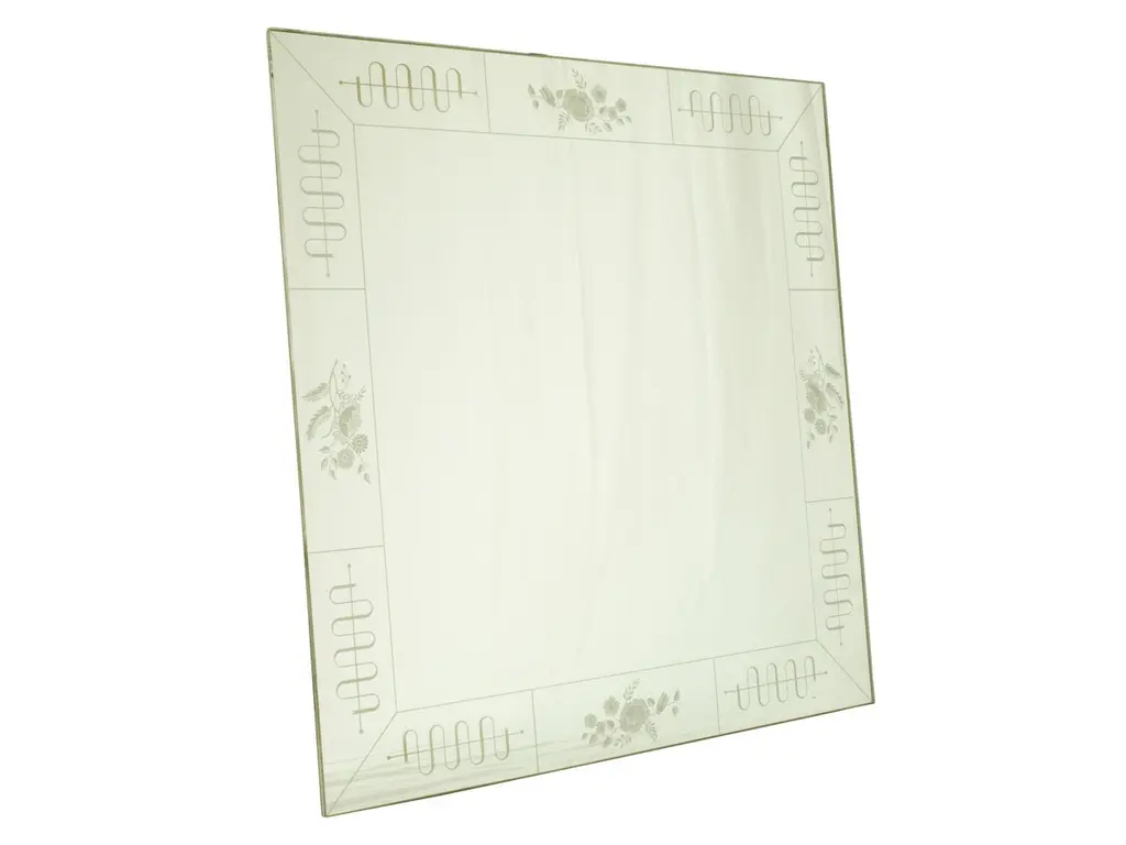 This amazing wall mirror was manufactured by the famous Italian Brusotti glassworks. It shows an elegant and precious frame decoration realized with the engraved glass technique. The mirror was designed to be fixed on the wall recessed, but it has been modified to be hang to the wall normally. Overall very good vintage condition: oxidation patina on the chrome-plated metal frames.2 items are available.Measures : Frame cm 98 x 98 x 3; Mirror cm 93,2 X 93,3 X 0,5Ref. Domus magazine from 1932 to 1934.