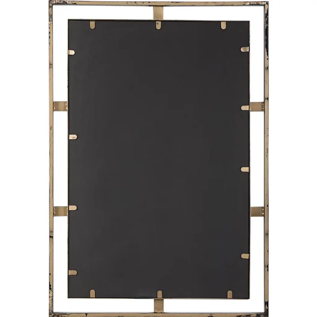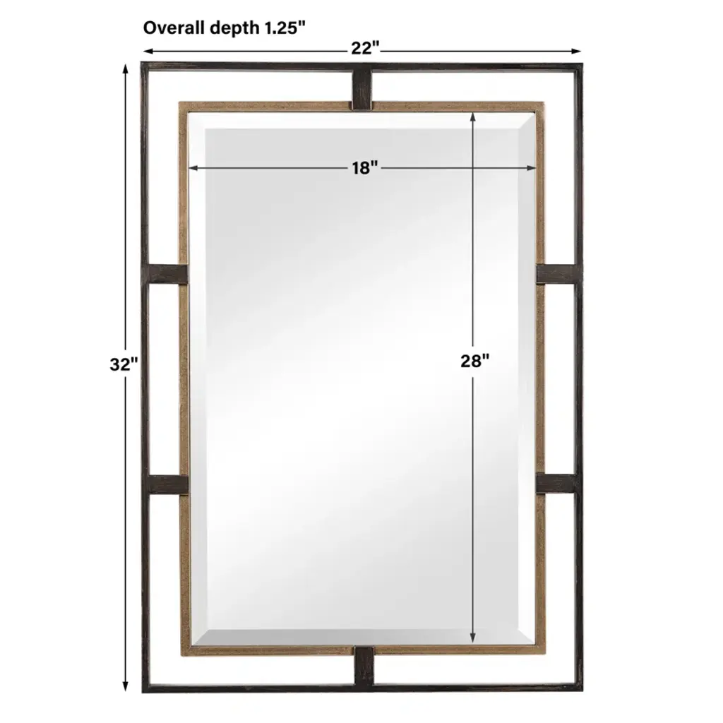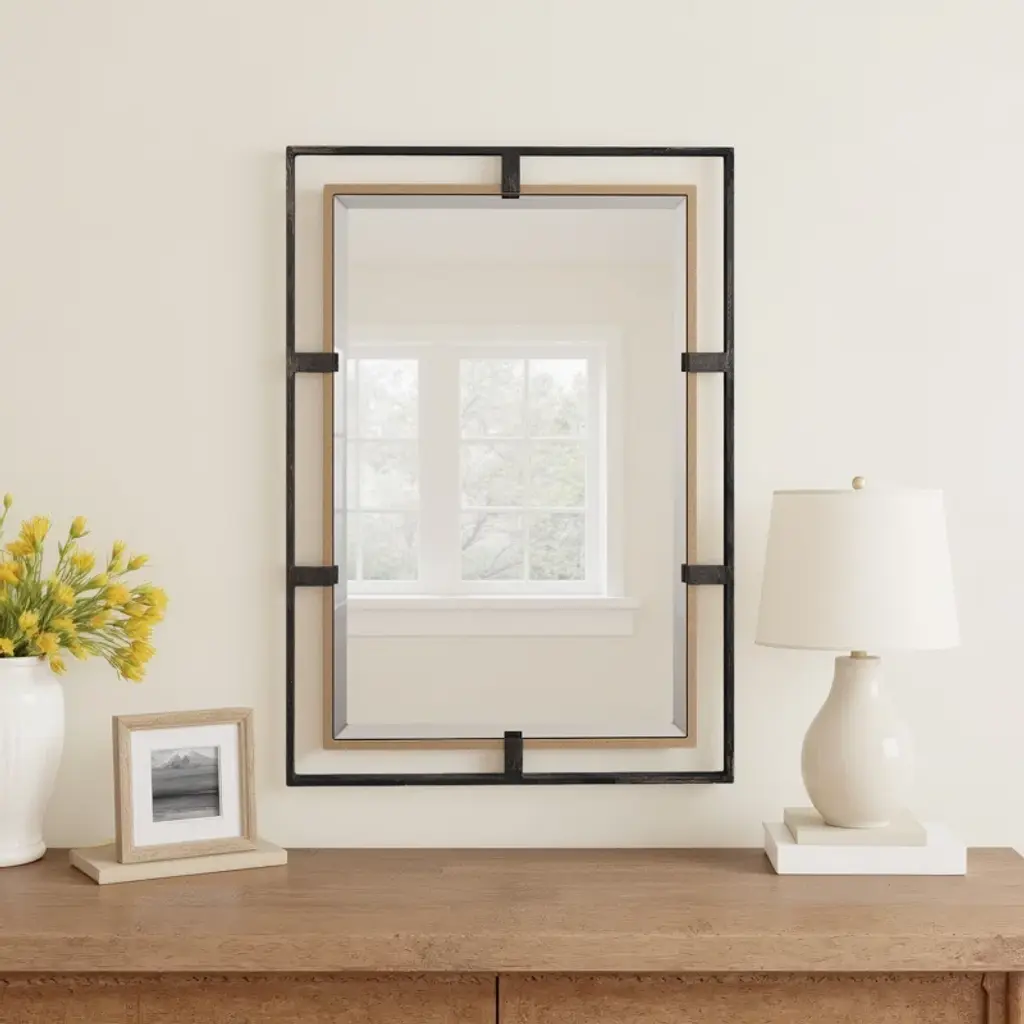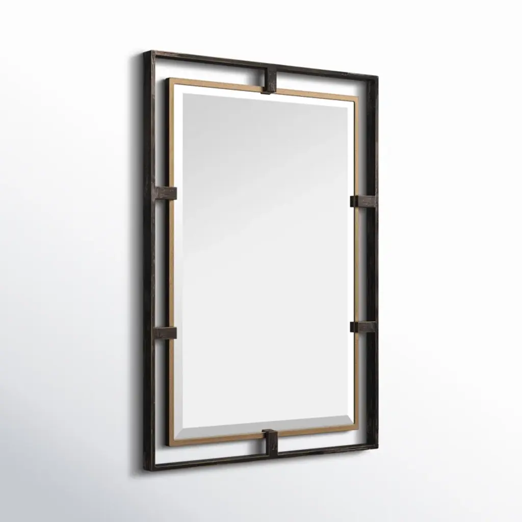 This wall-hanging mirror brings geometric style and a modern design to your living room or hallway. Crafted with an iron frame, it features a clean-lined rectangular silhouette with an interlocking design and a two-tone rustic bronze and antiqued gold finish. This mirror also features a beveled edge and measures 32'' high and 22'' wide, so it's great for checking your makeup or outfit before you head out the door. We love how this mirror also makes your room appear larger by letting light bounce around.