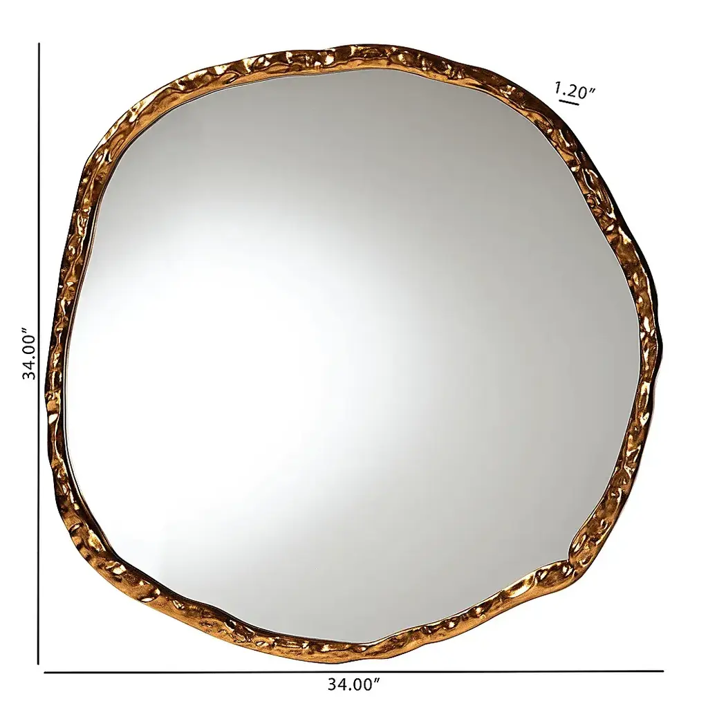 The Ravenbeat gold mirror features a hammered wood frame and bold geometric design. Fully assembled and ready to mount.