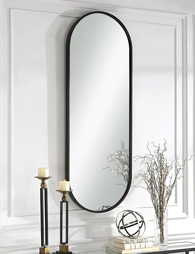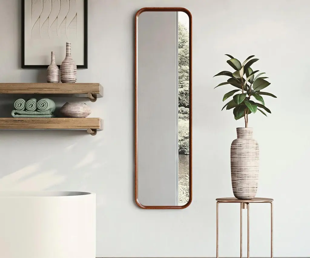 The Reagan Mirror features a box-style frame crafted from sturdy beech wood and finished with a rich reddish-brown stain to add depth.