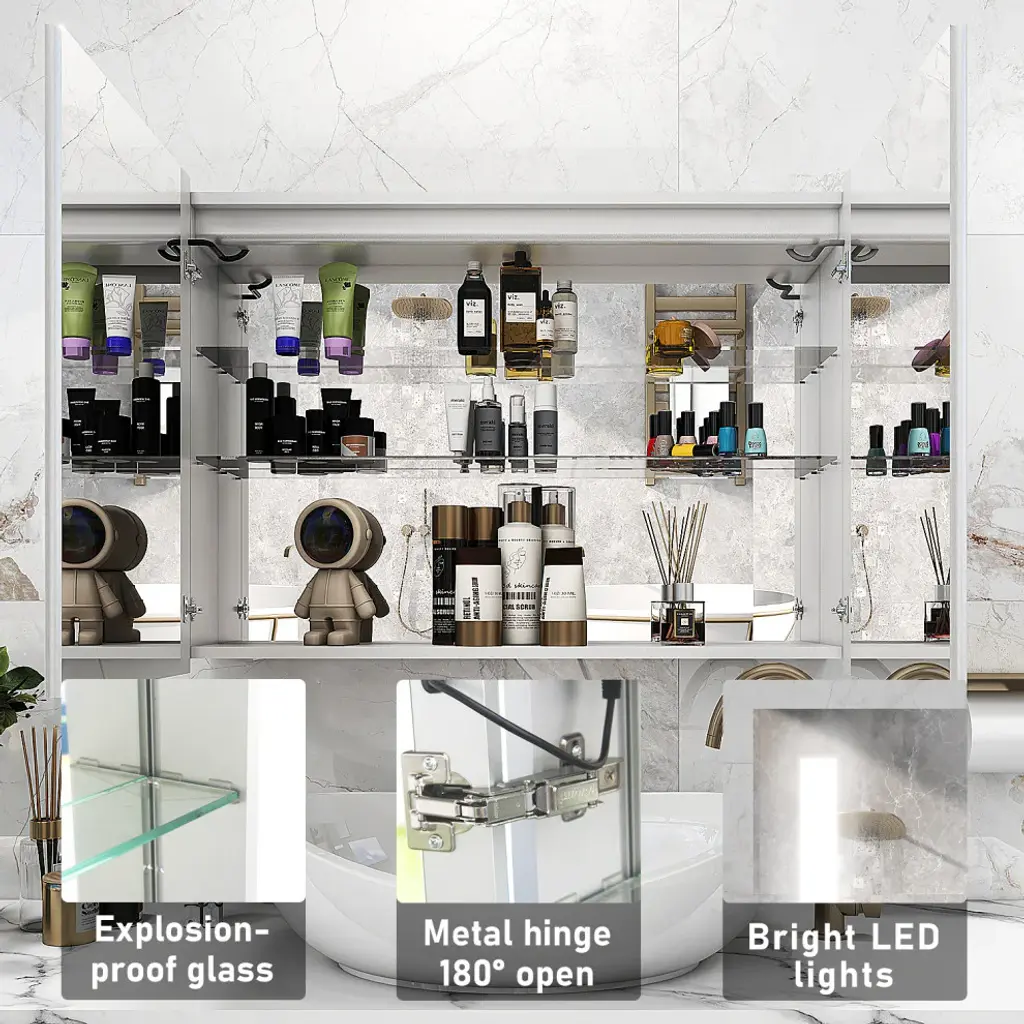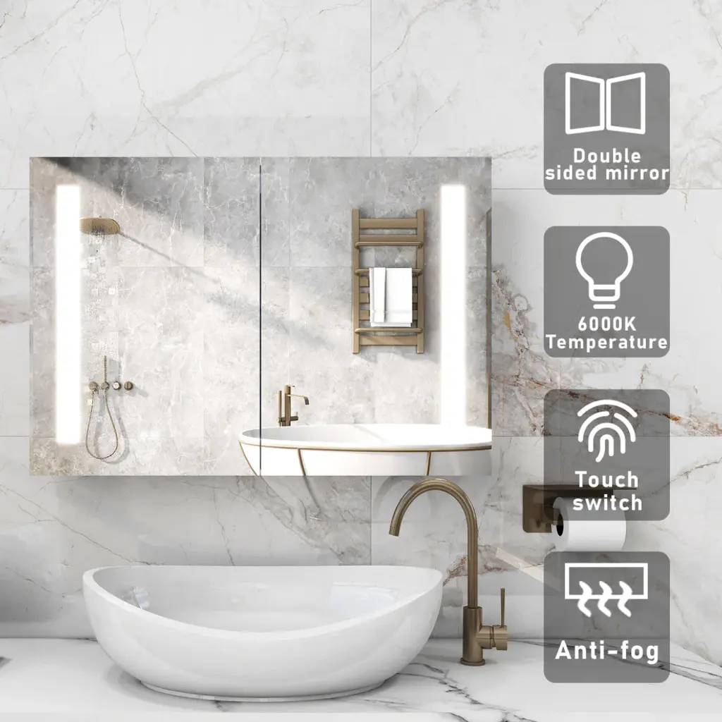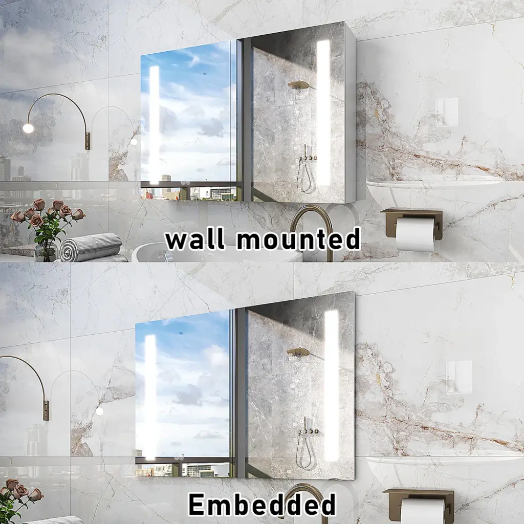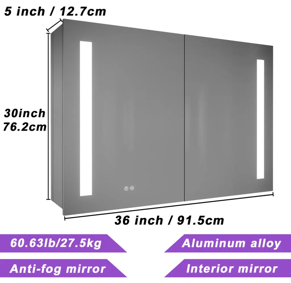 It has ample storage space with three thick glass layers, which can be separated into four spaces with adjustable heights. Whether you want to put in large bottles of shower gel or small bottles of vitamins, it is very convenient. And it can be categorized and placed without wasting space.The lighting area of this mirror cabinet is on both sides of the mirror surface.Equipped with two touch switches, one to control the main light, and one to control the anti-fog function."”"”What''s Included?2 Shelves IncludedLighting IncludedPower Source: HardwiredETL ApprovedType of Bulbs Used: LEDWatts of Bulbs: 34W"”"”Features:â—?ã€?Multiple Installation Methods】 The medicine cabinet supports embedded and wall-mounted installation, you can quickly hang it on the wall, or install it in the wall.â—?ã€?All-aluminum Material】The bathroom medicine cabinet is made of all-aluminum alloy material, which has the characteristics of light weight. Even if the wall-mounted installation is used, it will not cause a burden on the wall. All-aluminum material has good pressure resistance, anti-scratch effect, strong and durable.â—?ã€?LED Mirror with Anti-Fog】This medicine cabinet has a mirror and has an LED light source. With a touch switch, you can see yourself clearly when you press it lightly. After the shower, the anti-fog button can be turned on, and the perfect you can still be clearly displayed.â—?ã€?180-Degree Wide-angle Door】 Compared with other ordinary medicine cabinets, the mirror surface of Modland medicine cabinet can be unfolded 180°, and there are 4 mirrors inside the cabinet door. You can easily take the items in the cabinet while looking in the mirror.â—?ã€?Quality Assurance】Modland medicine cabinet has excellent quality and perfect product packaging, no need to worry about quality problems, we will help you solve all problems.