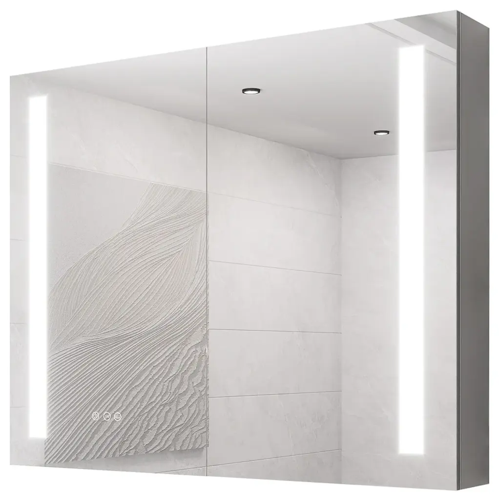 Elevate your bathroom experience with our Premium LED Bathroom Vanity Cabinet. Crafted with precision and attention to detail, this cabinet combines functionality and aesthetics seamlessly. From adjustable lighting to advanced features like motion-sensor activation, this cabinet is designed to enhance your daily routine. With a focus on durability, safety, and energy efficiency, it''s the perfect addition to any modern bathroom.-Continously-variable for light color temperature changes from 2700K-6500K delivers a ideal light.-10%-100% light Dimmable and memory function allows you to control the brightness of light and the brightness state is restored when the light is powered off. -UL certified Exterior LED Strip Light + Interior LED Light guides provide bright lighting. -Large-size Anti-fog pad provides better defogger performance. Anti-fog function is separate controlled and anti-fog power will be automatic shut off after 60 minutes,safe and energy-saving. -Austria BLUM three-dimention adjustable soft-close door right hinges with 110 degree opening capability for easy cabinet access. -Front mirror, inside door mirror and back panel mirror are provide superior visibility. All mirrors are safety backing film mirrors to prevent injury. -Built-in dual outlet and USB charger, conveniently charge your devices directly from the cabinet.-Compatible with Wall-mount and Recessed Mount. -Ip44 Rated Anodized aluminum construction with durable waterproof. -Eco-friendly waterproof copper free clear silver coated mirror glass. Adjustable Tempered-glass shelves. -Interiro LED stripe light goes on/off same time with door(s) open/close by motion sensors from SELF. -Intergraed LED bulbs have an estimated life-expectancy of 50,000 hours. Brightness at 2200 lumens ensures consistent lighting wiht minimum CRI(color redering index) 90+. -Packed with a plug so the cabinet can be installed with plug or hardwired. -ETL-listed for US and Canada, conforms to UL Std. 962, certified to CSA Std. C22.2 No. 250.0. -Two-year limited Warranty.