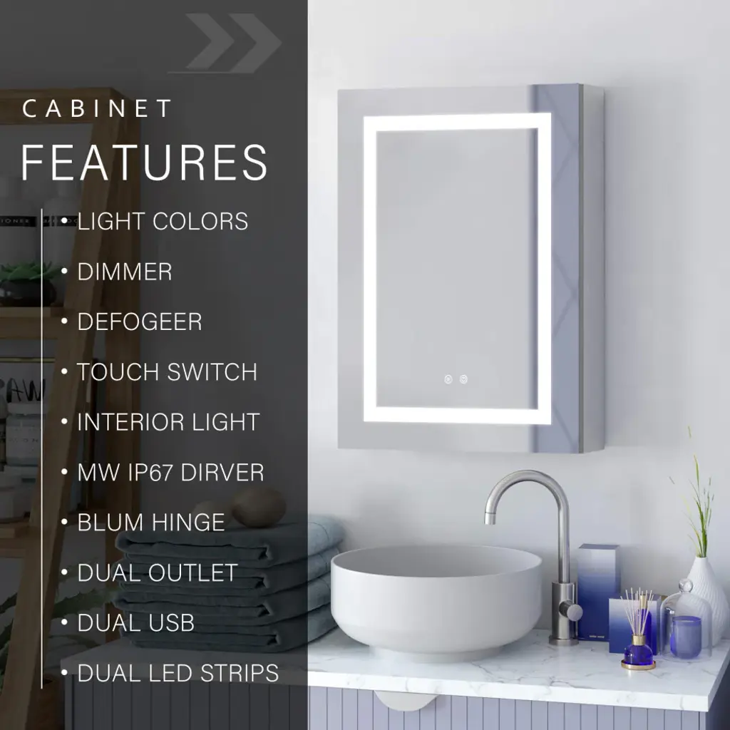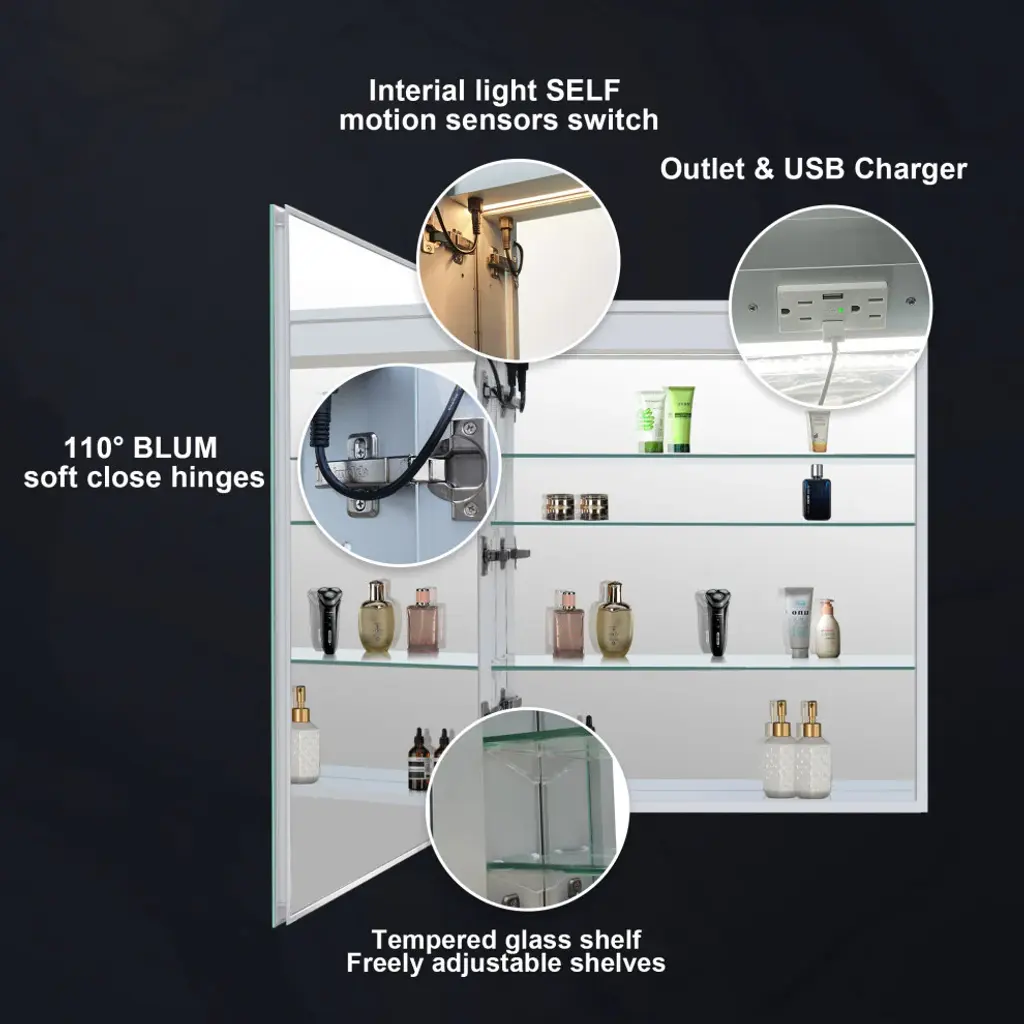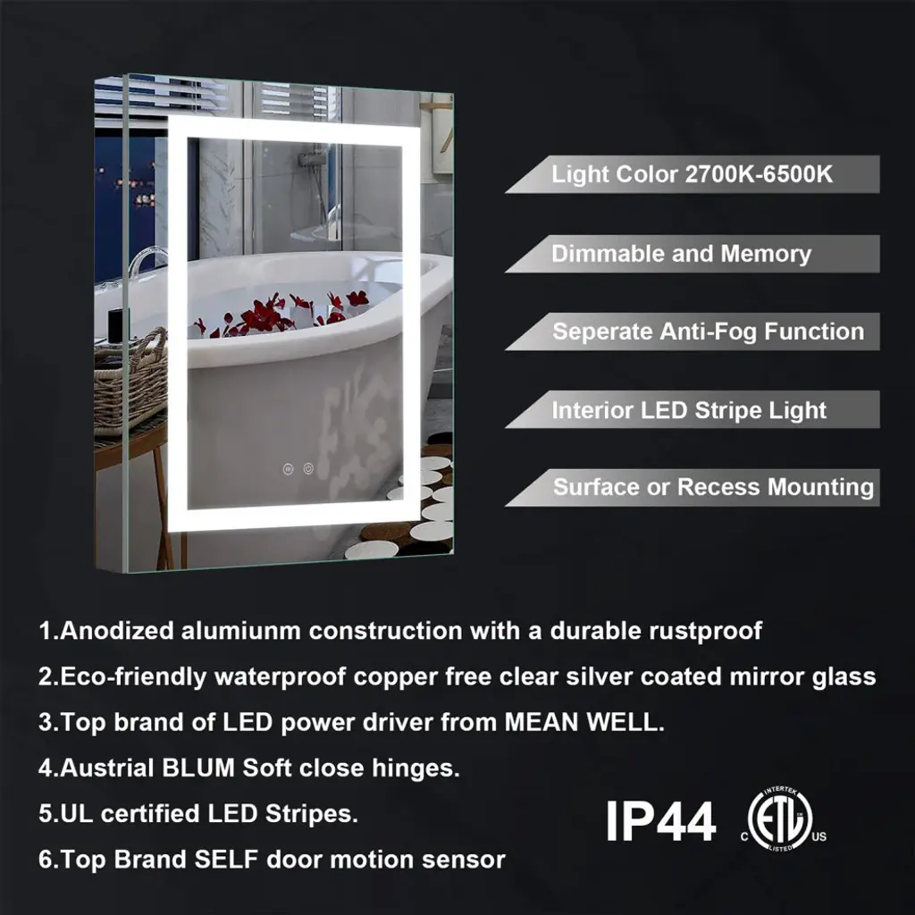 Elevate your bathroom experience with our Premium LED Bathroom Vanity Cabinet. Crafted with precision and attention to detail, this cabinet combines functionality and aesthetics seamlessly. From adjustable lighting to advanced features like motion-sensor activation, this cabinet is designed to enhance your daily routine. With a focus on durability, safety, and energy efficiency, it''s the perfect addition to any modern bathroom.-Continously-variable for light color temperature changes from 2700K-6500K delivers a ideal light.-10%-100% light Dimmable and memory function allows you to control the brightness of light and the brightness state is restored when the light is powered off. -UL certified Exterior LED Strip Light + Interior LED Light guides provide bright lighting. -Large-size Anti-fog pad provides better defogger performance. Anti-fog function is separate controlled and anti-fog power will be automatic shut off after 60 minutes,safe and energy-saving. -Austria BLUM three-dimention adjustable soft-close door right hinges with 110 degree opening capability for easy cabinet access. -Front mirror, inside door mirror and back panel mirror are provide superior visibility. All mirrors are safety backing film mirrors to prevent injury. -Built-in dual outlet and USB charger, conveniently charge your devices directly from the cabinet.-Compatible with Wall-mount and Recessed Mount. -Ip44 Rated Anodized aluminum construction with durable waterproof. -Eco-friendly waterproof copper free clear silver coated mirror glass. Adjustable Tempered-glass shelves. -Interiro LED stripe light goes on/off same time with door(s) open/close by motion sensors from SELF. -Intergraed LED bulbs have an estimated life-expectancy of 50,000 hours. Brightness at 2200 lumens ensures consistent lighting wiht minimum CRI(color redering index) 90+. -Packed with a plug so the cabinet can be installed with plug or hardwired. -ETL-listed for US and Canada, conforms to UL Std. 962, certified to CSA Std. C22.2 No. 250.0. -Two-year limited Warranty.