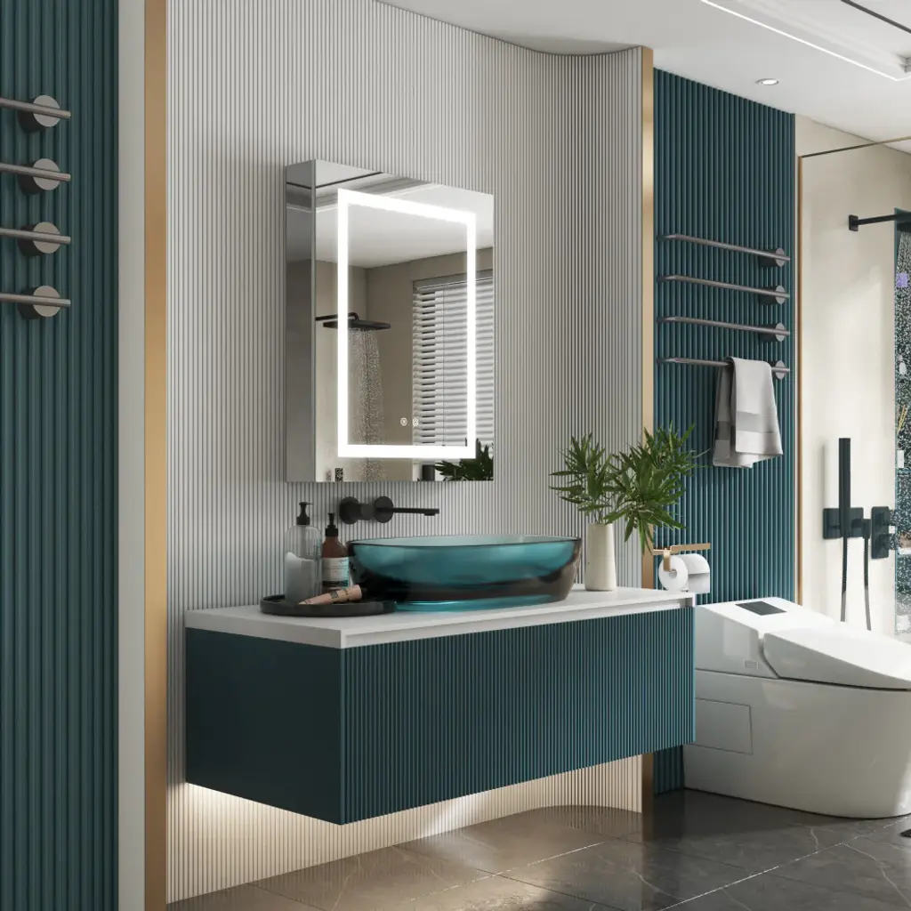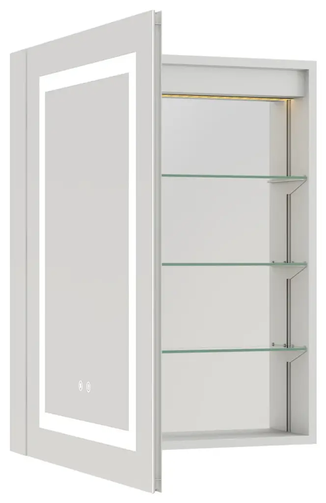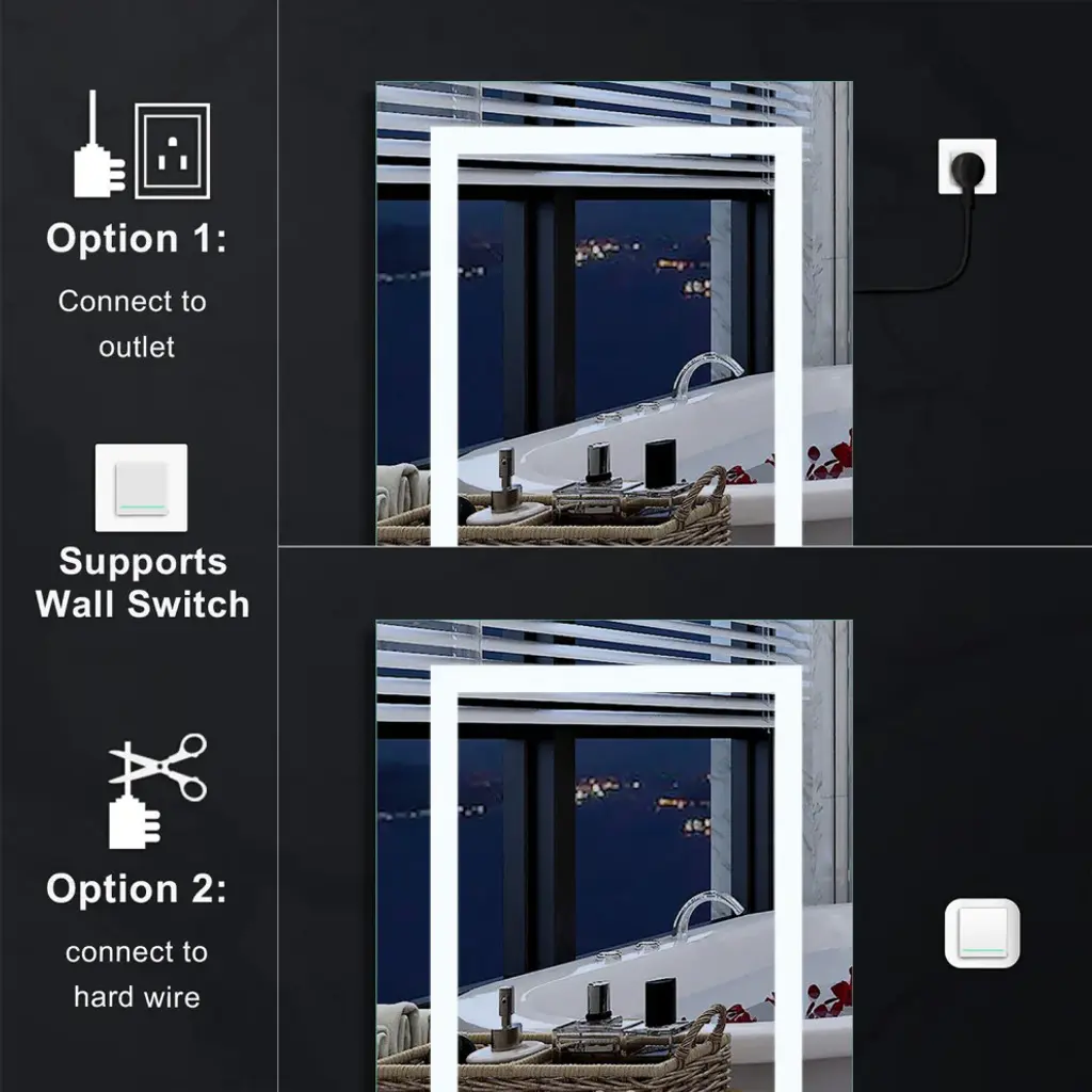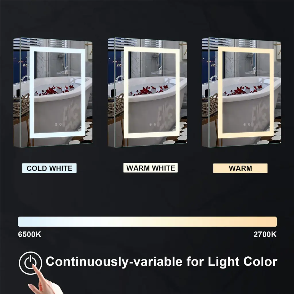 Elevate your bathroom experience with our Premium LED Bathroom Vanity Cabinet. Crafted with precision and attention to detail, this cabinet combines functionality and aesthetics seamlessly. From adjustable lighting to advanced features like motion-sensor activation, this cabinet is designed to enhance your daily routine. With a focus on durability, safety, and energy efficiency, it''s the perfect addition to any modern bathroom.-Continously-variable for light color temperature changes from 2700K-6500K delivers a ideal light.-10%-100% light Dimmable and memory function allows you to control the brightness of light and the brightness state is restored when the light is powered off. -UL certified Exterior LED Strip Light + Interior LED Light guides provide bright lighting. -Large-size Anti-fog pad provides better defogger performance. Anti-fog function is separate controlled and anti-fog power will be automatic shut off after 60 minutes,safe and energy-saving. -Austria BLUM three-dimention adjustable soft-close door right hinges with 110 degree opening capability for easy cabinet access. -Front mirror, inside door mirror and back panel mirror are provide superior visibility. All mirrors are safety backing film mirrors to prevent injury. -Built-in dual outlet and USB charger, conveniently charge your devices directly from the cabinet.-Compatible with Wall-mount and Recessed Mount. -Ip44 Rated Anodized aluminum construction with durable waterproof. -Eco-friendly waterproof copper free clear silver coated mirror glass. Adjustable Tempered-glass shelves. -Interiro LED stripe light goes on/off same time with door(s) open/close by motion sensors from SELF. -Intergraed LED bulbs have an estimated life-expectancy of 50,000 hours. Brightness at 2200 lumens ensures consistent lighting wiht minimum CRI(color redering index) 90+. -Packed with a plug so the cabinet can be installed with plug or hardwired. -ETL-listed for US and Canada, conforms to UL Std. 962, certified to CSA Std. C22.2 No. 250.0. -Two-year limited Warranty.