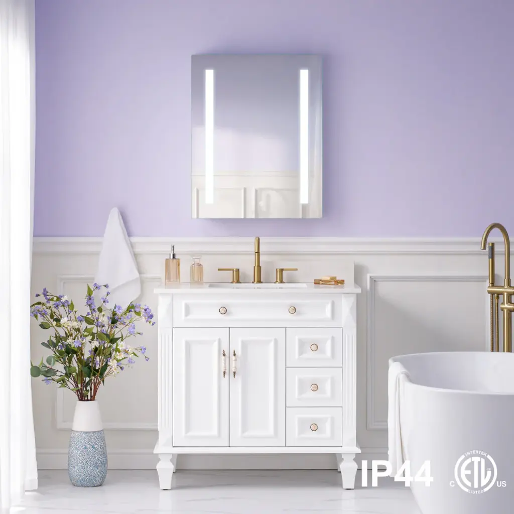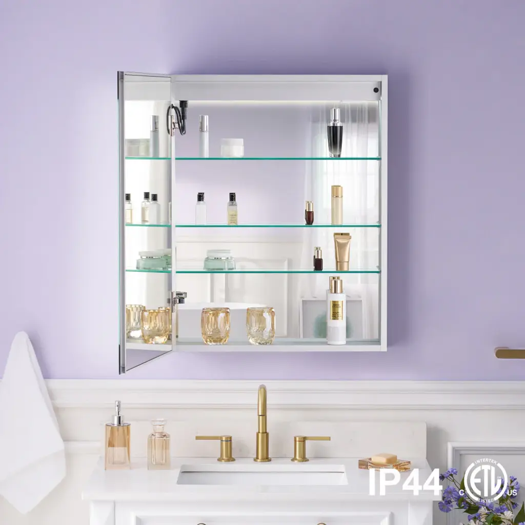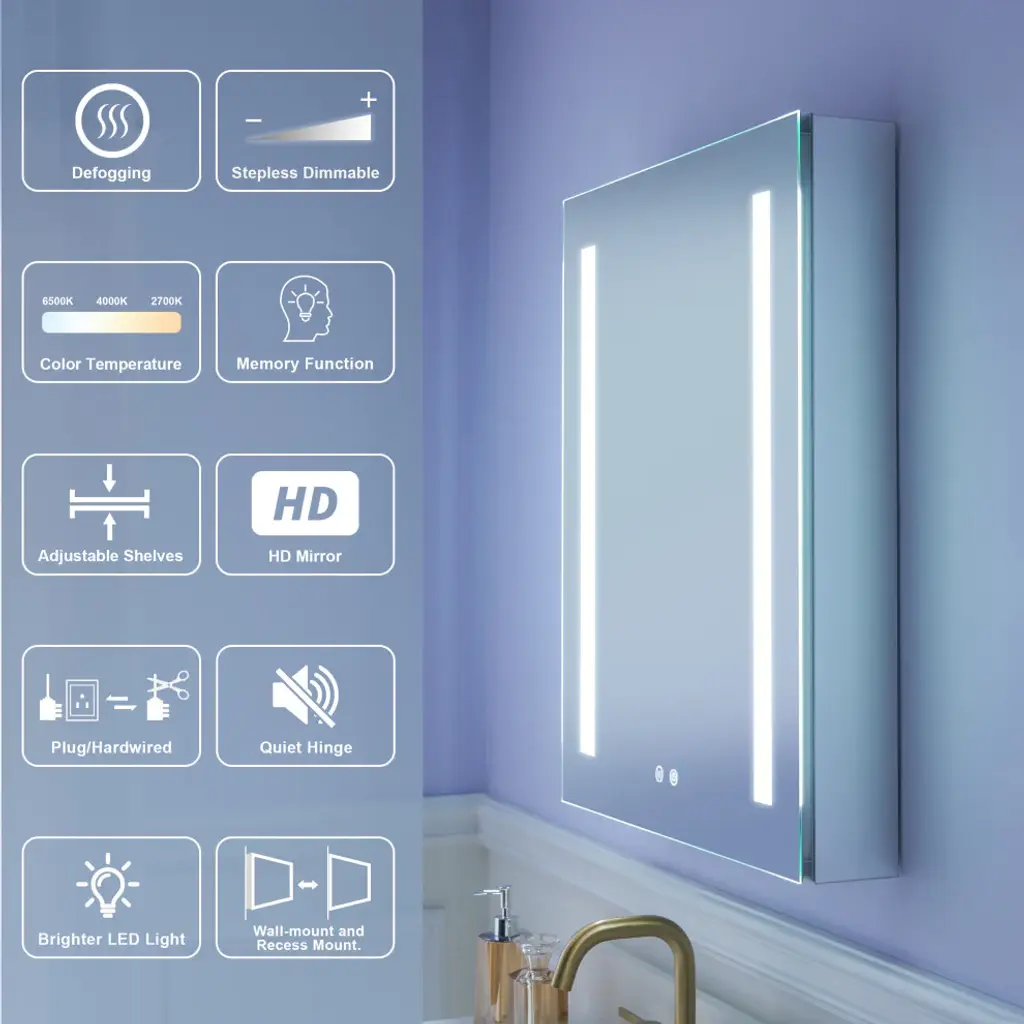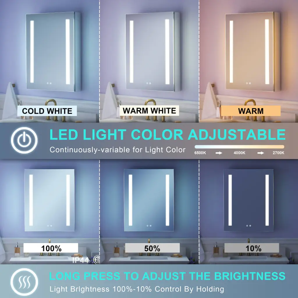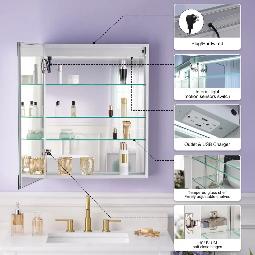 Elevate your bathroom experience with our Premium LED Bathroom Vanity Cabinet. Crafted with precision and attention to detail, this cabinet combines functionality and aesthetics seamlessly. From adjustable lighting to advanced features like motion-sensor activation, this cabinet is designed to enhance your daily routine. With a focus on durability, safety, and energy efficiency, it''s the perfect addition to any modern bathroom.-Continously-variable for light color temperature changes from 2700K-6500K delivers a ideal light.-10%-100% light Dimmable and memory function allows you to control the brightness of light and the brightness state is restored when the light is powered off. -UL certified Exterior LED Strip Light + Interior LED Light guides provide bright lighting. -Large-size Anti-fog pad provides better defogger performance. Anti-fog function is separate controlled and anti-fog power will be automatic shut off after 60 minutes,safe and energy-saving. -Austria BLUM three-dimention adjustable soft-close door right hinges with 110 degree opening capability for easy cabinet access. -Front mirror, inside door mirror and back panel mirror are provide superior visibility. All mirrors are safety backing film mirrors to prevent injury. -Built-in dual outlet and USB charger, conveniently charge your devices directly from the cabinet.-Compatible with Wall-mount and Recessed Mount. -Ip44 Rated Anodized aluminum construction with durable waterproof. -Eco-friendly waterproof copper free clear silver coated mirror glass. Adjustable Tempered-glass shelves. -Interiro LED stripe light goes on/off same time with door(s) open/close by motion sensors from SELF. -Intergrated LED bulbs have an estimated life-expectancy of 50,000 hours. Brightness at 2200 lumens ensures consistent lighting wiht minimum CRI(color redering index) 90+. -Packed with a plug so the cabinet can be installed with plug or hardwired. -ETL-listed for US and Canada, conforms to UL Std. 962, certified to CSA Std. C22.2 No. 250.0. -Two-year limited Warranty.