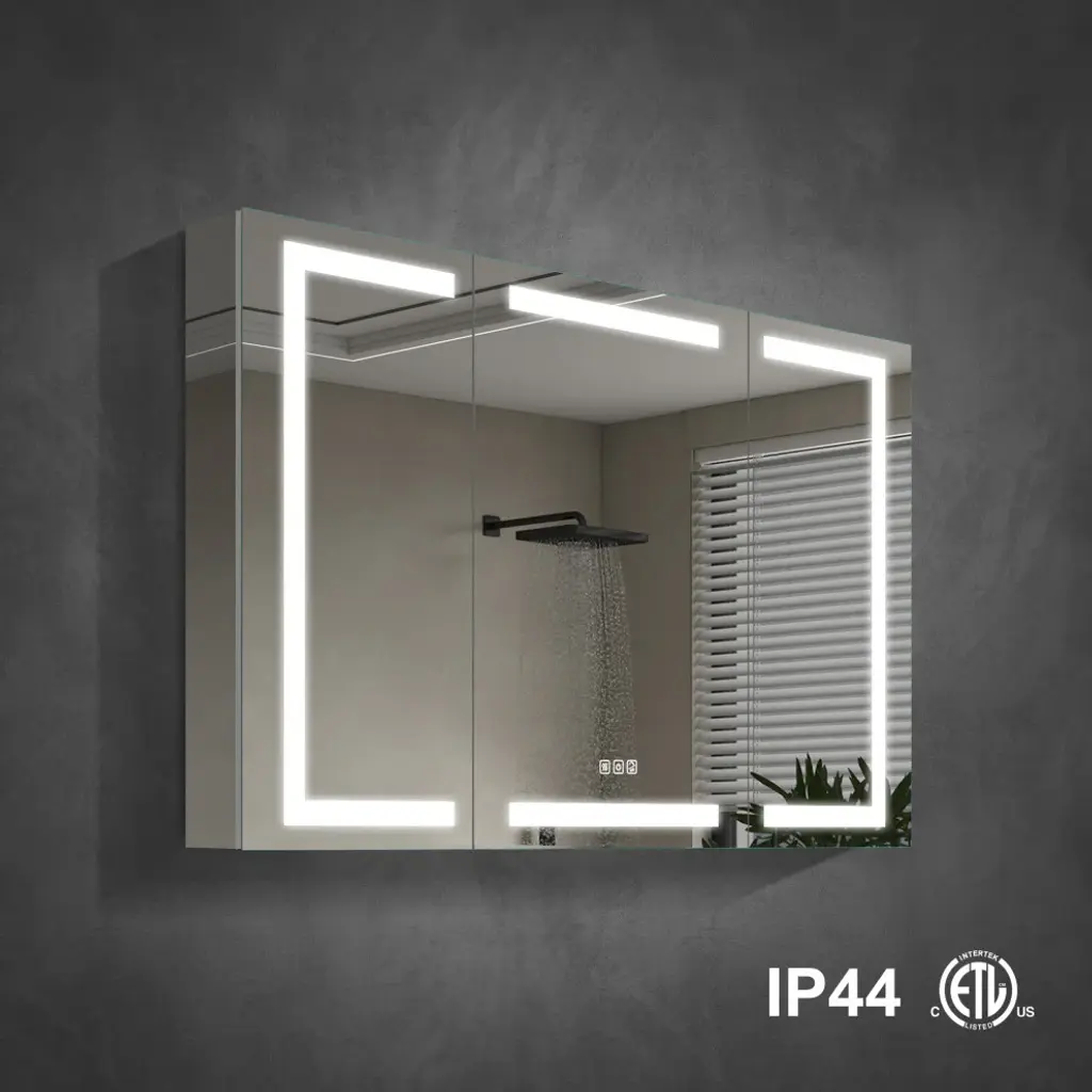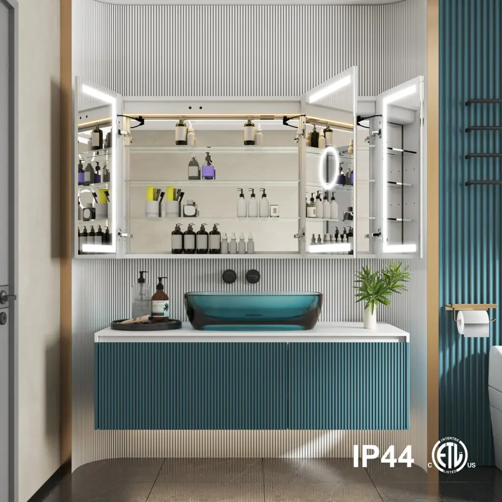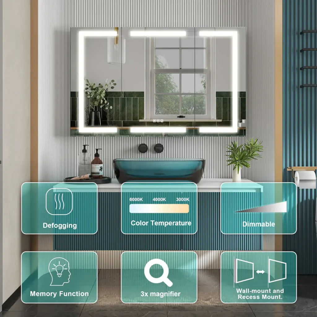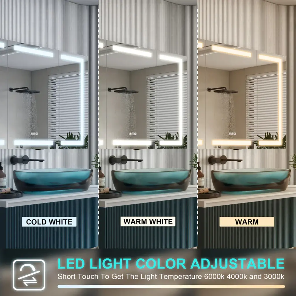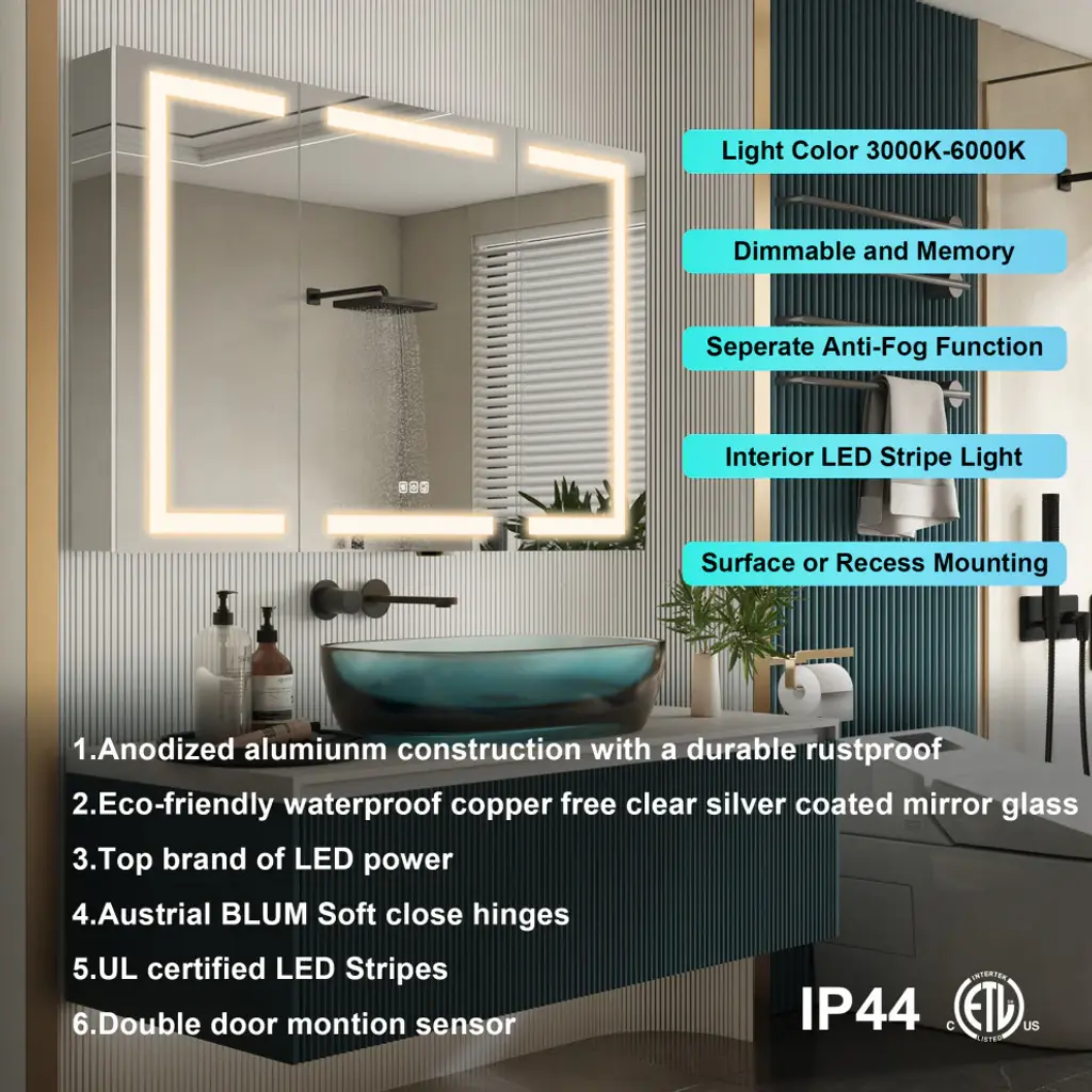 Elevate your bathroom experience with our Premium LED Bathroom Vanity Cabinet. Crafted with precision and attention to detail, this cabinet combines functionality and aesthetics seamlessly. From adjustable lighting to advanced features like motion-sensor activation, this cabinet is designed to enhance your daily routine. With a focus on durability, safety, and energy efficiency, it''s the perfect addition to any modern bathroom.-Continously-variable for light color temperature changes from 2700K-6500K delivers a ideal light.-10%-100% light Dimmable and memory function allows you to control the brightness of light and the brightness state is restored when the light is powered off. -UL certified Exterior LED Strip Light + Interior LED Light guides provide bright lighting. -Large-size Anti-fog pad provides better defogger performance. Anti-fog function is separate controlled and anti-fog power will be automatic shut off after 60 minutes,safe and energy-saving. -Austria BLUM three-dimention adjustable soft-close door right hinges with 110 degree opening capability for easy cabinet access. -Front mirror, inside door mirror and back panel mirror are provide superior visibility. All mirrors are safety backing film mirrors to prevent injury. -Built-in dual outlet and USB charger, conveniently charge your devices directly from the cabinet.-Compatible with Wall-mount and Recessed Mount. -Ip44 Rated Anodized aluminum construction with durable waterproof. -Eco-friendly waterproof copper free clear silver coated mirror glass. Adjustable Tempered-glass shelves. -Interiro LED stripe light goes on/off same time with door(s) open/close by motion sensors from SELF. -Intergraed LED bulbs have an estimated life-expectancy of 50,000 hours. Brightness at 2200 lumens ensures consistent lighting wiht minimum CRI(color redering index) 90+. -Packed with a plug so the cabinet can be installed with plug or hardwired. -ETL-listed for US and Canada, conforms to UL Std. 962, certified to CSA Std. C22.2 No. 250.0. -Two-year limited Warranty.