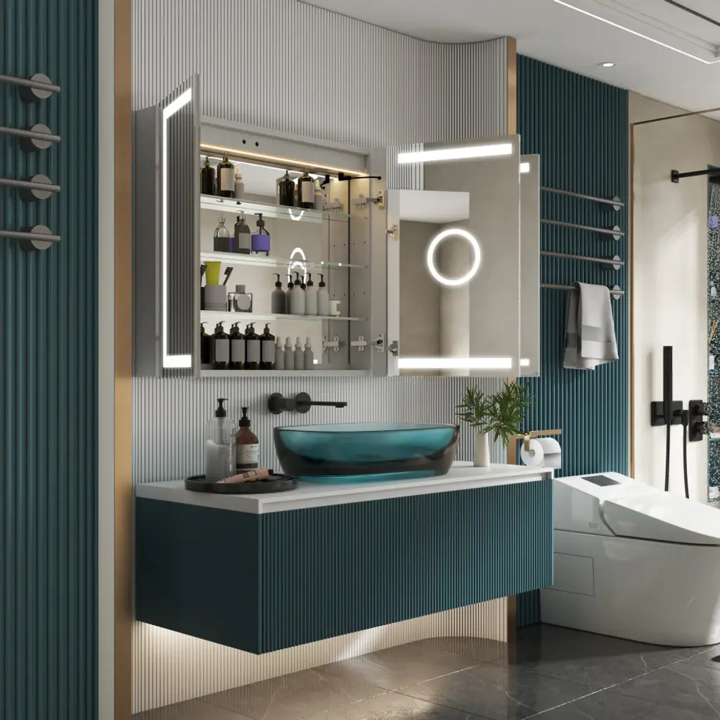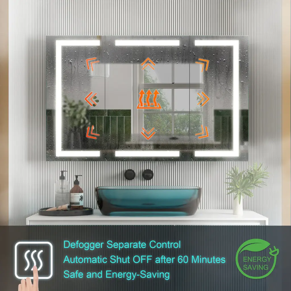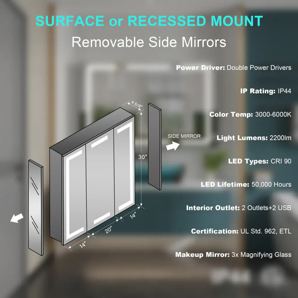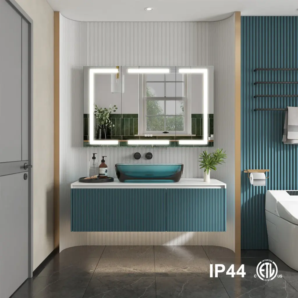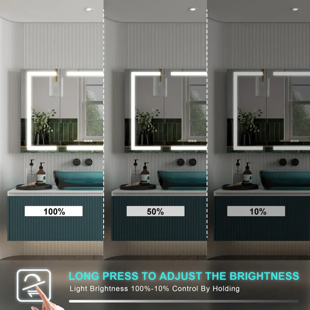 Elevate your bathroom experience with our Premium LED Bathroom Vanity Cabinet. Crafted with precision and attention to detail, this cabinet combines functionality and aesthetics seamlessly. From adjustable lighting to advanced features like motion-sensor activation, this cabinet is designed to enhance your daily routine. With a focus on durability, safety, and energy efficiency, it''s the perfect addition to any modern bathroom.-Continously-variable for light color temperature changes from 2700K-6500K delivers a ideal light.-10%-100% light Dimmable and memory function allows you to control the brightness of light and the brightness state is restored when the light is powered off. -UL certified Exterior LED Strip Light + Interior LED Light guides provide bright lighting. -Large-size Anti-fog pad provides better defogger performance. Anti-fog function is separate controlled and anti-fog power will be automatic shut off after 60 minutes,safe and energy-saving. -Austria BLUM three-dimention adjustable soft-close door right hinges with 110 degree opening capability for easy cabinet access. -Front mirror, inside door mirror and back panel mirror are provide superior visibility. All mirrors are safety backing film mirrors to prevent injury. -Built-in dual outlet and USB charger, conveniently charge your devices directly from the cabinet.-Compatible with Wall-mount and Recessed Mount. -Ip44 Rated Anodized aluminum construction with durable waterproof. -Eco-friendly waterproof copper free clear silver coated mirror glass. Adjustable Tempered-glass shelves. -Interiro LED stripe light goes on/off same time with door(s) open/close by motion sensors from SELF. -Intergraed LED bulbs have an estimated life-expectancy of 50,000 hours. Brightness at 2200 lumens ensures consistent lighting wiht minimum CRI(color redering index) 90+. -Packed with a plug so the cabinet can be installed with plug or hardwired. -ETL-listed for US and Canada, conforms to UL Std. 962, certified to CSA Std. C22.2 No. 250.0. -Two-year limited Warranty.