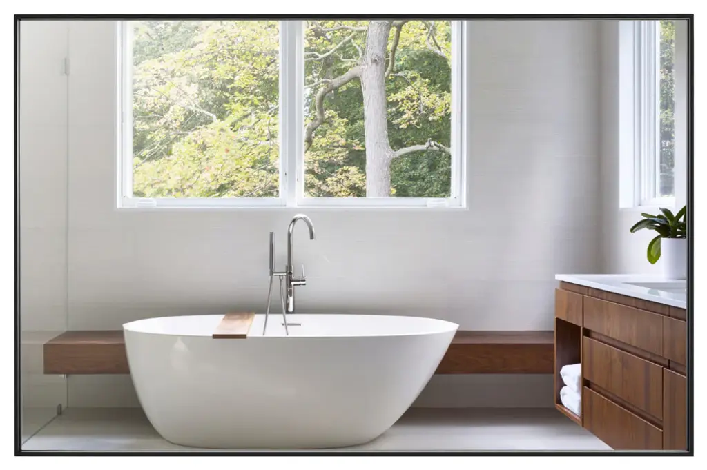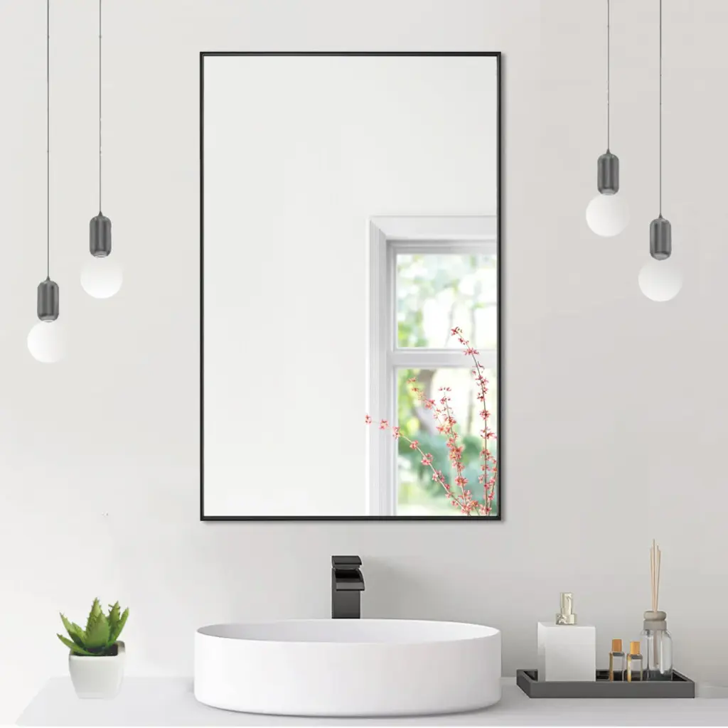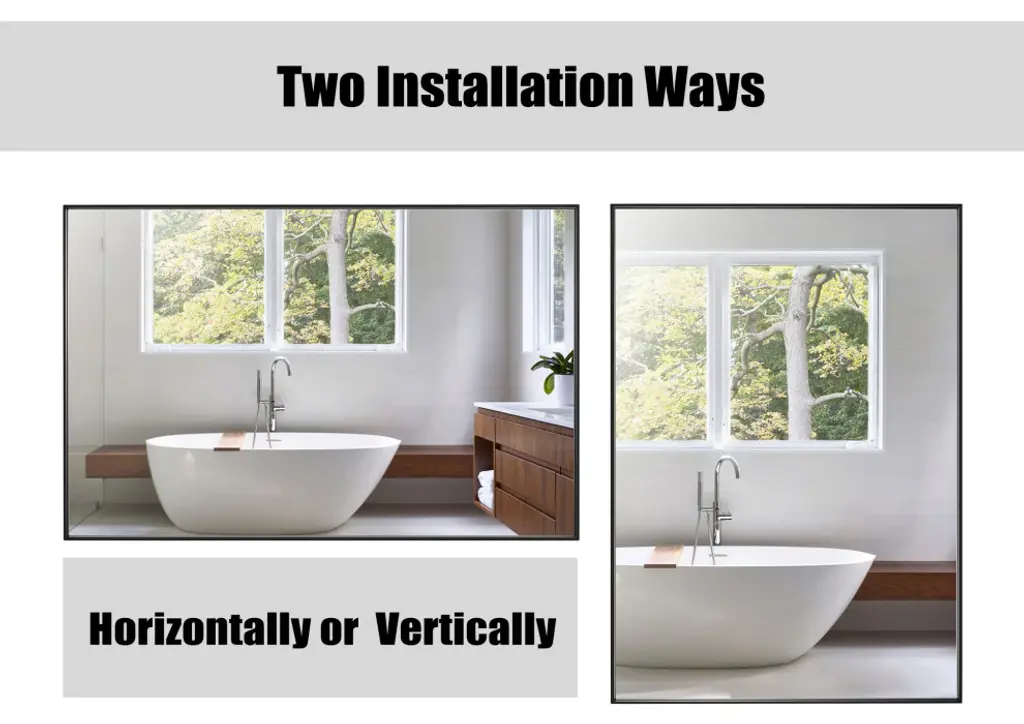 Add simple sophistication to any interior in an instant with this sleek modern framed mirror. Made of premium aluminum and mirror materials, the mirror is durable, waterproof and non-rusting. The mirror edge is protected by the aluminum frame from breaking and ensure beauty. Each piece has been polished carefully and metal bracket is pre-install on the back of the mirror. Perfect for use in bathroom, vanity, bedroom, living room, entrance. Features:High definition glass provides clear image without distortion;Anti-explosion layer helps to prevent the mirror from breaking;Mirror can be installed horizontally or vertically according to your demand;Hooks are pre-installed behind the backboard for a secure and stable installation;