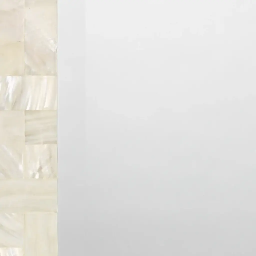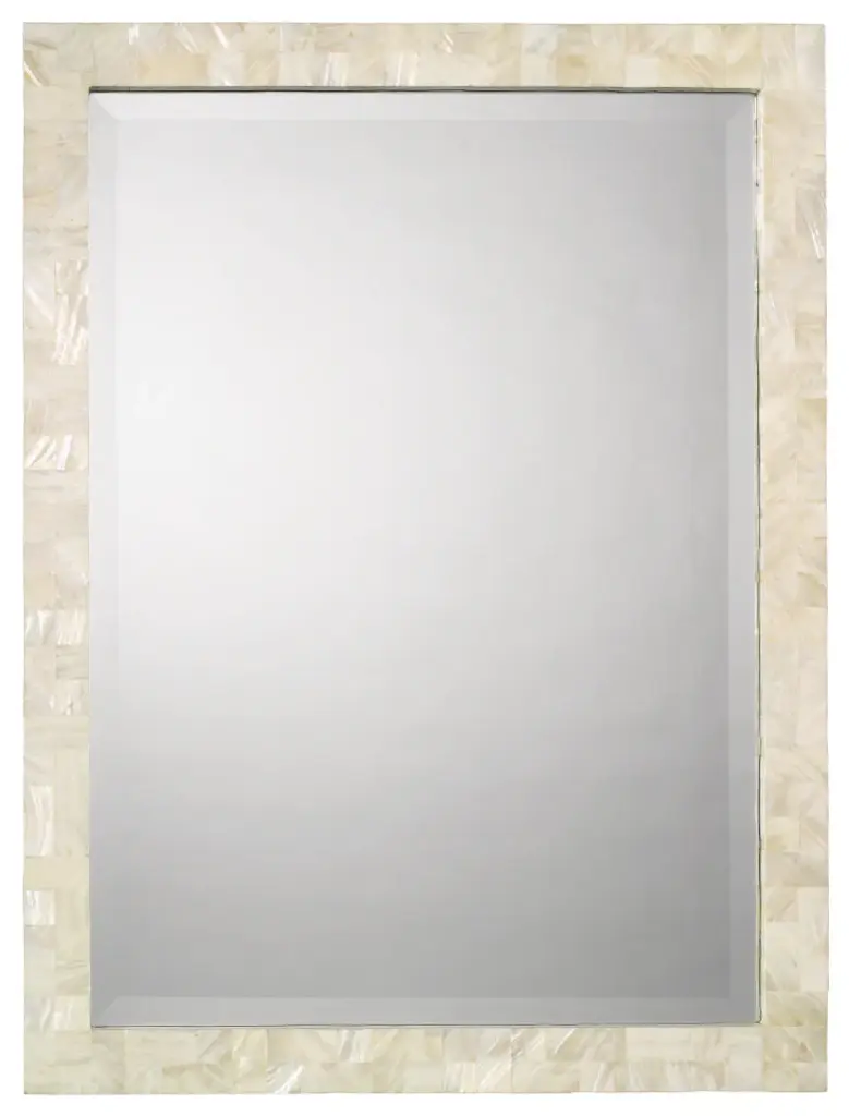 Iridescent mother-of-pearl is cut, arranged and polished by hand to create a stunning accent mirror. Its lustrous cream-colored hues look striking when paired with contemporary furnishings in the entryway, bedroom or living room. •Handcrafted of natural Mother of Pearl•Beveled glass mirror•Mirror can hang vertical or horizontalMother of pearl is the iridescent substance that forms the lining of the shells found in both fresh water and salt water mollusks. The inherent variations in tone and texture found in Mother of Pearl are preserved, to create pieces rich in detail and natural beauty. These unique imperfections give our products character and individuality, with each piece having its own personality. •Mirror Surface: 28.75"H x 20.75W"•D-Loop Hanging Mechanism•Frame: 2"W•MDF BackingCare Instructions: Wipe frame with a soft, dry cloth. Wipe glass with standard glass cleaner. DO NOT use cleaners or abrasives on mirror frame.