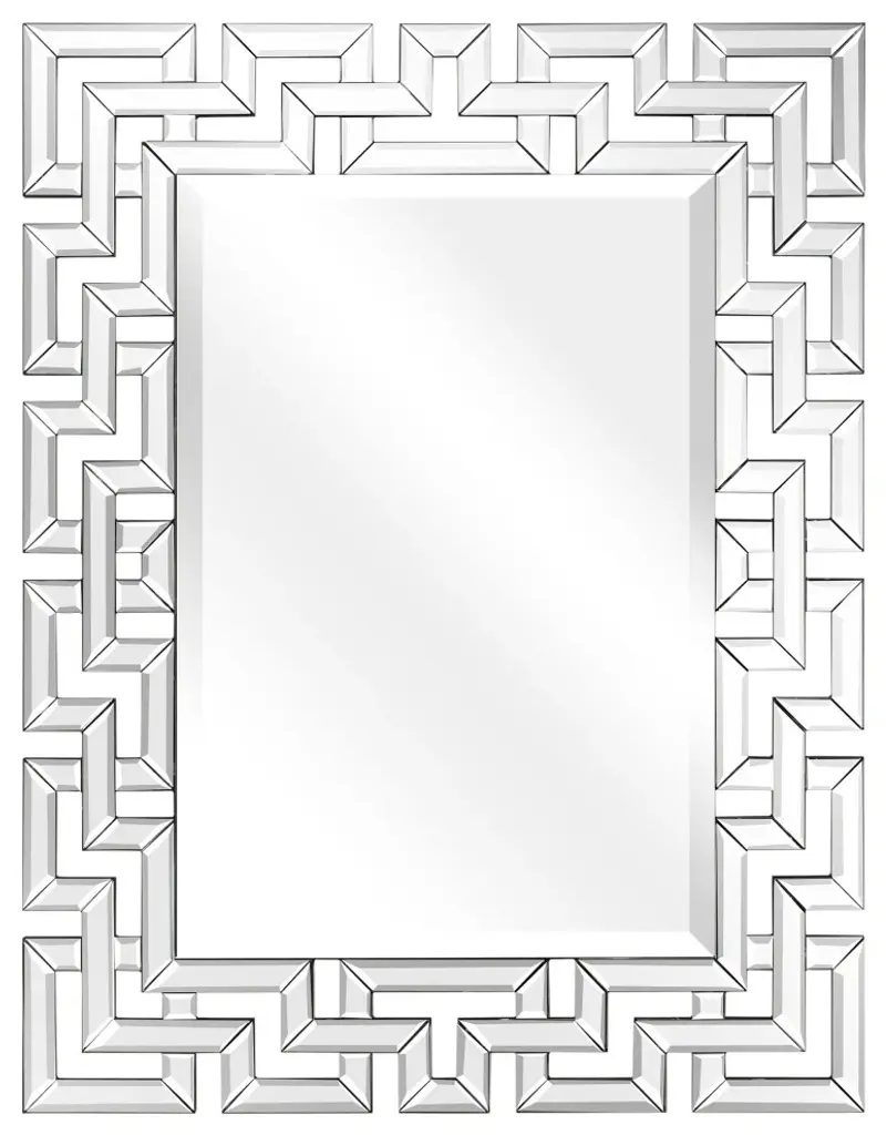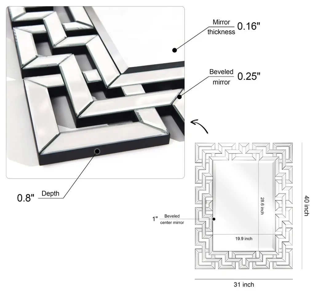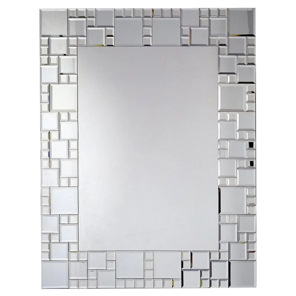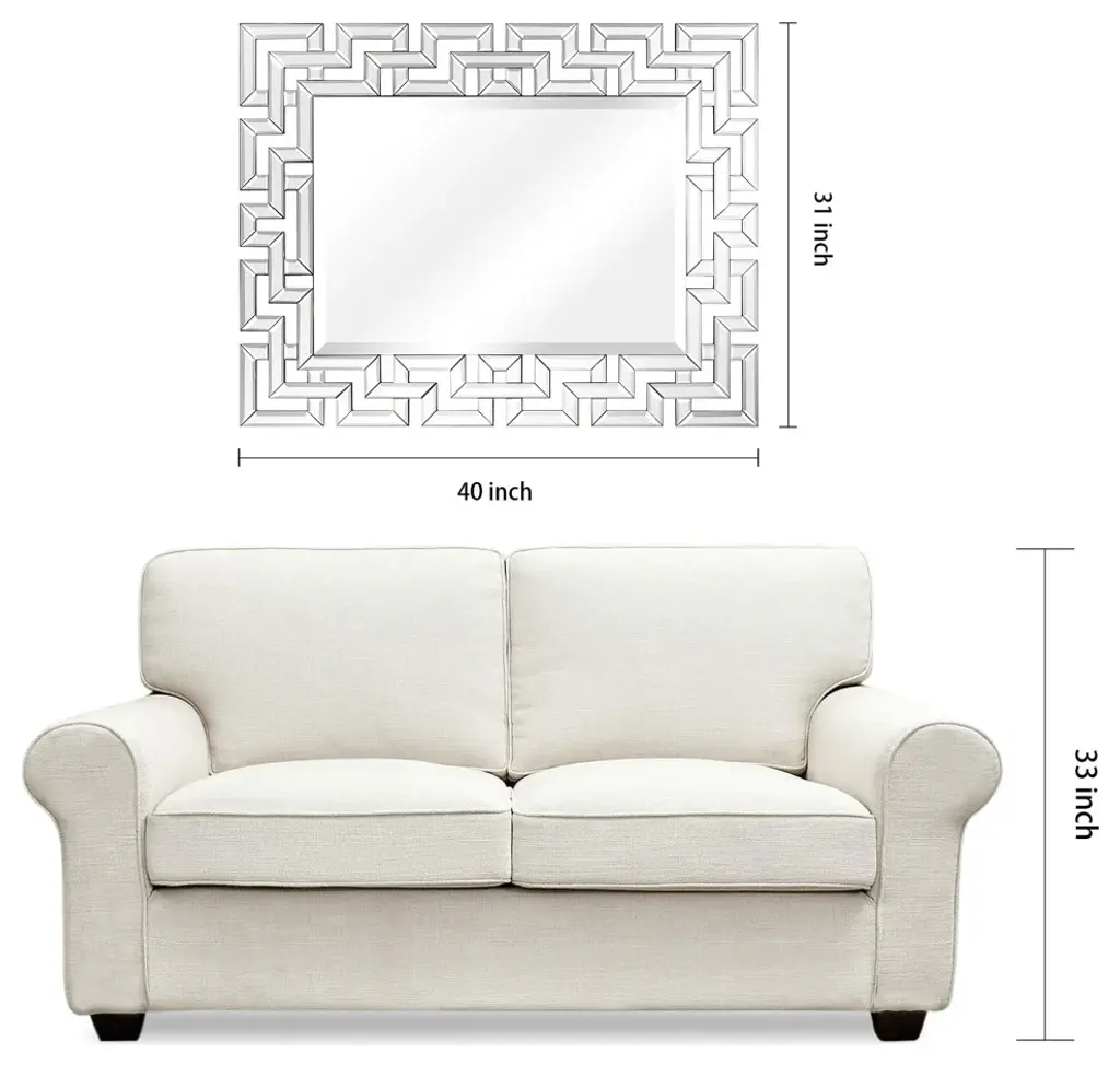 The mirror is made up of a network of interlocking mirrored squares creating a elegantly ornate open-work frame. It features Geometric form mirrored panels, It is a perfect accent piece for an entryway, bathroom, bedroom or any room in your home. 4 Hooks are affixed to the back of the mirror so it is ready to hang right out of the box in a square or diamond orientation! Each mirrored panel on this piece has a small bevel adding to its beauty and style.