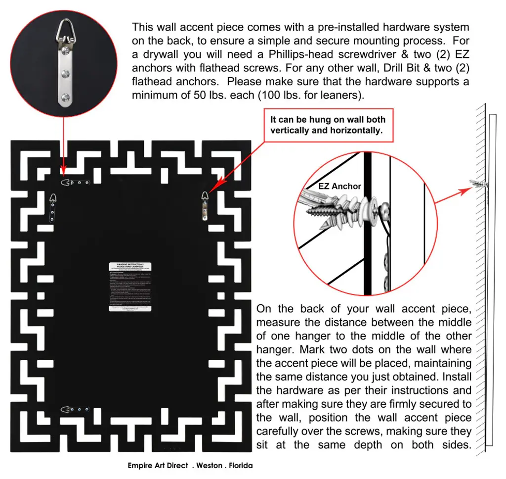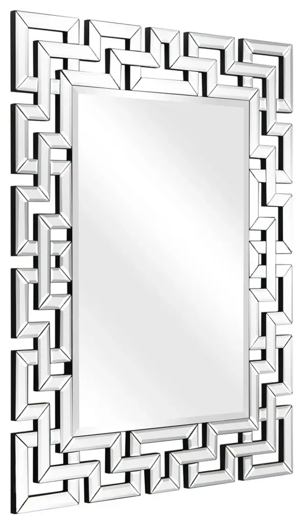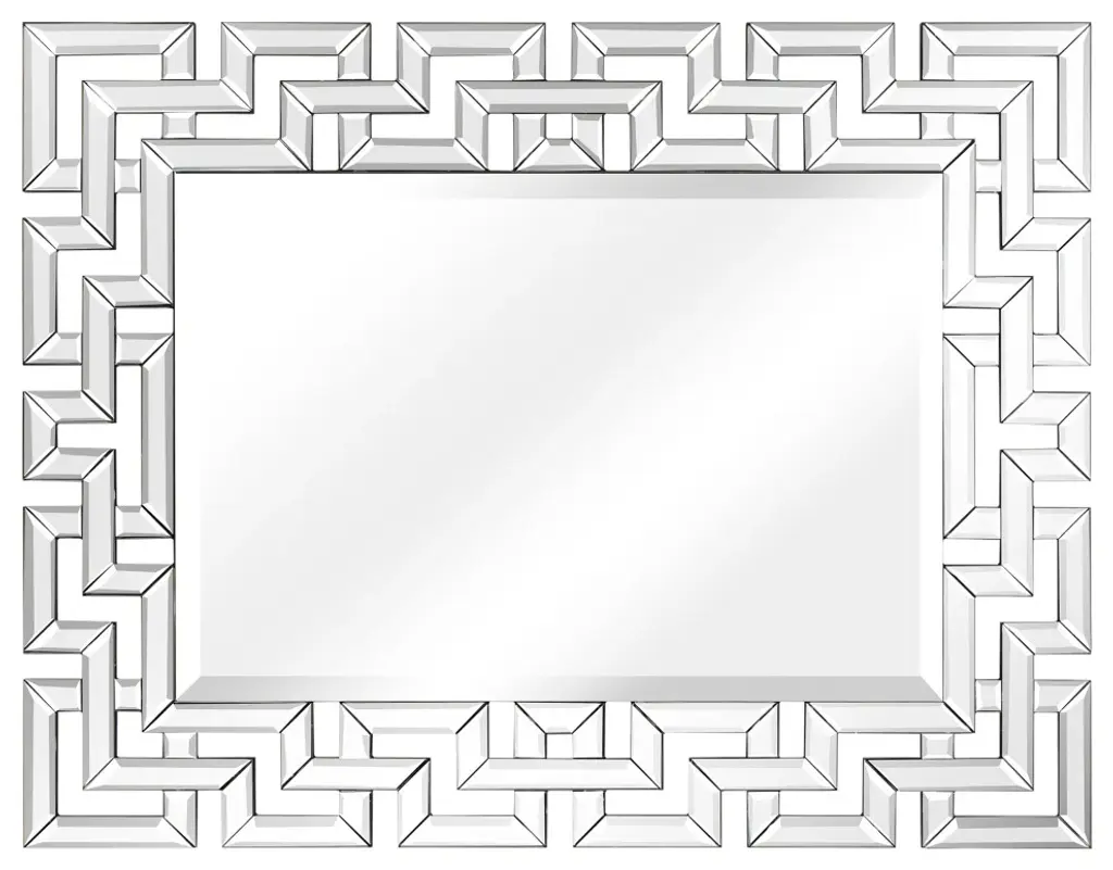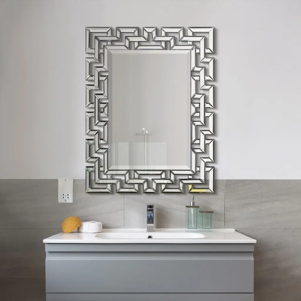 The mirror is made up of a network of interlocking mirrored squares creating a elegantly ornate open-work frame. It features Geometric form mirrored panels, It is a perfect accent piece for an entryway, bathroom, bedroom or any room in your home. 4 Hooks are affixed to the back of the mirror so it is ready to hang right out of the box in a square or diamond orientation! Each mirrored panel on this piece has a small bevel adding to its beauty and style.