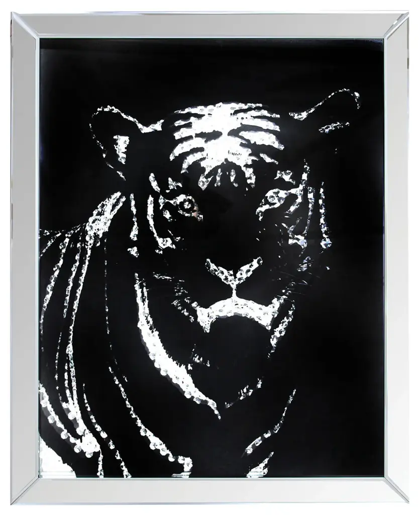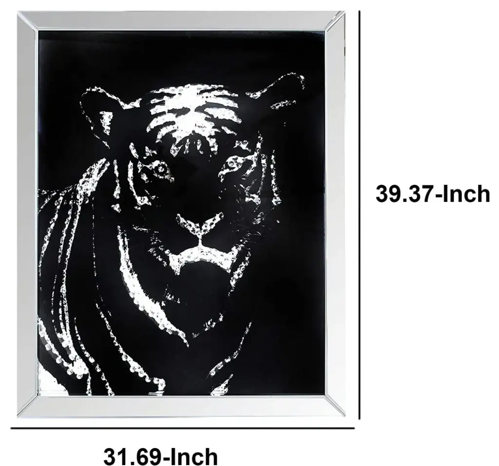 Rectangular Mirror framed Tiger Wall Dcor With Crystal Inlays, Black & SilverAdd interest to your living space with this elegant Tiger Wall Dcor. The dramatically casted Tiger shaped mirror is the perfect contrast against its black background. Faceted optic glass faux crystals adorn the Tiger, layering it with added luxe and brilliance. To complete the look of this wall decor, a beveled mirrored border frames the piece and creates an intricate play of light and refection. This Wall Decor is sure to be the focal point of any room.
