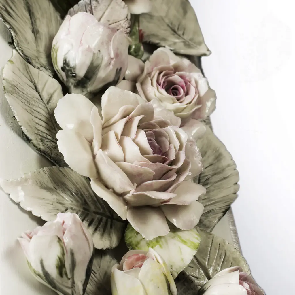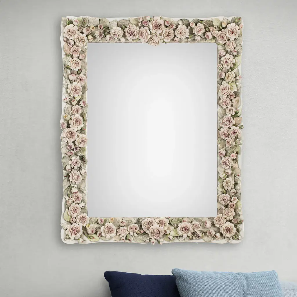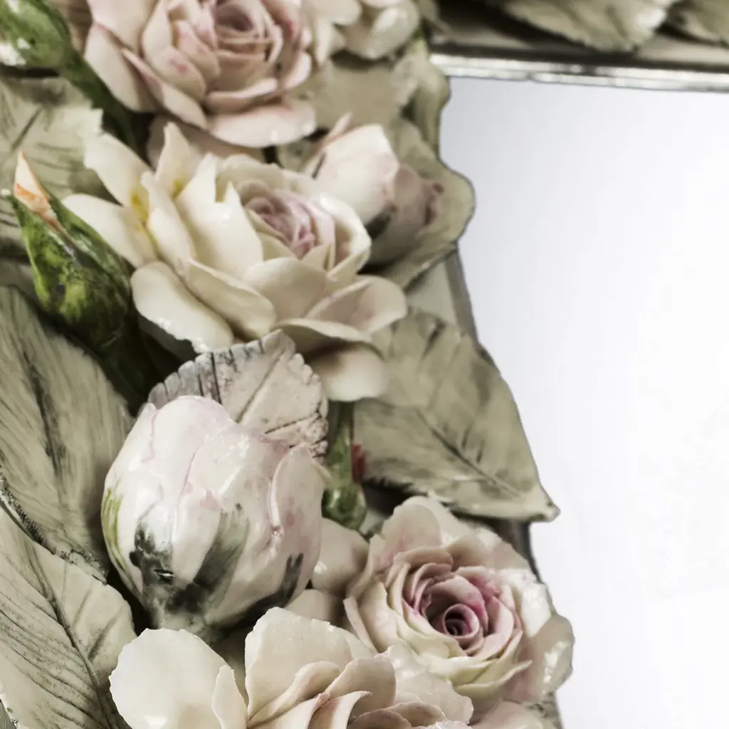 A luxuriant garland of blossoming, pink roses and green foliage in fine Capodimonte porcelain distinguishes the romantic and rich design of the rectangular frame enveloping this mirror. Minutely handmade by expert, specialized artisans, it sports an ultra-realistic silhouette that seemingly allows for smelling the fragrance of the roses. Feminine and bold, it makes for a stupefying addition to classic or eclectic settings.