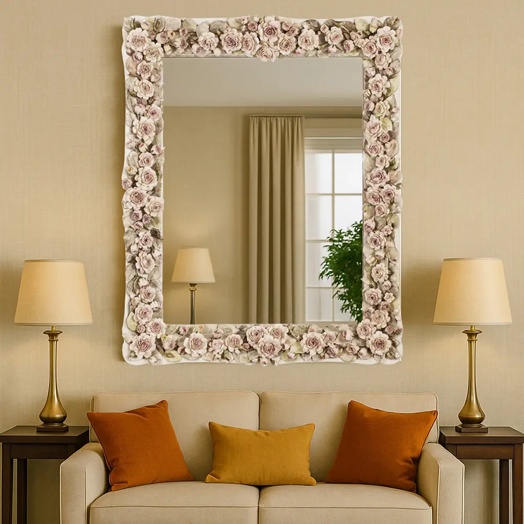 Rectangular Mirror With Capodimonte Porcelain Roses And Porcelain-White Lacquer Finish