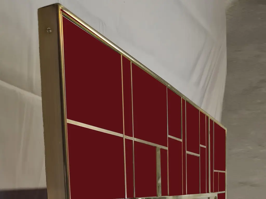 This exquisite Cartier red Murano glass mirror, made in Italy, embodies modern elegance with its Murano glass panels painted and carved in hand-squared shapes. The mirror's design is accentuated by elegant brass accents and a polished solid brass frame, creating a striking contrast that enhances its contemporary appeal. Made using traditional Italian techniques, this piece is a testament to the art and craftsmanship of Murano glassmakers. The use of birch frame, brass and art glass ensures a unique and luxurious finish. This handcrafted mirror is available for those who appreciate fine Italian design and wish to elevate their decor.