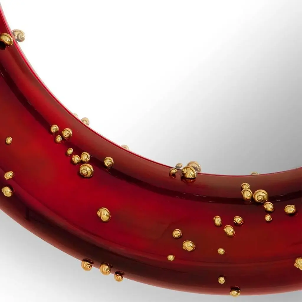 Mirror Red with carved wooden frame withred-dark glossy varnished with clear round mirror glass. Decorated with small snails inpolished solid brass all around the frame.