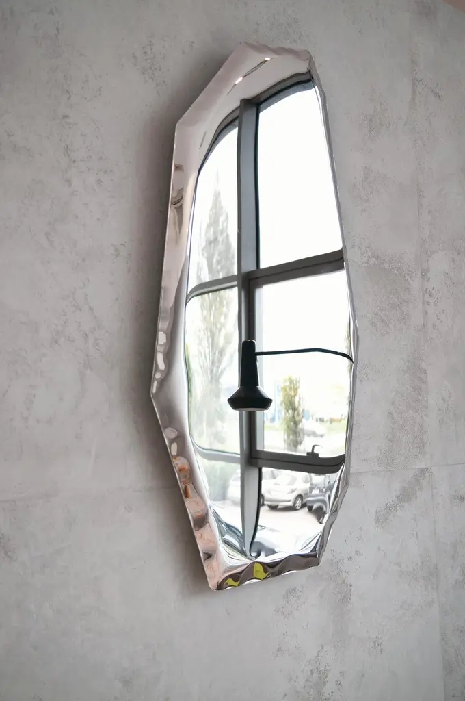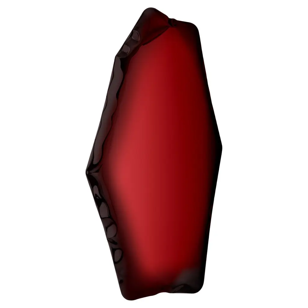 Red Rubin C2 sculptural wall mirror by ZietaDimensions: D 6 x W 94 x H 149 cm Material: Stainless steel. Finish: Red Rubin.Available in finishes: Stainless Steel, Deep Space Blue, Emerald, Saphire, Saphire/Emerald, Dark Matter, and Red Rubin. Also available in different sizes. Steel mirror in the form of a fragmented glass or rock – TAFLA C mirror by Zieta Studio is a modern uncompromising object. It is a wall sculpture that can be arranged in personalized groups to create artistic installations in private and public spaces.In the Transitions Collection, these unusual mirrors in various sizes and shapes are available in two colors: Red Rubin and Dark Matter. TAFLA C Red Rubin mirror resembles a piece of ruby, while the TAFLA C Dark Matter is like a gate to another dimension. This collection of mirrors will be a perfect decoration for a home with style or for a public space that aims to stand out in the crowd.The geometric TAFLA C comes in seven different sizes – it can be arranged in an artistic personalized composition or exposed on a wall as a single sculpture-like mirror.About Zieta: Zietas main goal is to deliver uniqueness and customization in design and construction while keeping the production, transport, and warehousing innovatively efficient.This is how they imagine the future world: Light, durable structures of customized applications produced on demand out of one-of-a-kind parts, yet efficiently.They use a computer-controlled production process. Customized pattern, customized form, customized function, one-of-a-kind product, and outstanding precision are what they deliver.You will find all of this philosophy reflected in the products. The research, they discover new possibilities, they play with forms and they deliver a beautiful, innovative, surprising outcome to people who love the design and who care about design development.They believe their work is a valuable contribution to the world of design not only by the unique beauty of the forms but most of all by opening ultra-innovative opportunities of forming and new paths for the world of the future.