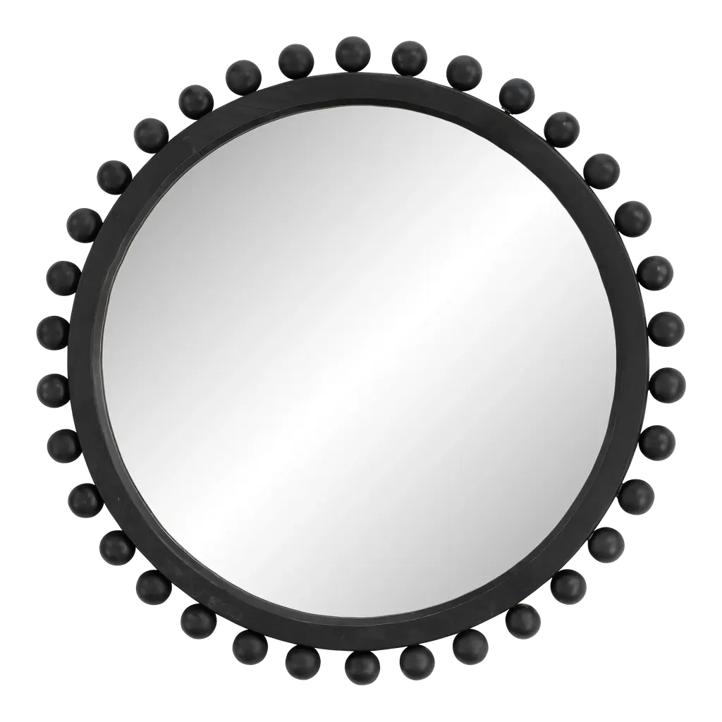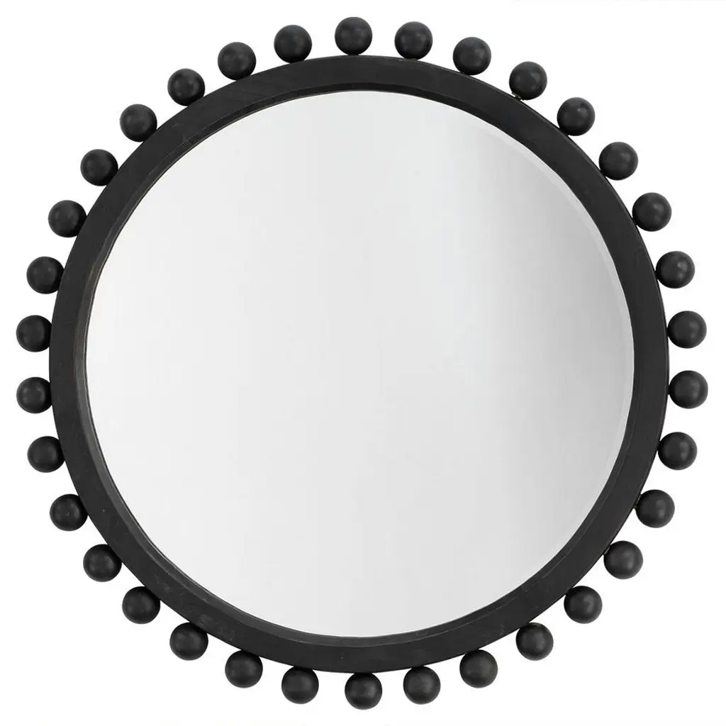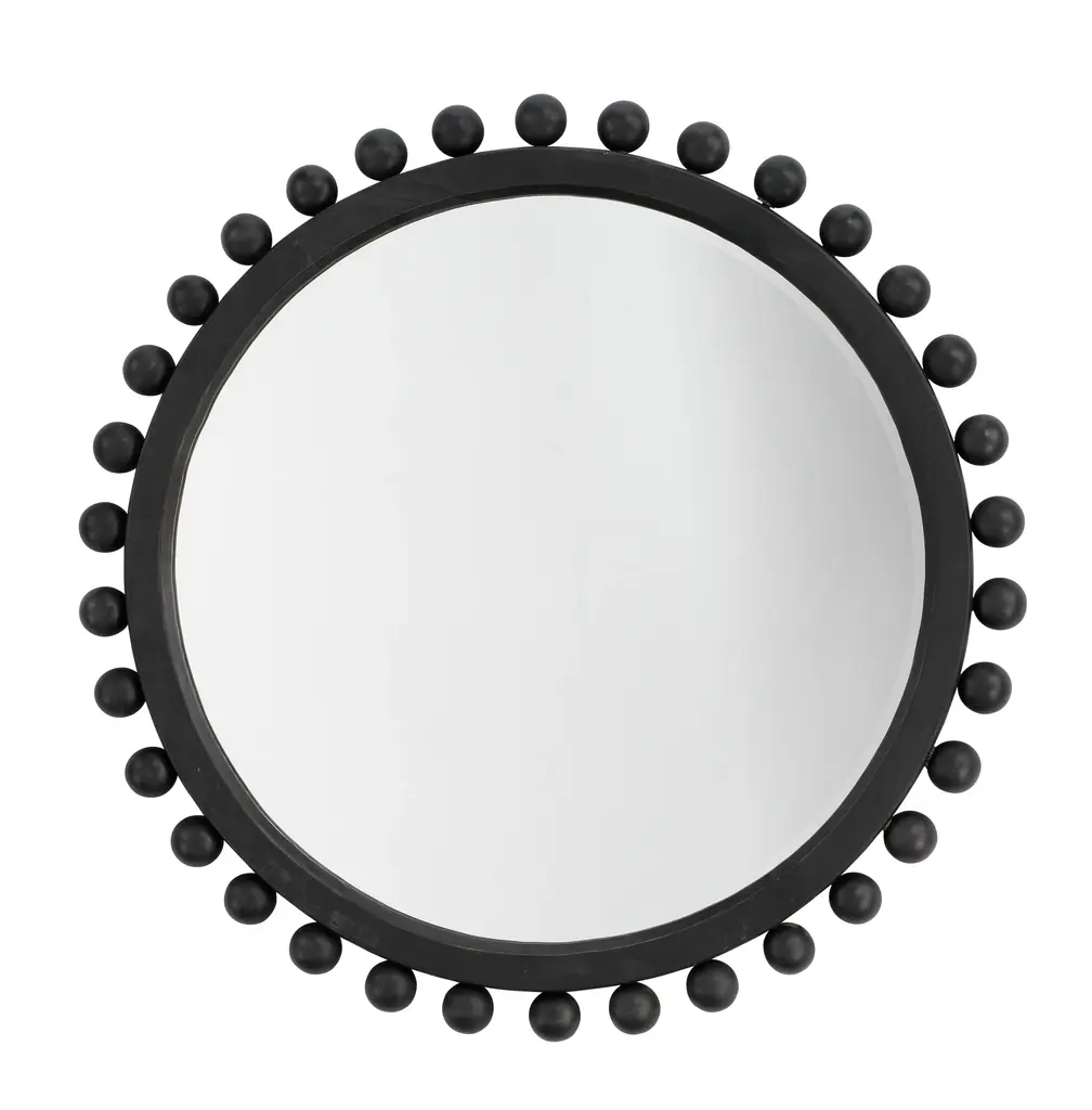 The Renn Wall Mirror features a rectangular shape with an arched top and is studded with whimsical wooden spheres. The mirror frame features a black finish.Features:This wall mirror features boho stylingFeatures a black frame constructed with woodNo assemblyFor over a century, Bassett Mirror has been synonymous with style and quality, transforming homes with its sophisticated and timeless designs. With a wide-ranging collection of furniture, lighting, mirrors, and art, Bassett Mirror seamlessly blends modern style with classic appeal. From rustic modern to luxe glam, each piece is thoughtfully crafted to inspire and elevate any space. Committed to exceptional value and customer care, Bassett Mirror makes it easy for homeowners to create beautiful, personalized interiors with confidence.