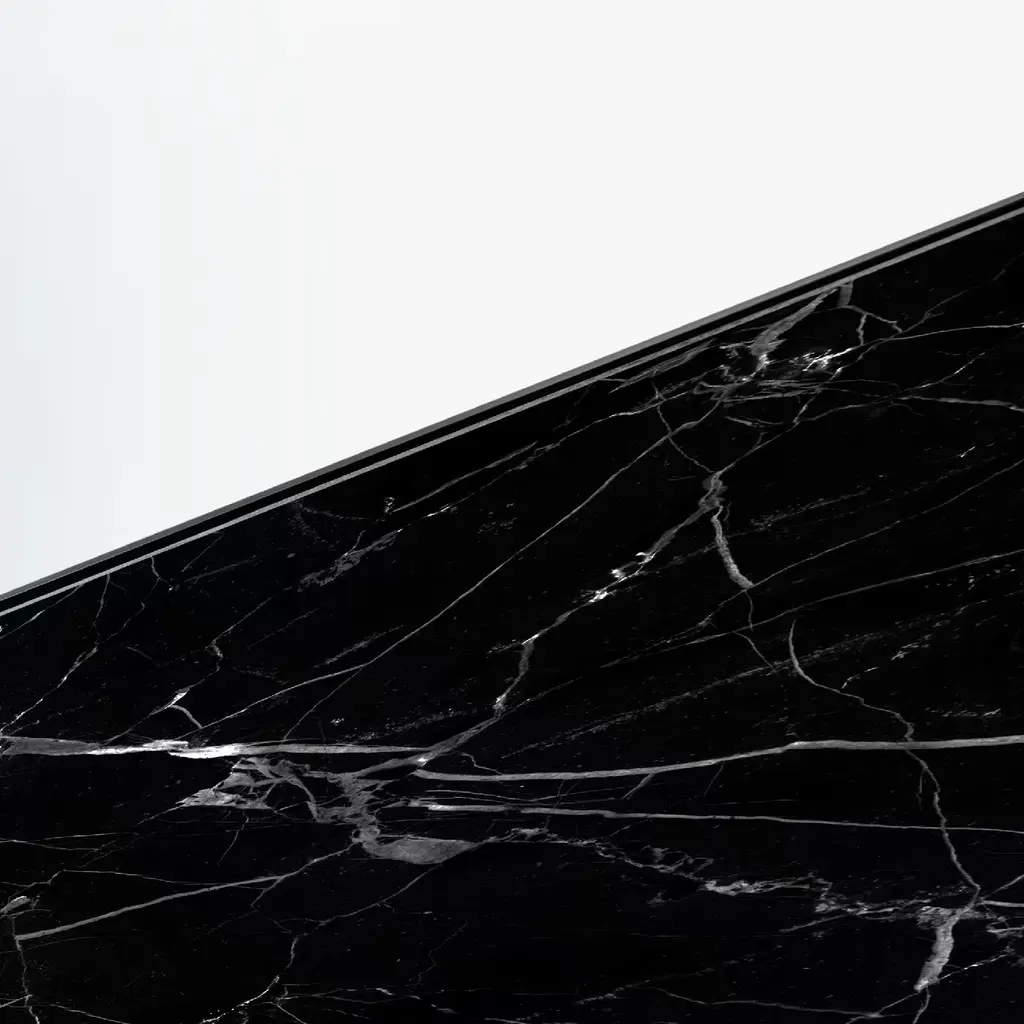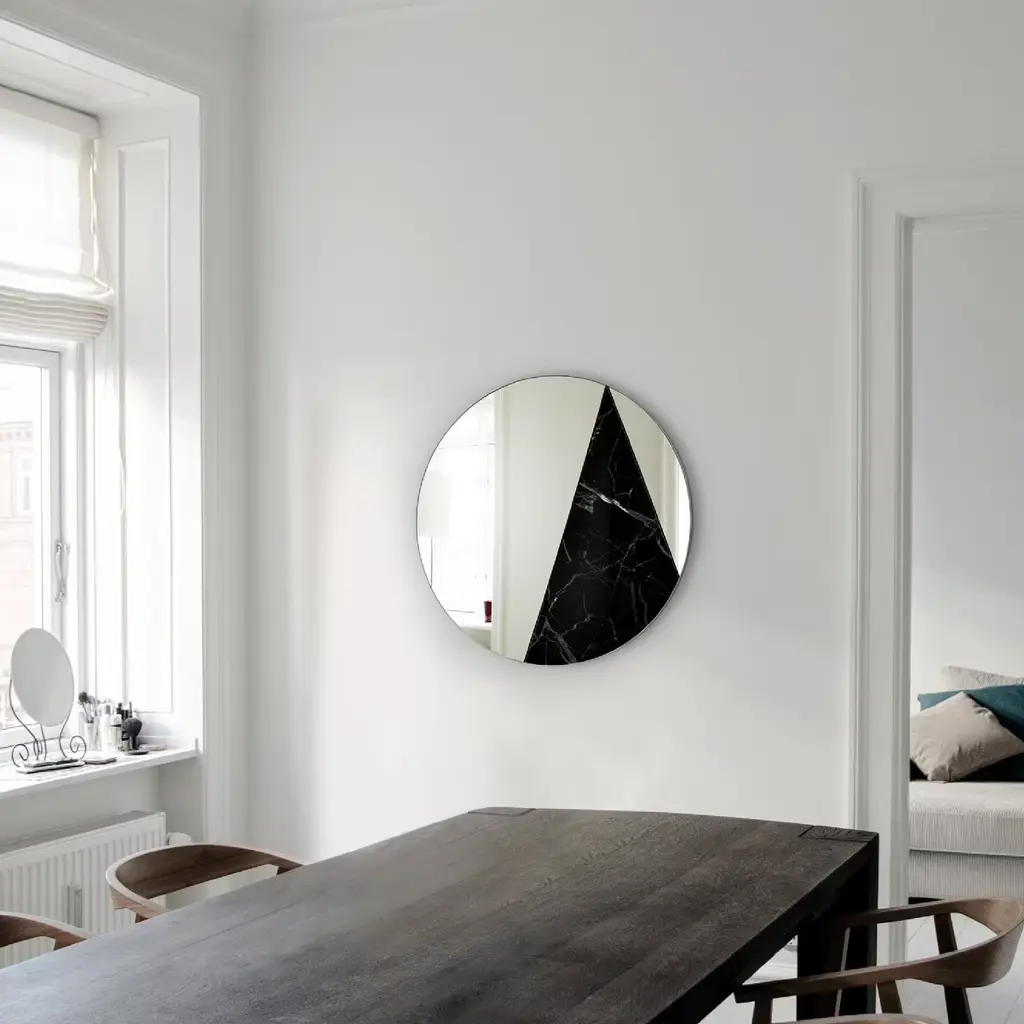 This stunning mirror is part of the Res Collection, from the Latin word for substance. Marked by the dynamic interplay of the mirrored surface and black Marquina marble, this piece is a superb object of functional decor that will enliven a refined interior. Its round shape comprises a wooden base on which the precious stone and the mirrored glass elements are arranged in a steel frame. Showcased in a retro-chic entryway, a classic study, or a contemporary living room, this mirror will not go unnoticed.