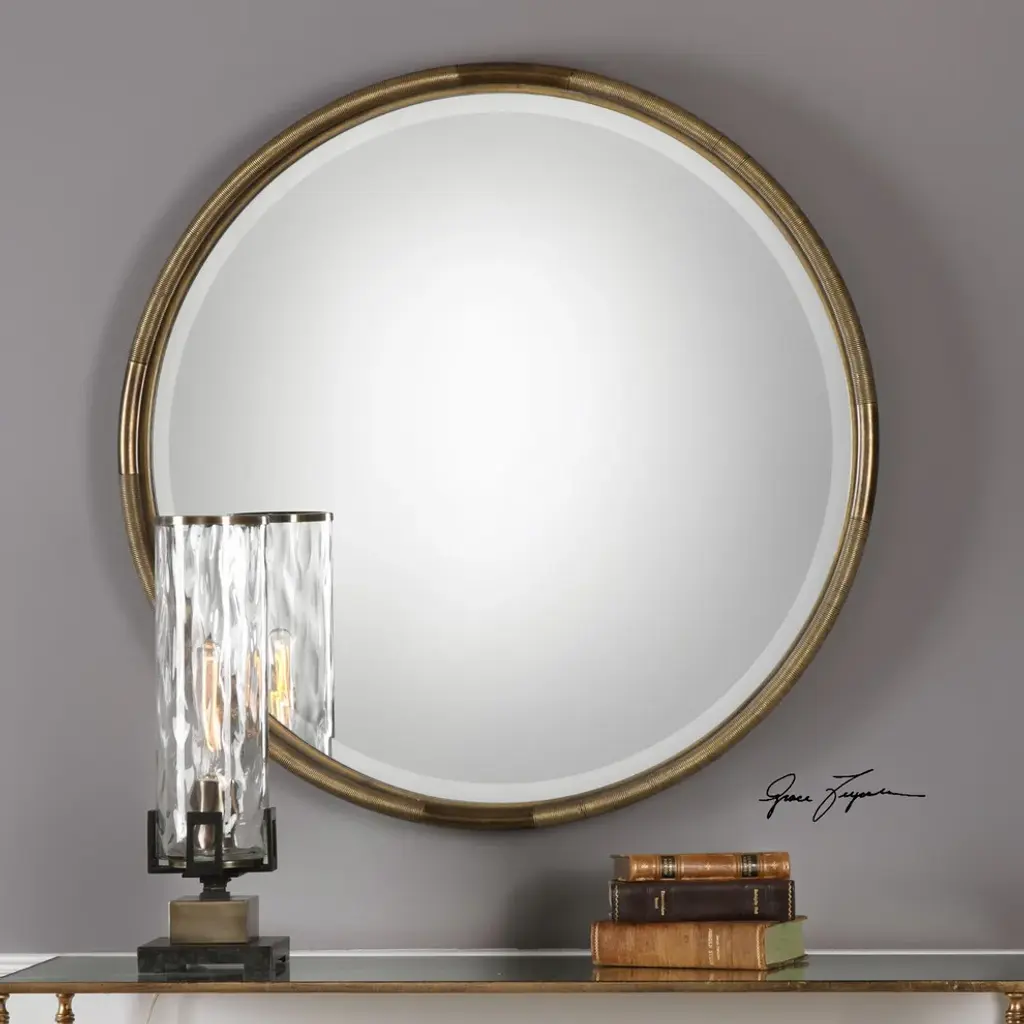 Heavy iron coils surround a petite flat iron inner frame, all hand finished in a lightly antiqued gold leaf. Mirror features a generous 1 1/4" bevel. - 35. 6" diameter x 2. 25" deep. Weighs approximately 32 lbs- Forged iron frame with Hardwood composite backing. - Properly Weighted Hanging Hardware Attached. - Heirloom Quality - Expertly hand crafted and hand finished. Due to the hand crafted nature of this piece, each piece may have subtle differences.