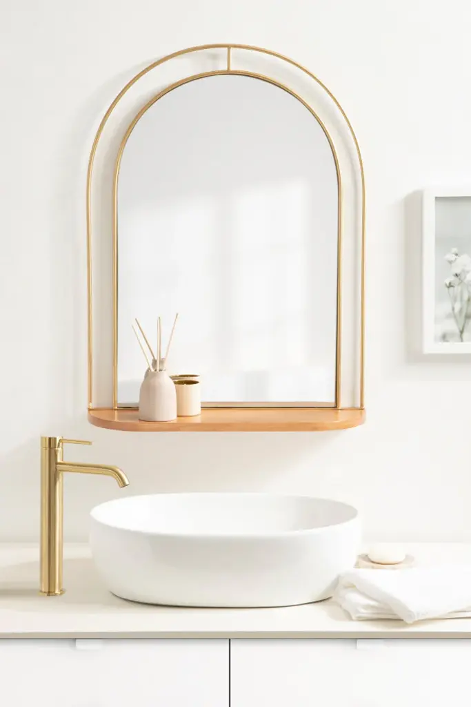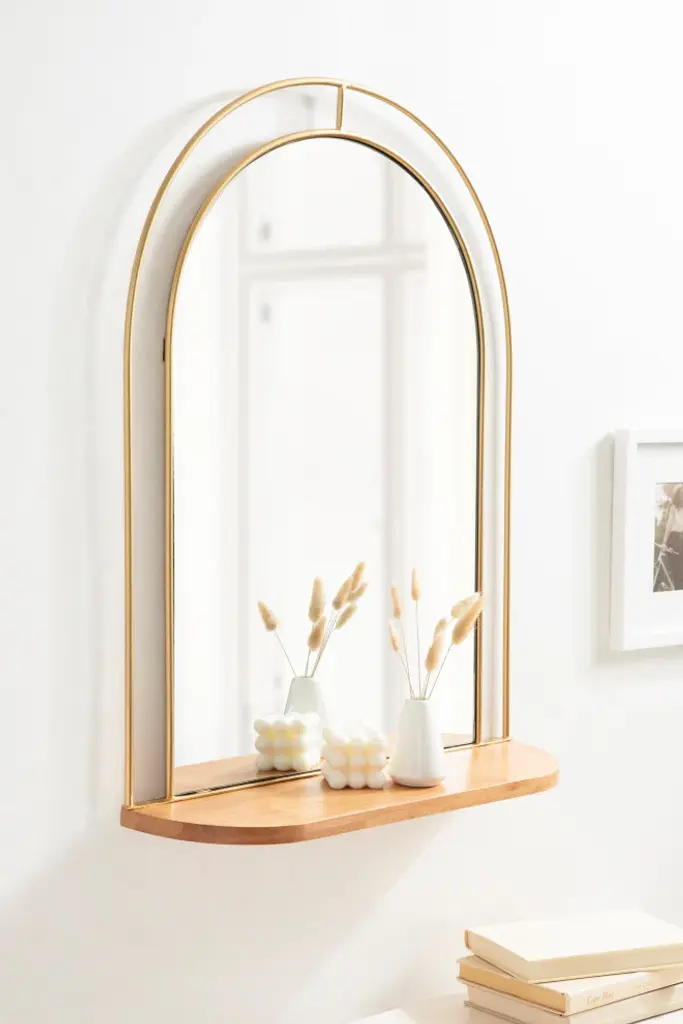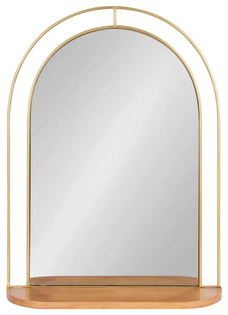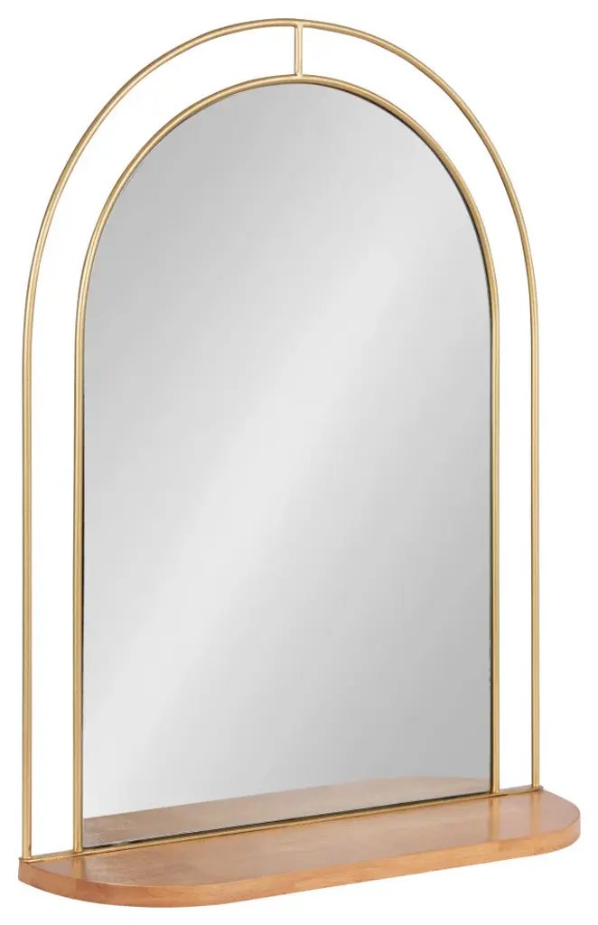 The Reverie wall mirror is an excellent way to refresh your home with elegance and vibrancy. Designed with a high-quality, metal-forged iron frame, the Reverie creates a dynamic focal point on your wall while elevating the quality of your decor with its premium construction. The glamorous, elegant gold finish and sophisticated double-arched frame create a transitional and symmetrical style. In addition to being a robust, beautiful wall mirror, the Reverie also features a small yet functional display shelf, featuring 5.5" of depth and 22.25" of width. The size of this shelf makes it excellent for storing and displaying little soaps, lotions, toiletries, spices, or small decorative items like photos or succulents. As a practical piece of wall decor, the transitional style of the Reverie wall mirror looks excellent in any contemporary living room, bedroom, entryway, dining room, or kitchen. It is particularly suitable as a bathroom mirror above a sink in a powder room or a master bath. This mirror is ready right out of the box and hangs in seconds with sturdy metal keyhole hangers attached to the back of the frame.- Modern Design: This wall mirror has a decadent double arched shape with a beautiful gold finish on the frame to exude style and glamour- Quality Material: The Reverie has a robust forged iron frame with clean mirrored glass and a protective MDF back for a lasting look and construction- Large Size: The overall display dimensions of this beautiful modern farmhouse mirror are 22.25" wide by 30" tall and 6" deep, creating a robust statement piece for any living space- Additional Shelf: The Reverie has a shelf that is 5.5" deep and 22.25" wide, providing plenty of room for small lotions, soaps, photos, and small succulents- Easy to Hang: This robust wall mirror hangs in a matter of seconds with convenient, sturdy keyhole hangers attached to the back of the metal frame