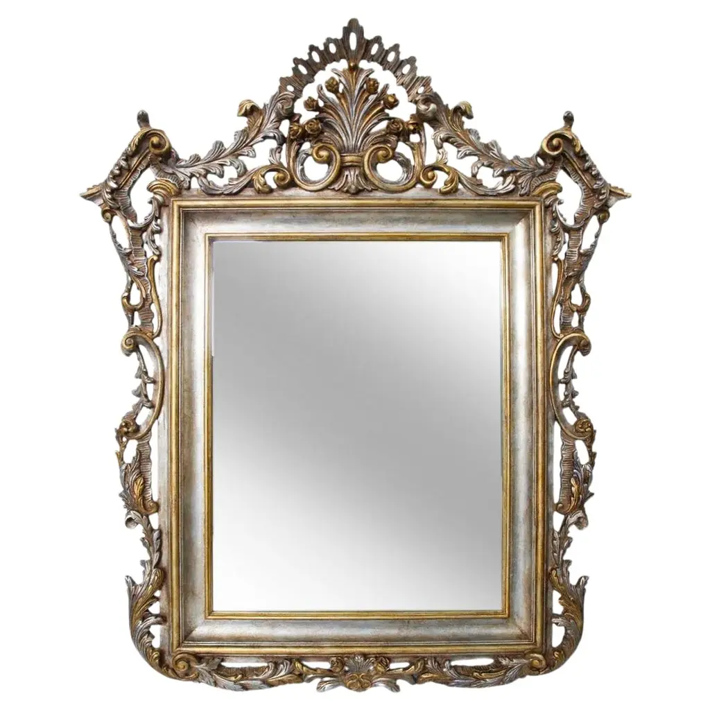 This splendid wall mirror is a modern take on the opulence of 17th-century French courts. Set in a marvelous wooden frame boasting an intricate classic Baroque-style design accented in antiqued silver leaf, the rectangular mirror is distinguished by beveled edges. Designed to be freely hung both vertically or horizontally to taste or suit a specific interior.