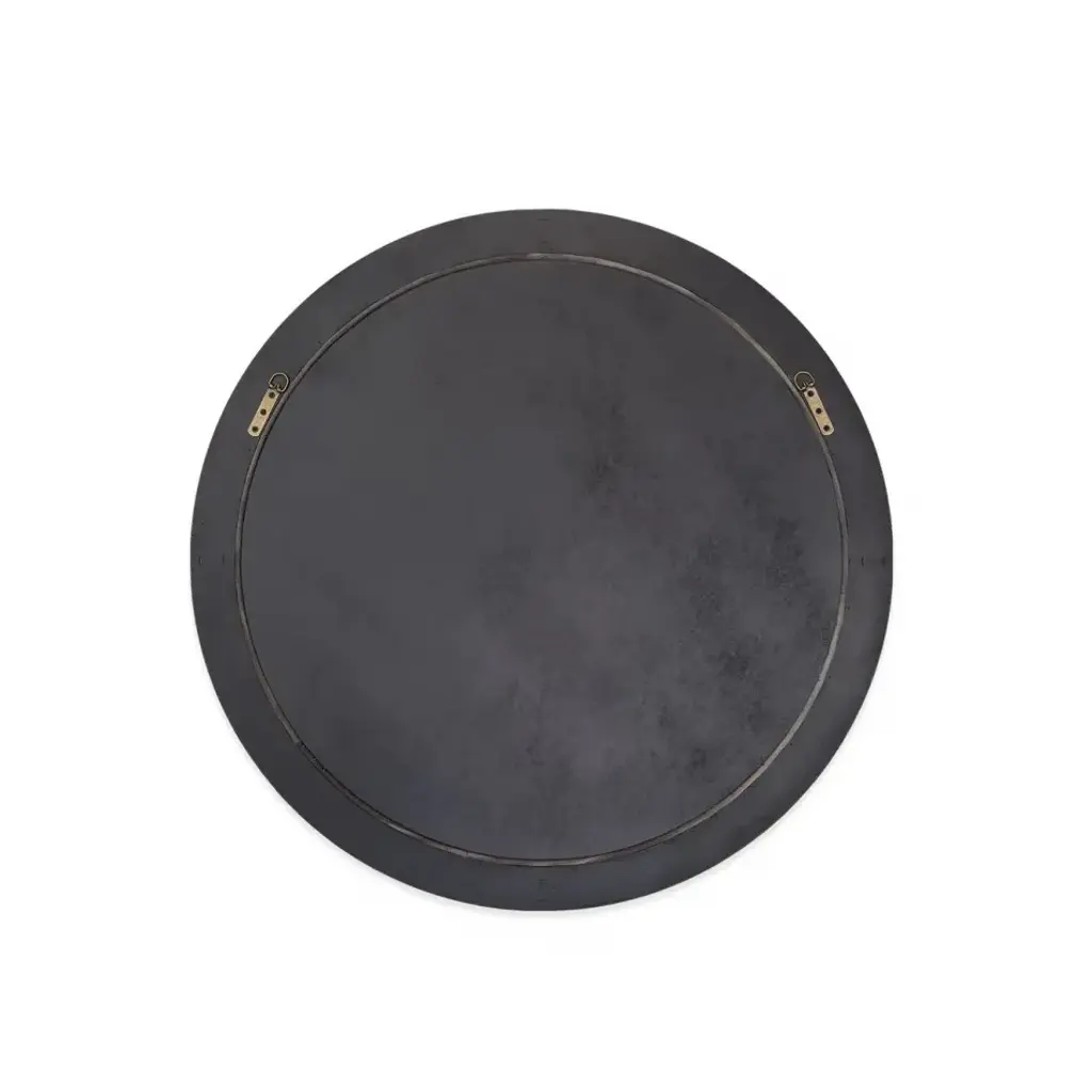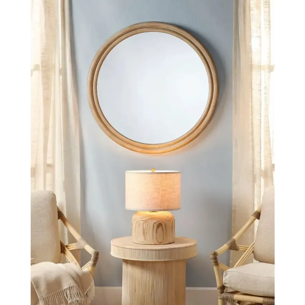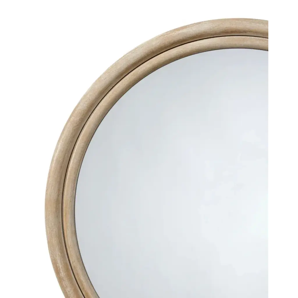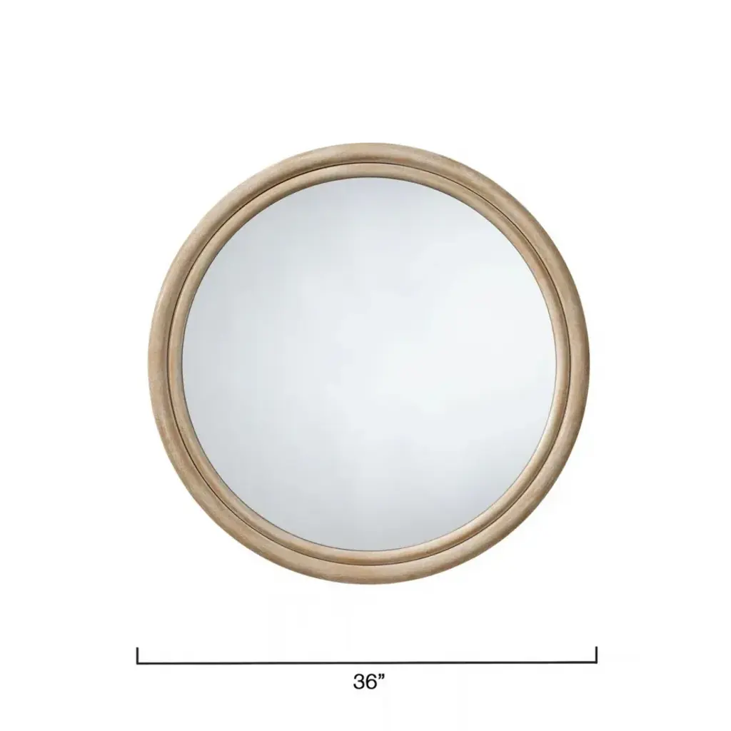 Ideal for enhancing dimensionality in a gallery wall, this round mirror features a handcrafted frame of minimally finished wood. With a generous diameter of three feet, its unique double-banded design and meticulous construction elevate its sleek, simple lines.